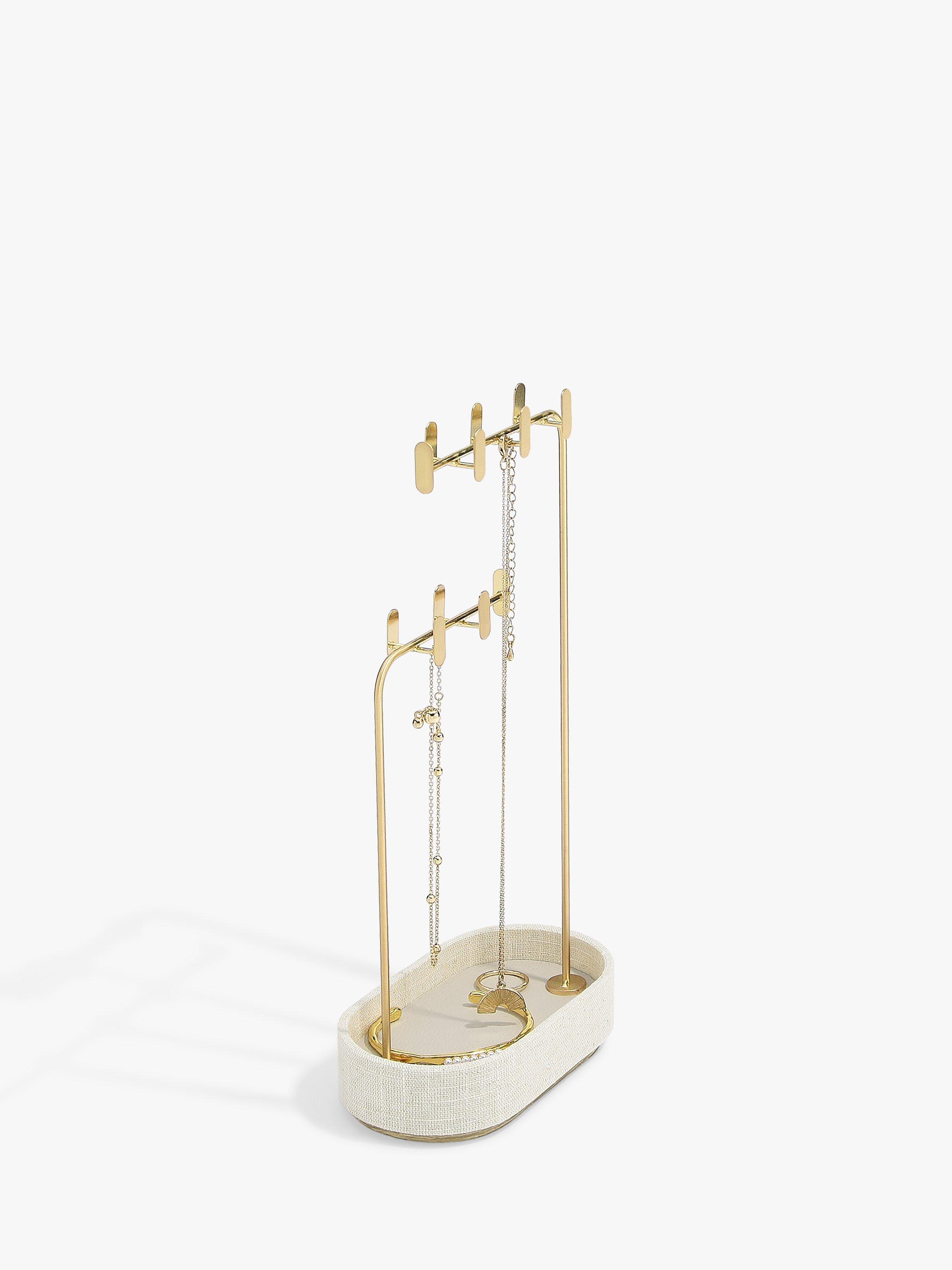 The Oatmeal & Linen All-In-One Jewellery Stand is ideal for displaying your everyday jewellery collection. With a section at the back with 5 hooks for necklaces, as well as 3 shorter hooks for bracelets. Underneath there are 2 bars for hoops, huggies and statement earrings. The base offers additional storage with a built-in ring roll for rings and stud earrings, in addition to sections for other trinkets. A perfect neutral addition to your dresser or bedside, with a mix of Oatmeal PU and soft linen effect. With brushed gold fixtures.