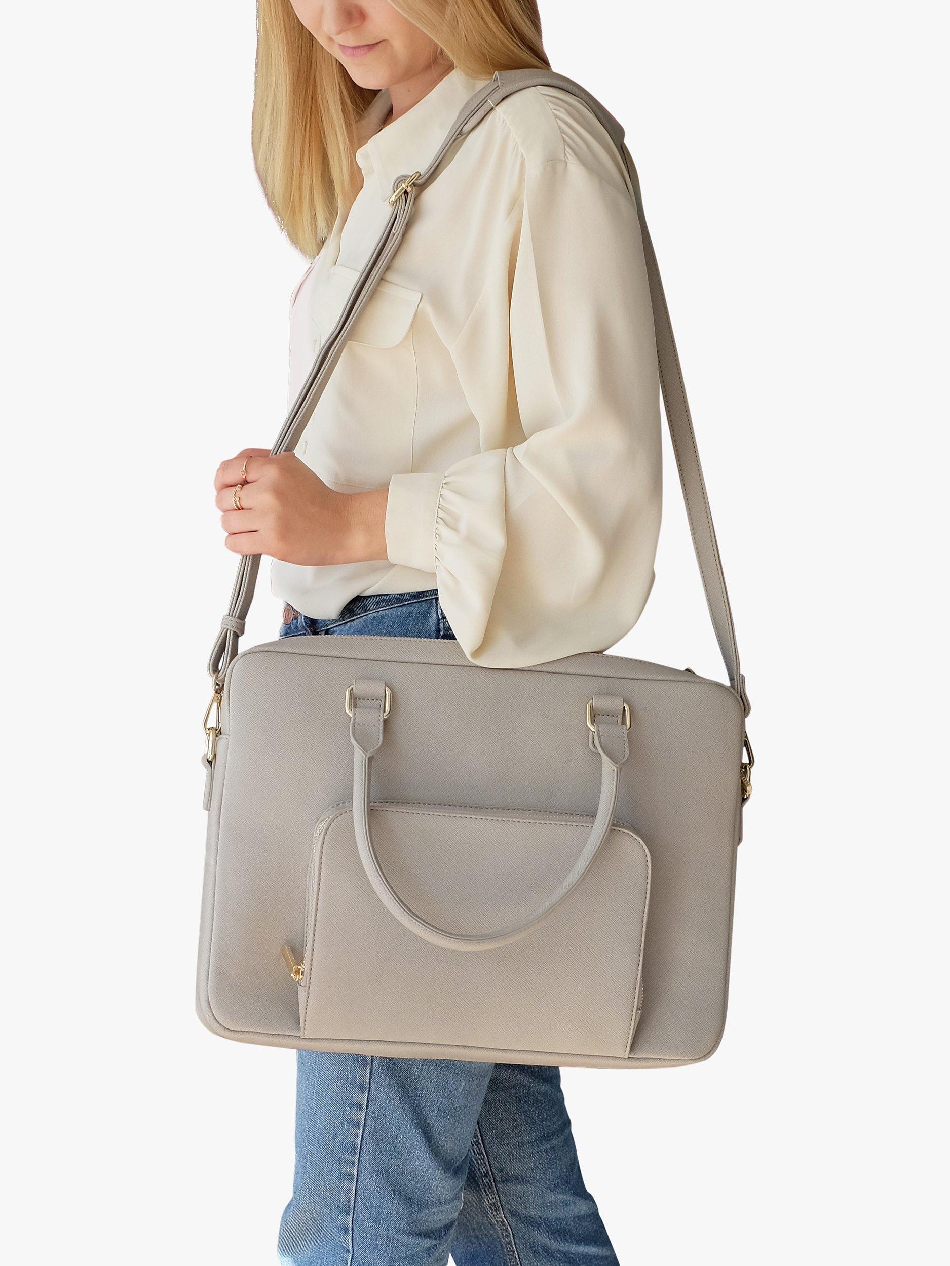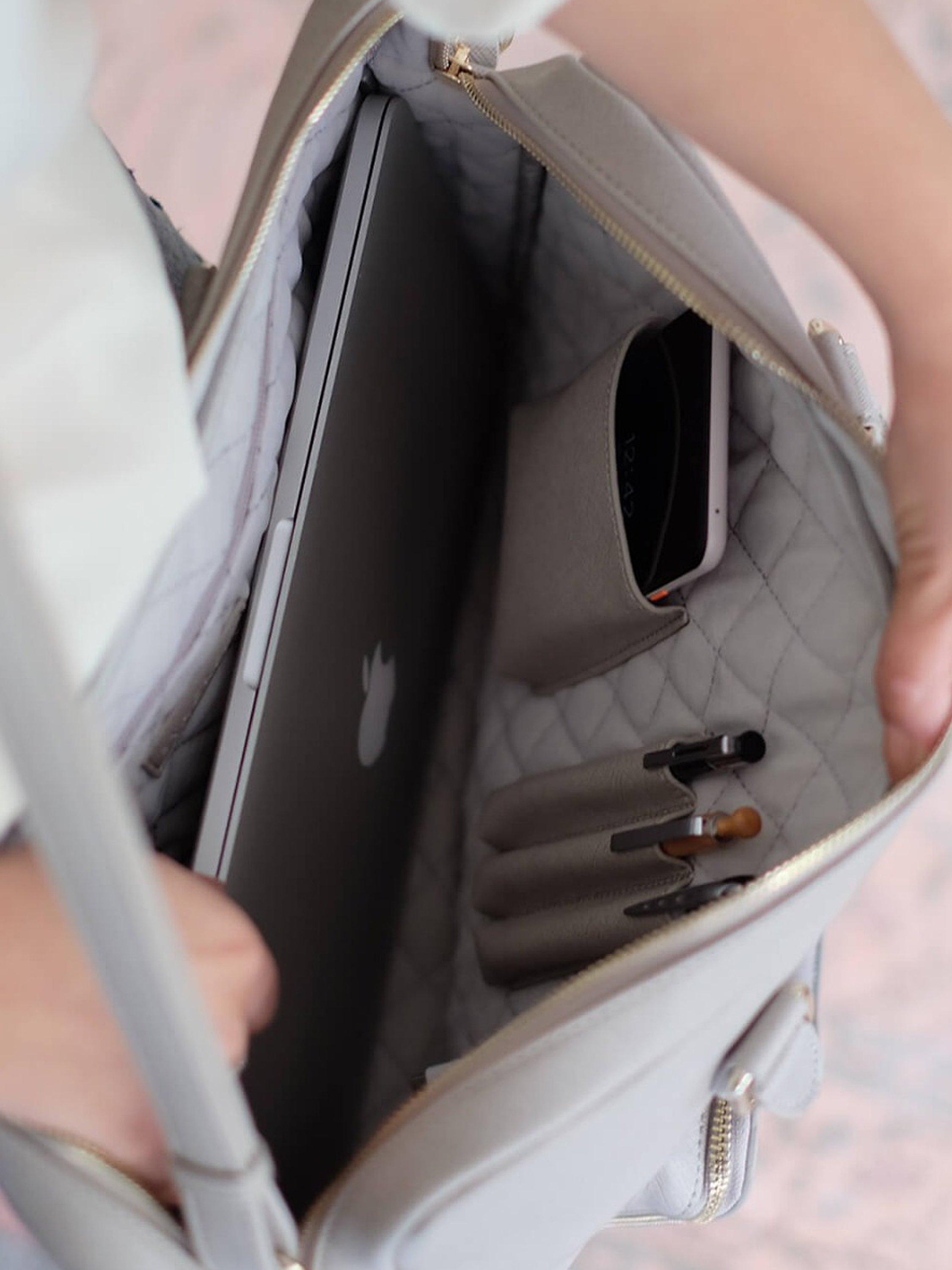 Calm the commute chaos. The ultimate from work to evening bag with the functionality to be worn as a backpack, handbag or a shoulder bag. The multi-wear laptop bag is made with a faux leather exterior and a soft velvet padded lining to ensure your laptop stays safe whilst on-the-go. With space inside for your laptop (up to 15 inch), your phone, multiple pens, cables as well as a large zipped pocket, this bag is not only stylish but super practical. At the front there is a large zipped pocket for your charger, additional cables and accessories and a smaller zipped compartment at the back. Level up your everyday.