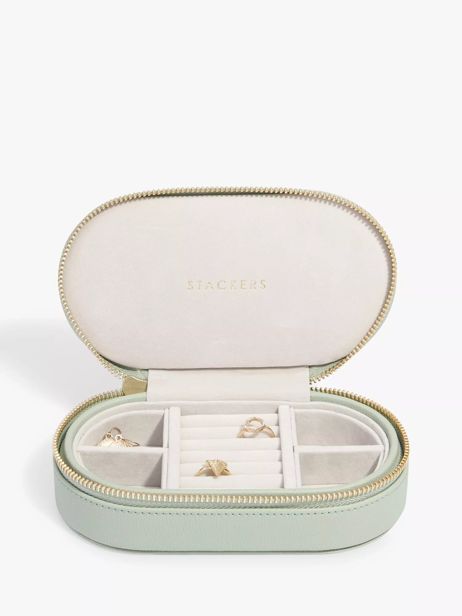 This beautiful Stackers oval travel box features 5 compartments for your keeping your most precious jewellery safe and sound when travelling.