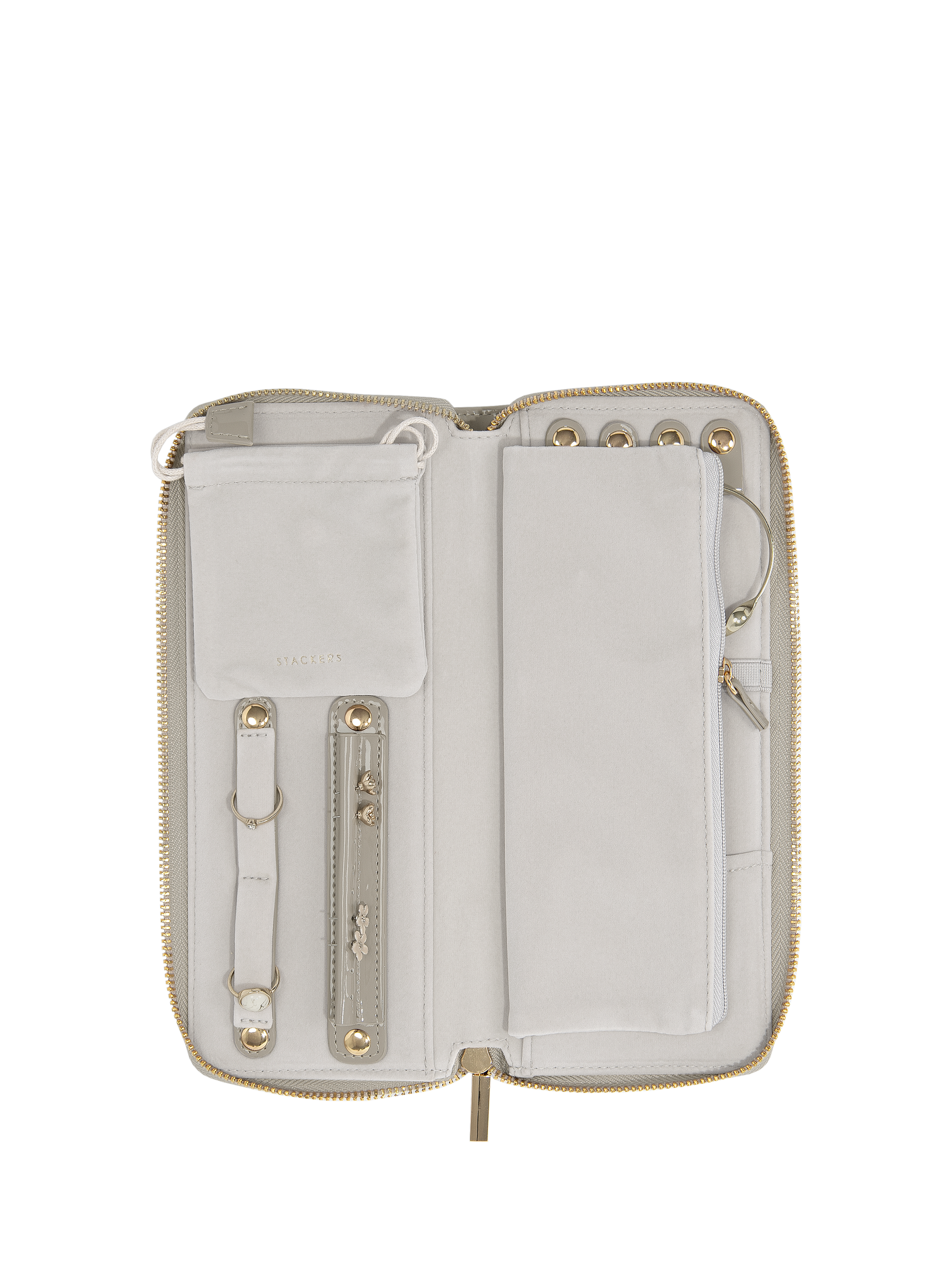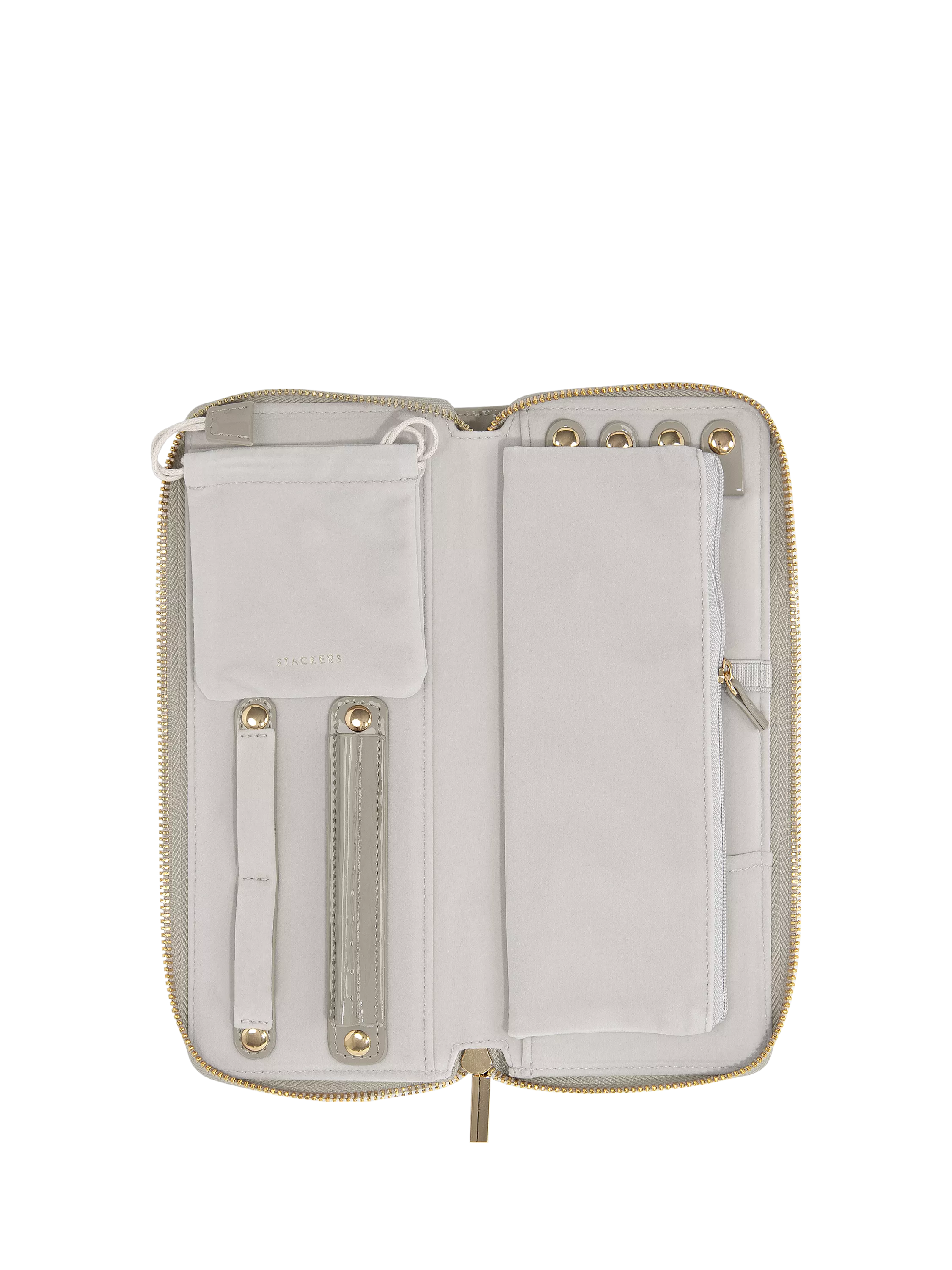 Stay organised with the Stackers Jewellery Roll. With space for up to 4 necklaces or bracelets, an earring holder, ring holder and a small velvet pouch to house any loose items, it's the perfect travel companion.