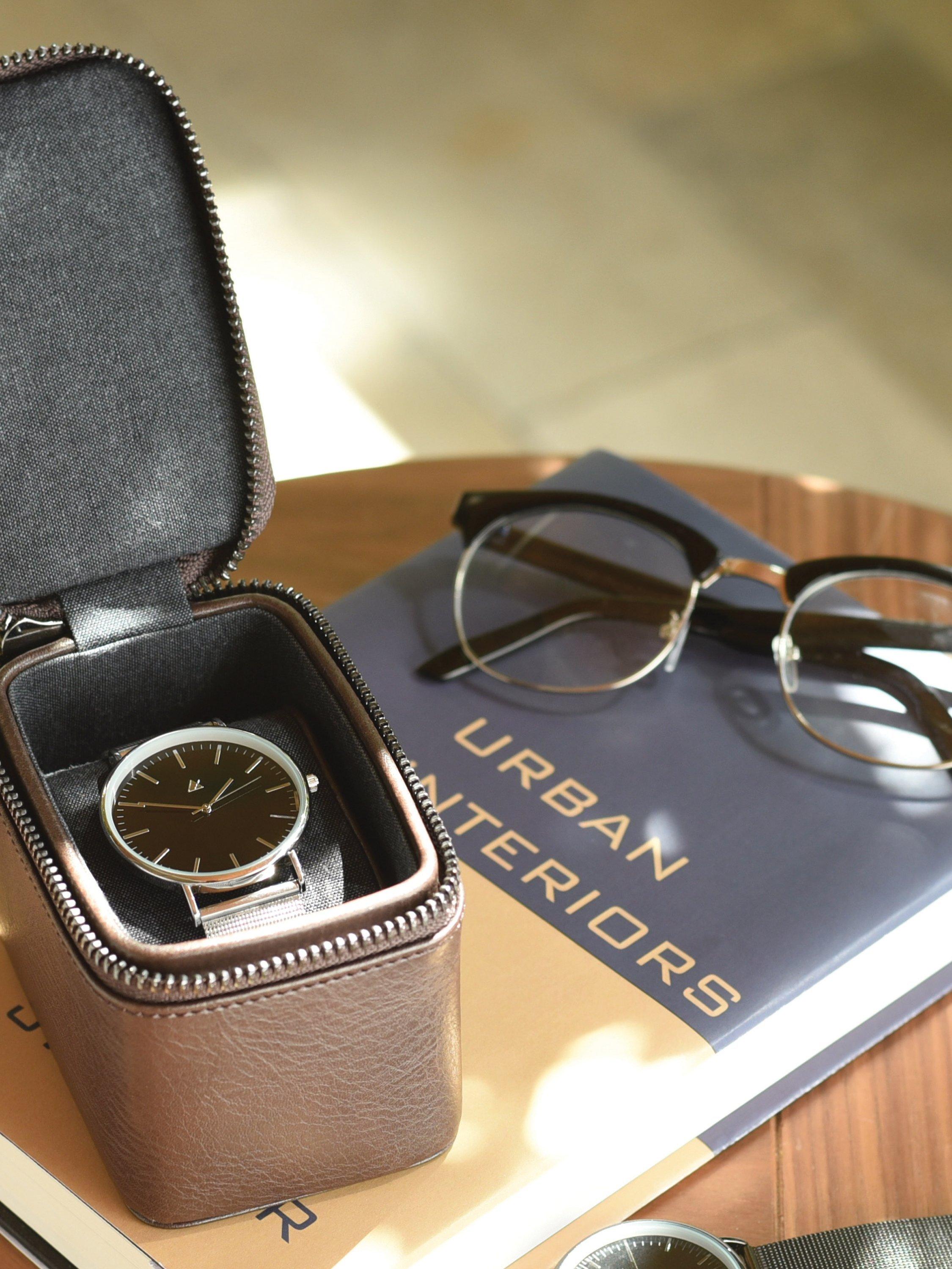 A soft padded exterior and fully lined interior with removable watch pad. Zips securely closed with stylish gunmetal finish fittings.