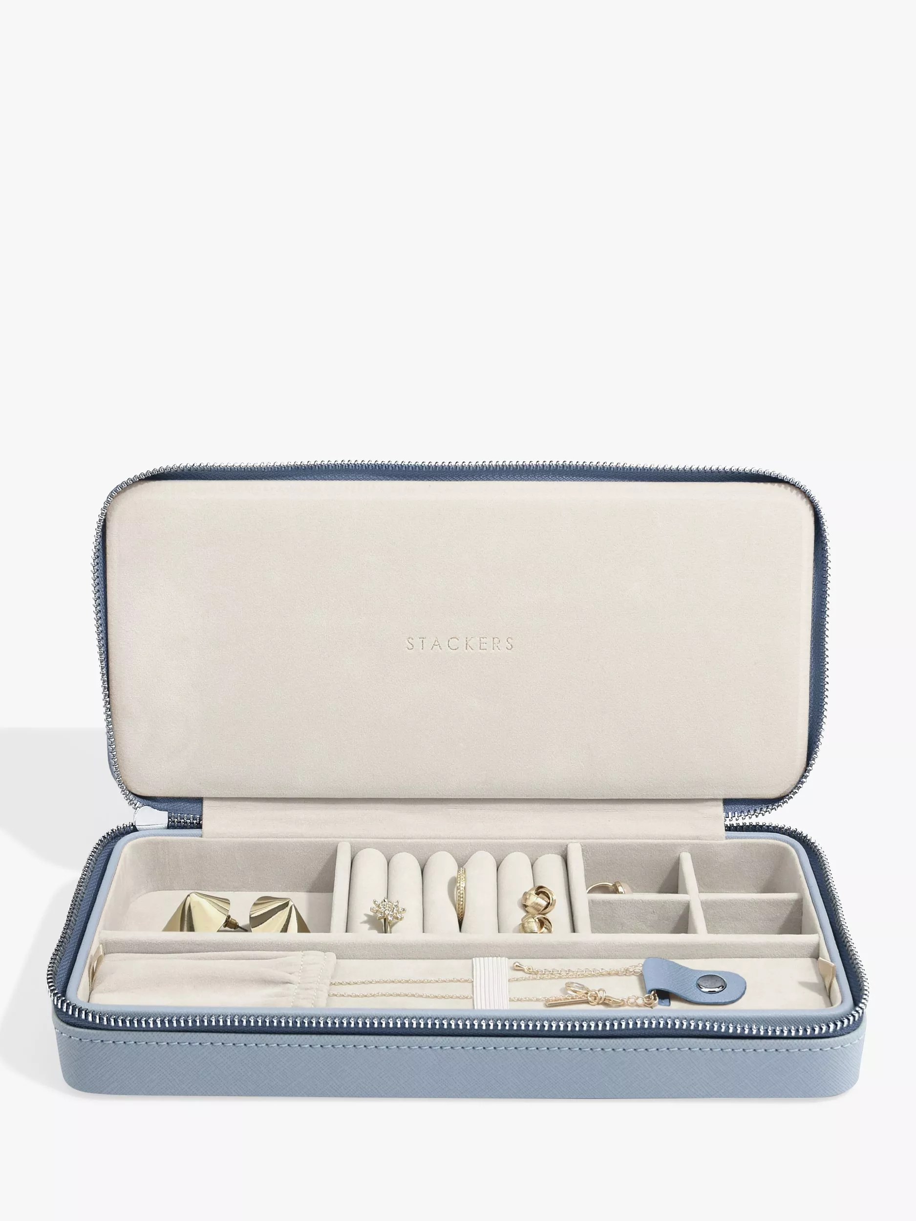 This beautiful Stackers necklace travel box features 7 different compartments with a removable necklace storage insert
