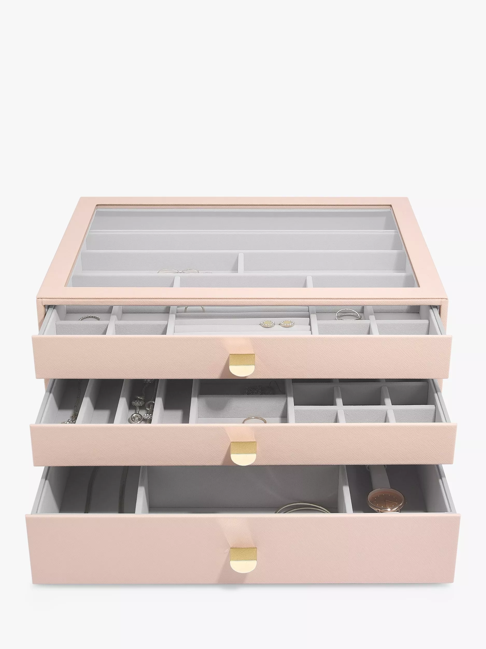 There'll be no excuse for your favourite jewellery to be anything other than tangle-free and organised! The Supersize Drawer Set of 3 is ideal for almost every jewellery collection. With plenty of space to keep your necklaces, rings, earrings, watches and more, beautifully organised and safe. Featuring a clear glass lid for visibility and easy access to your favourite pieces. Whatsmore, you can easily add another jewellery drawer layer as your collection grows!