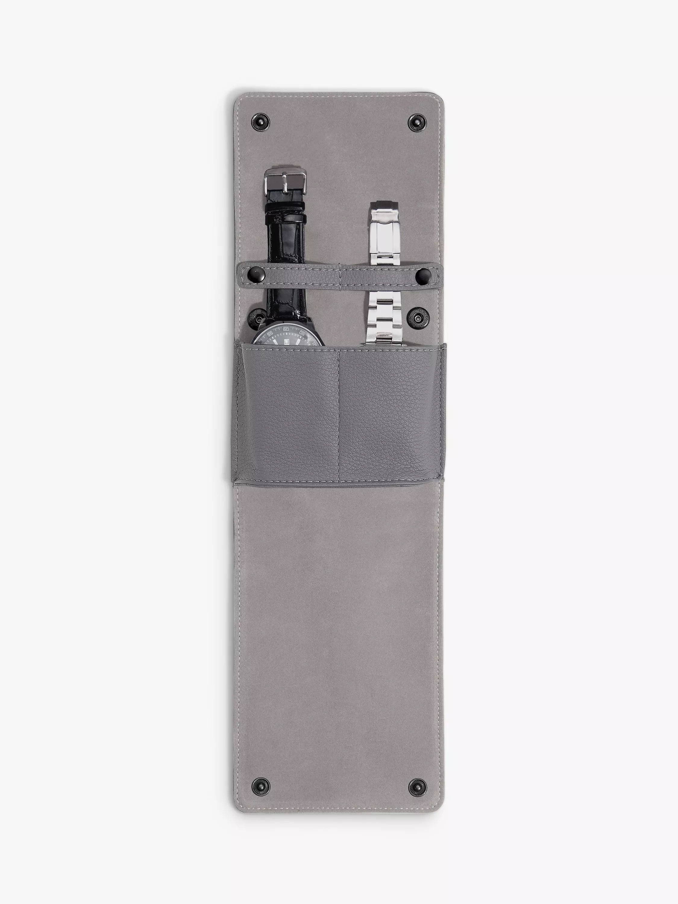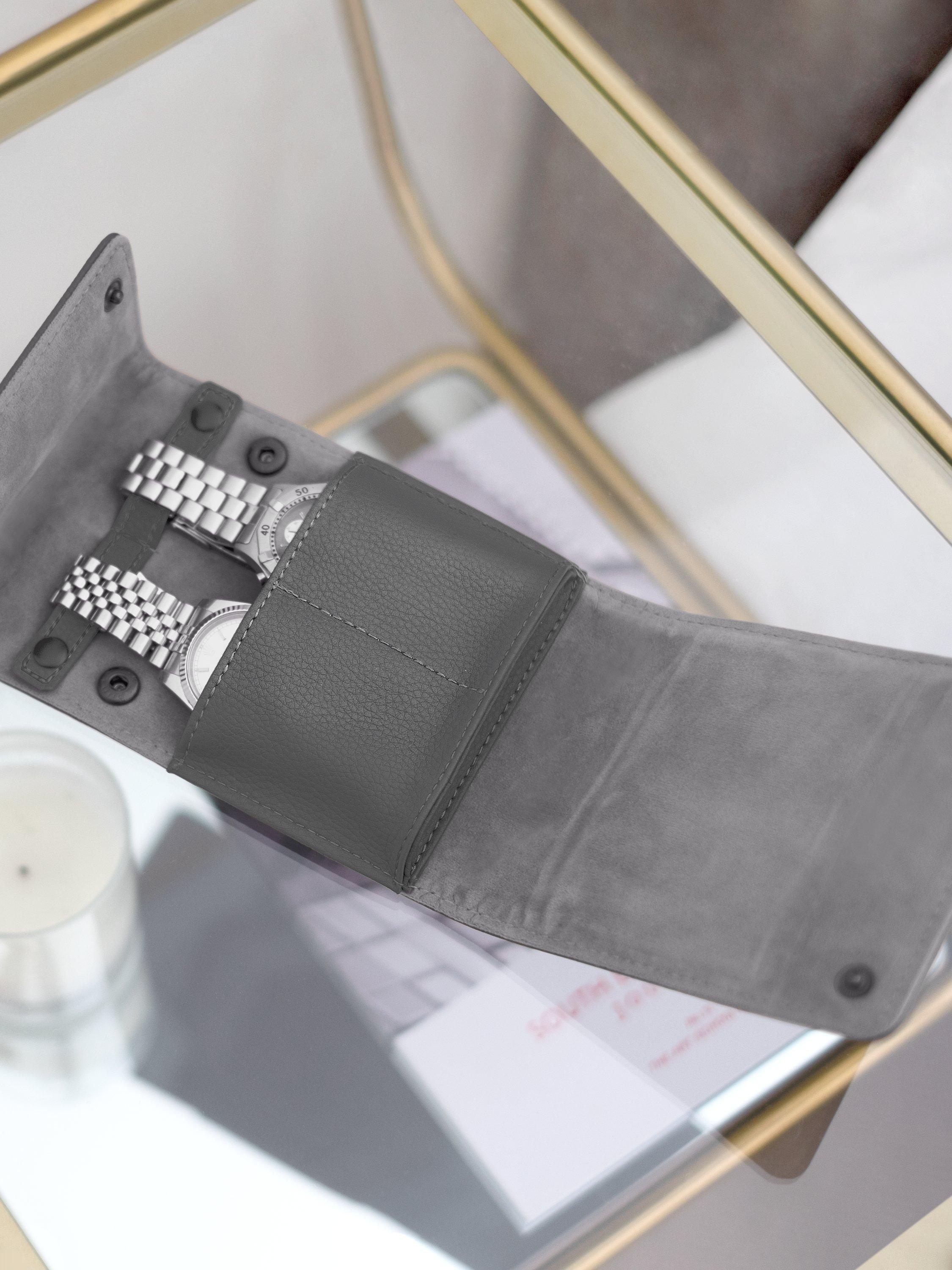 Travel made simple with the Double Watch Wrap. With a secure popper closure and soft velvet lining, the double watch wrap safely holds two watches, so you'll always have choices!