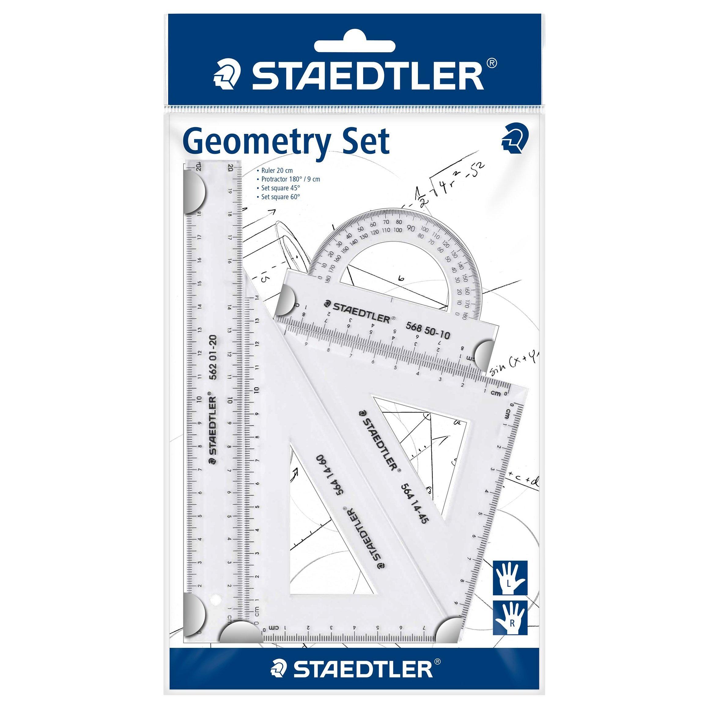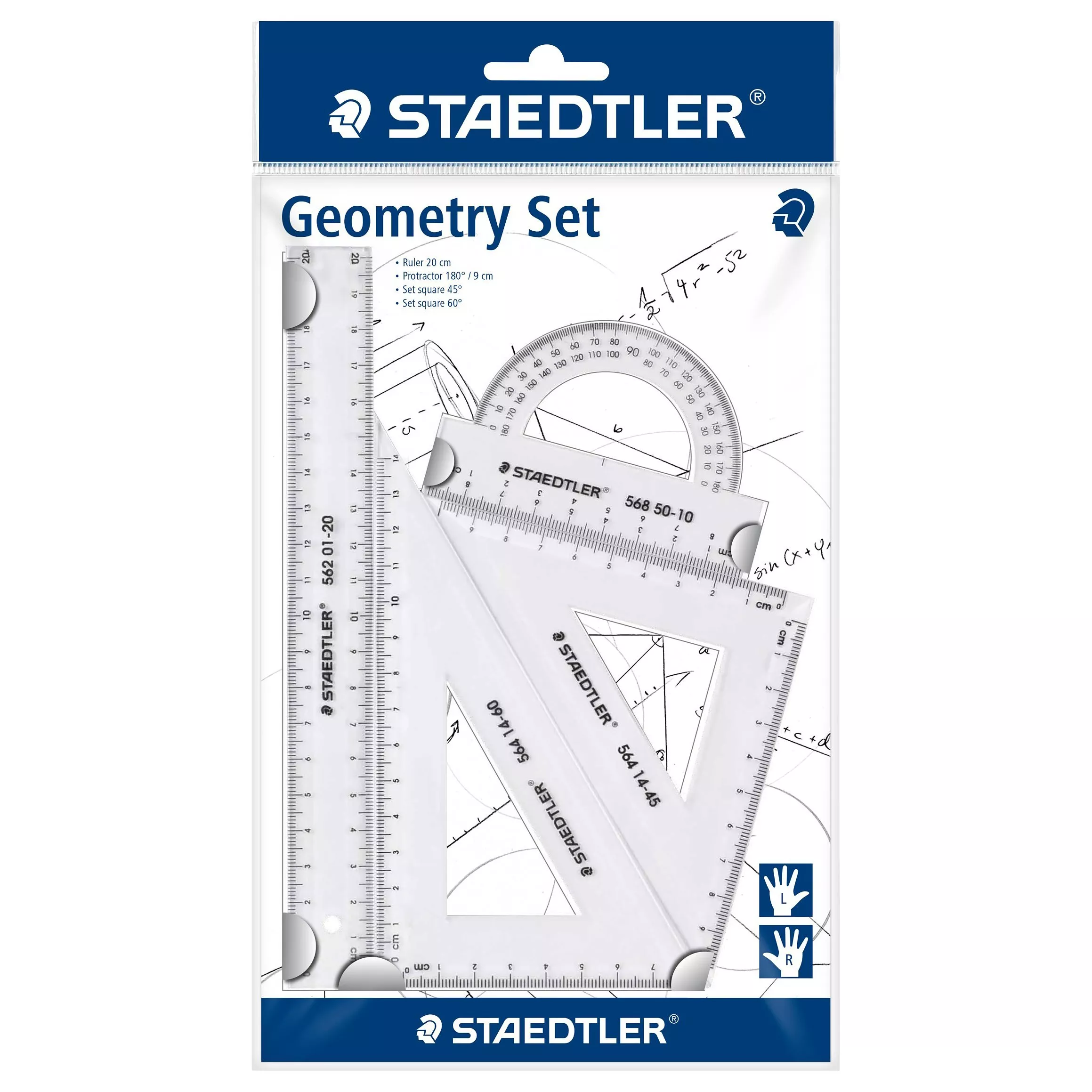 Handy Geometry set contains 4 transparent pieces: 20cm ruler, protractor, set square 60/30 degrees, set square 45/45 degrees in a hang-able polybag.
