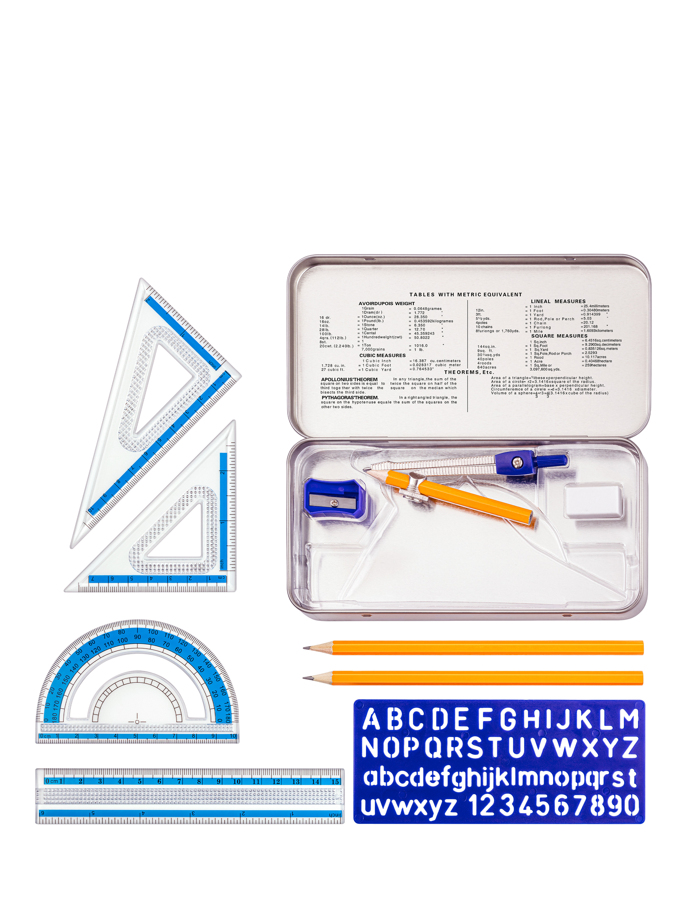 Pack contents: 1 x compass (max. 240mm diameter), 2 x HB pencils, 1 x plastic sharpener, 1 x eraser, 1 x 180° protractor, 1 x 15 cm ruler, 1 x 45° set square, 1 x 60° set square, 1 x lettering guide.
