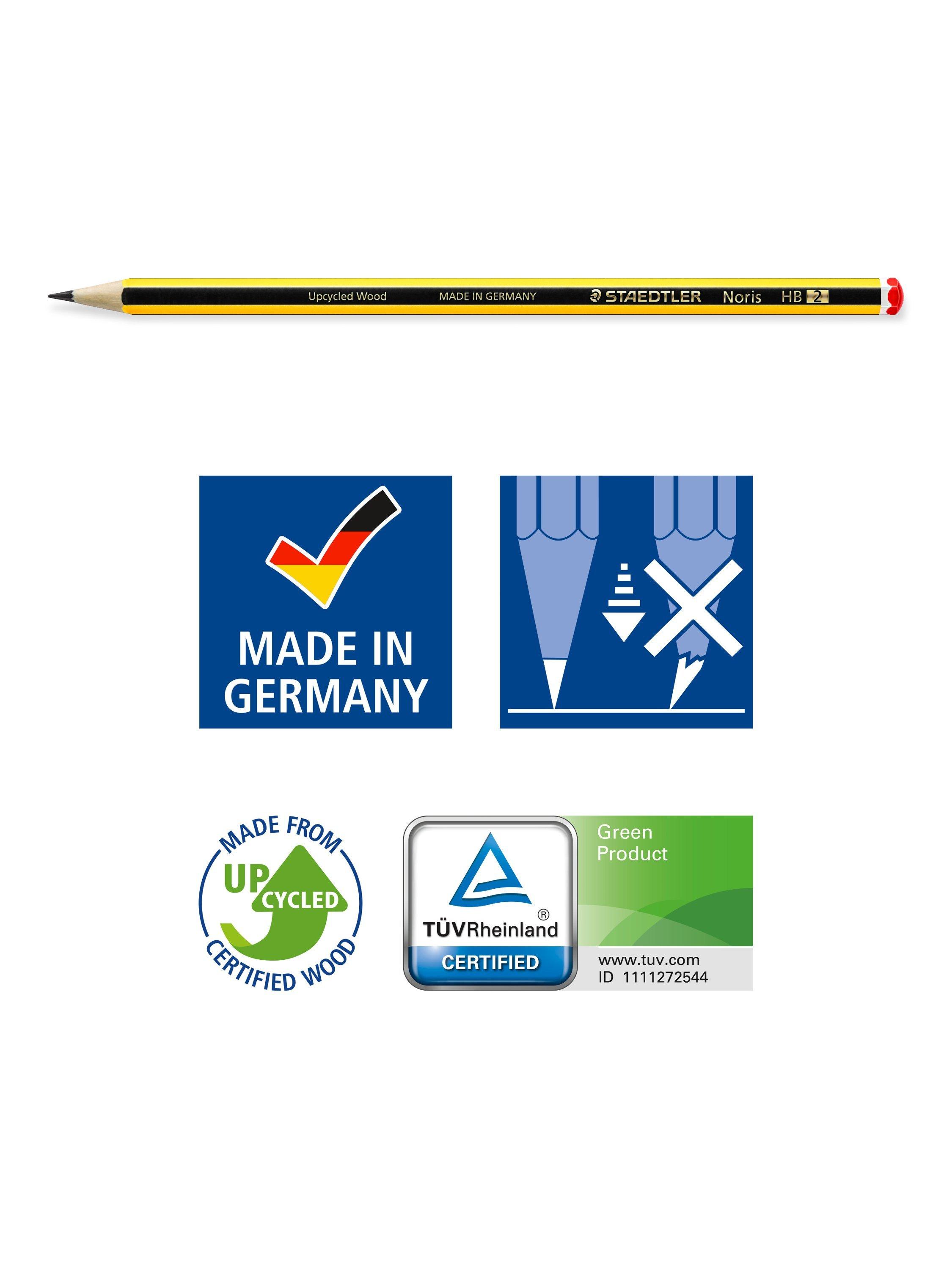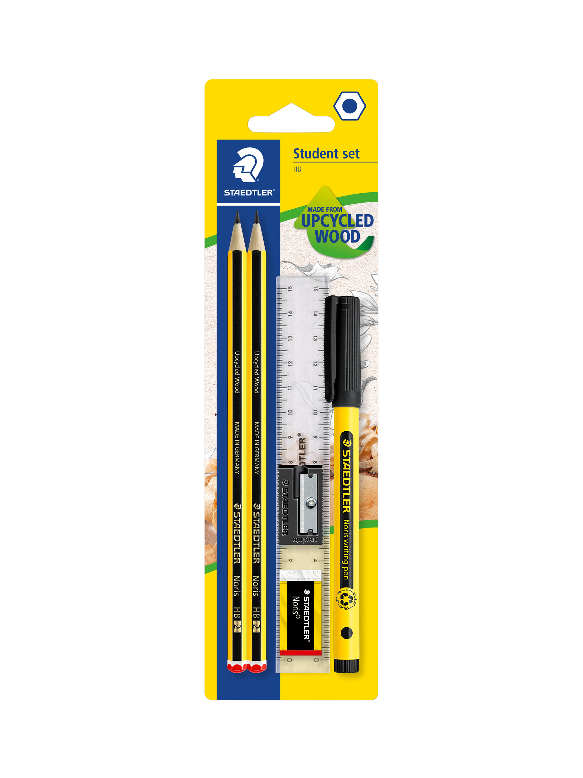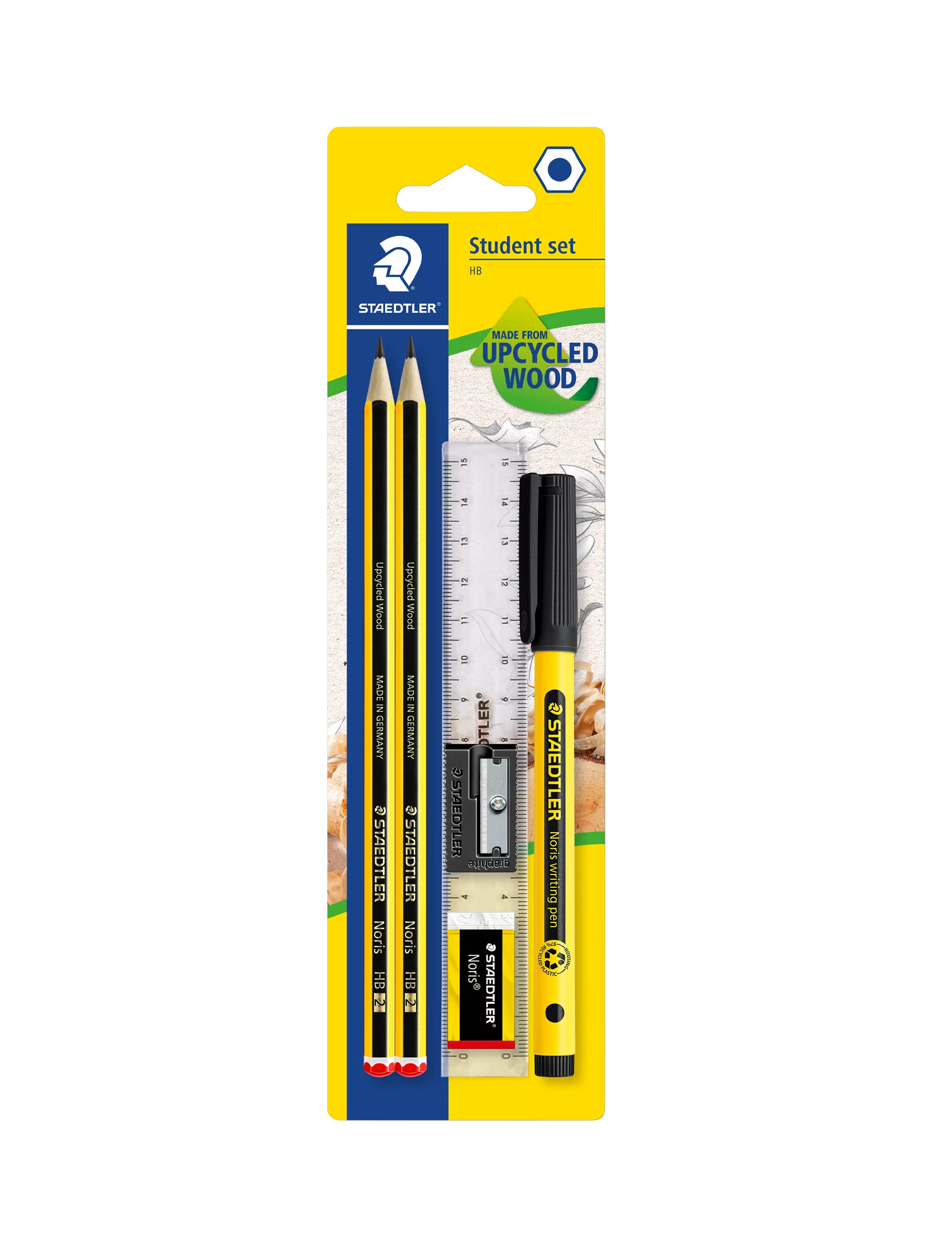This STAEDTLER student set including 2 high quality Noris HB pencils, a black Noris handwriting pen, a sharpener, eraser, and ruler is the perfect addition to your pencil case or desk.