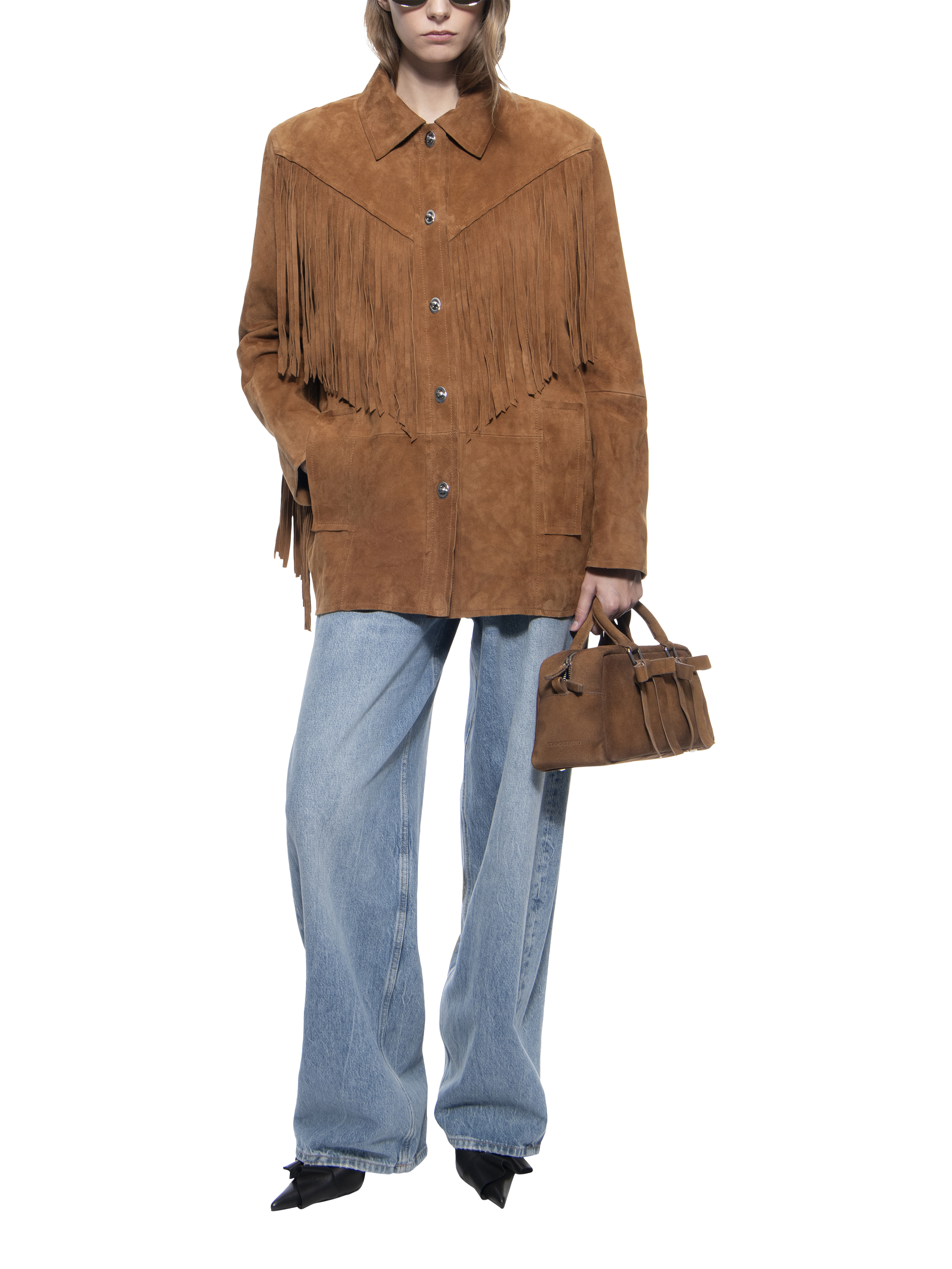The Estee Fringe Jacket is crafted in goat suede and designed for an oversized fit with wide shoulders. It features a twist lock closure at the front and fringe detailing across the chest and sleeves.