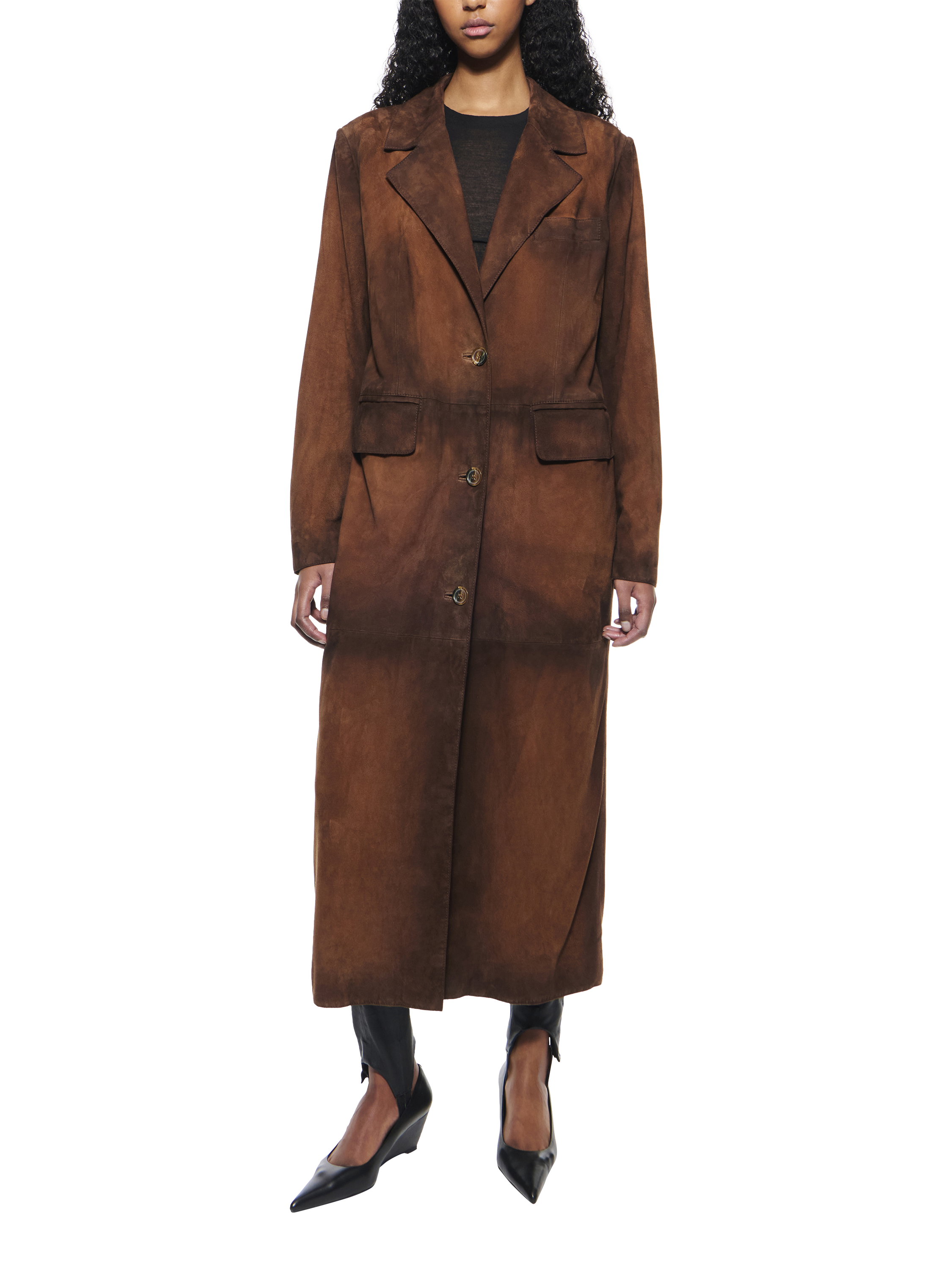 The Santara Coat is crafted in goat suede and designed for a straight silhouette. It features a buttoned front, notched lapels and flap pockets.
