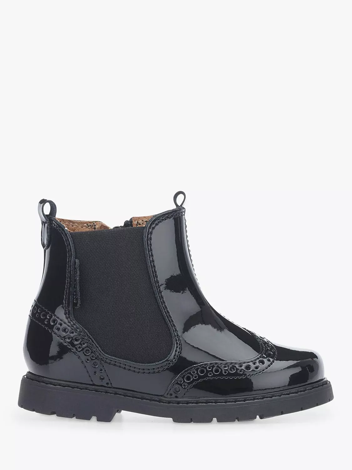 Enjoy this classic brogue detailing in a black patent finish and a durable sole. Perfect for day or night, a side-zip fastening and elastic side makes slipping on/off easy. Leather linings help busy feet stay fresh.