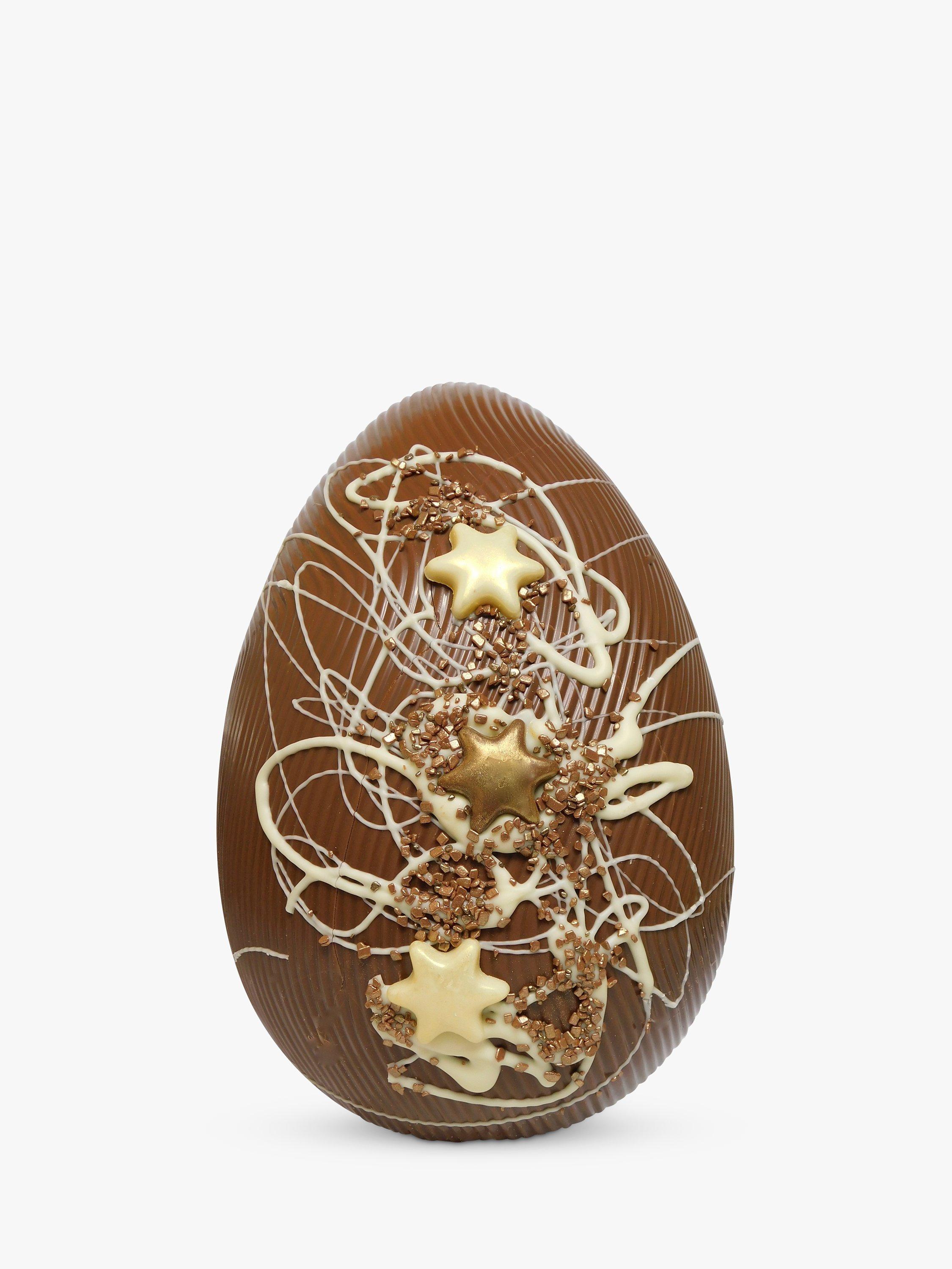 This spectacular Easter egg is decorated with swirls of white chocolate, chocolate stars and copper-coloured popping candy.