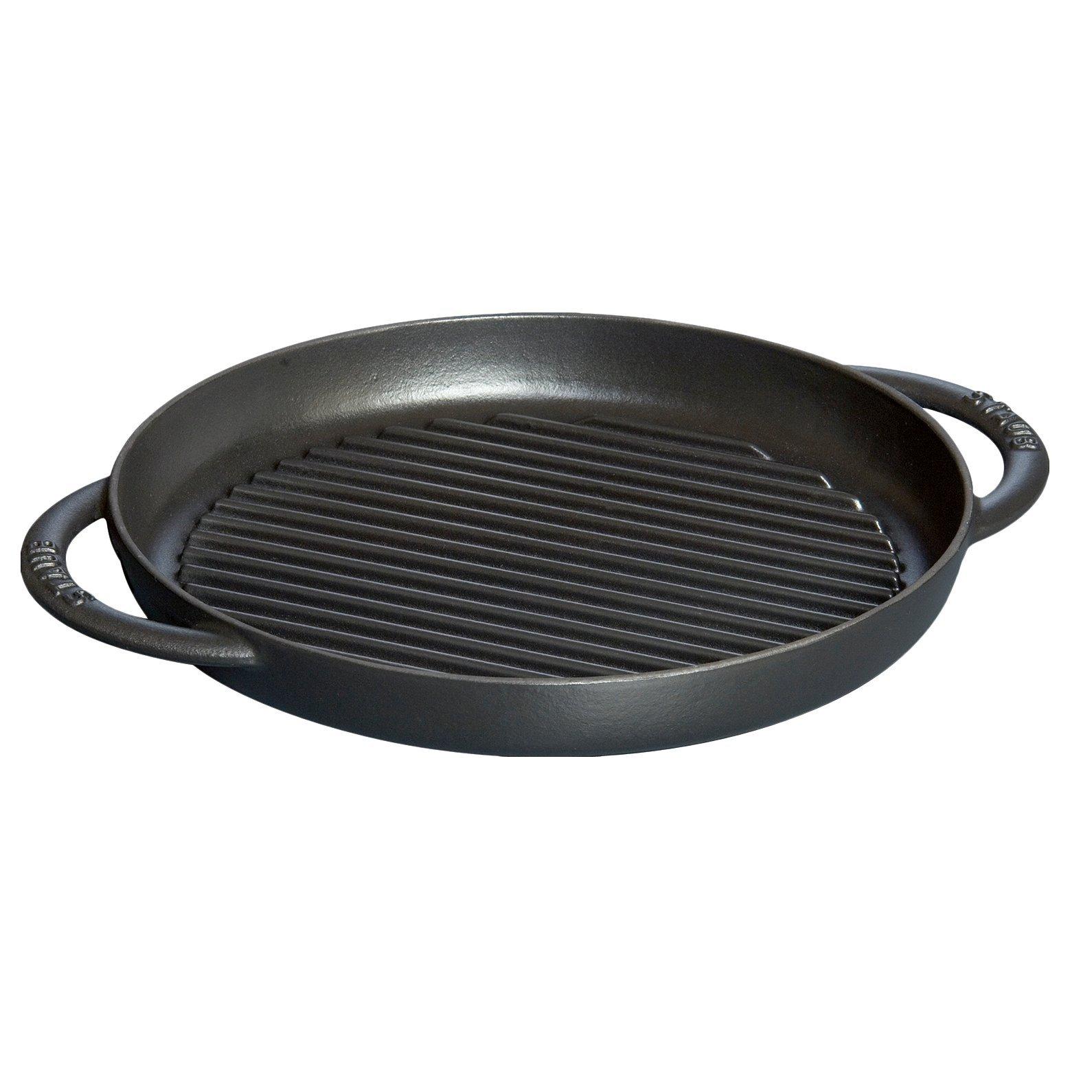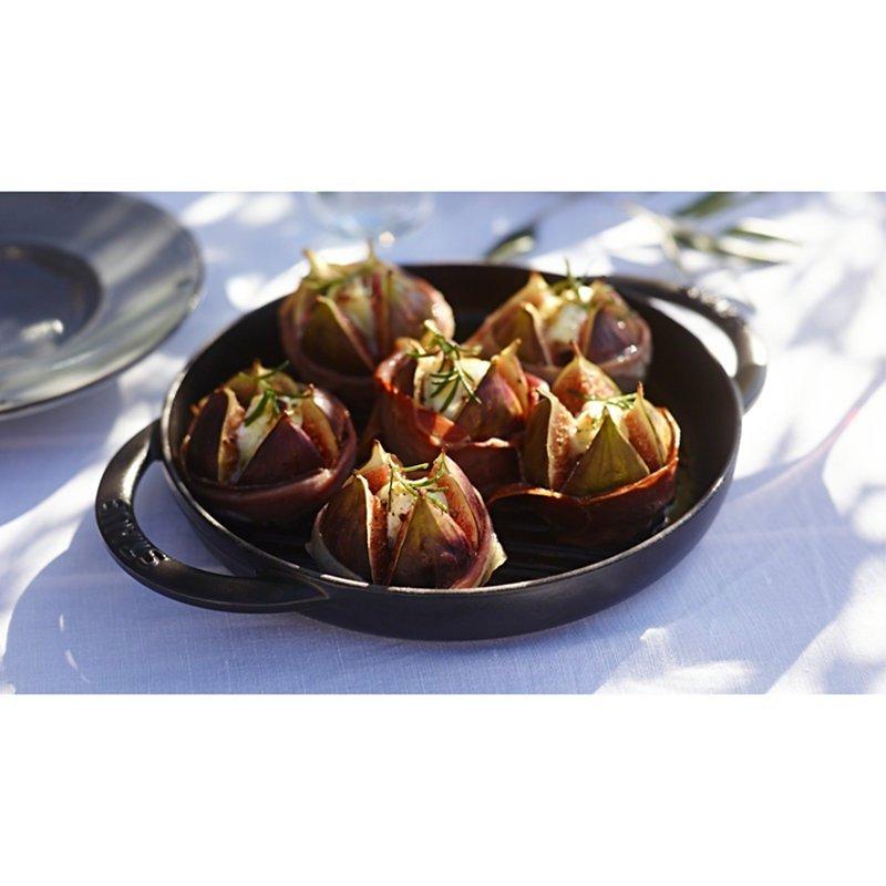 Perfectly sear meat, fish or vegetables, barbecue-style with the round grill pan from STAUB. Grooves in the pan leave patterned sear lines, just like on a barbecue. They also drain fat to achieve juicy and tender results while promoting healthier cooking.
