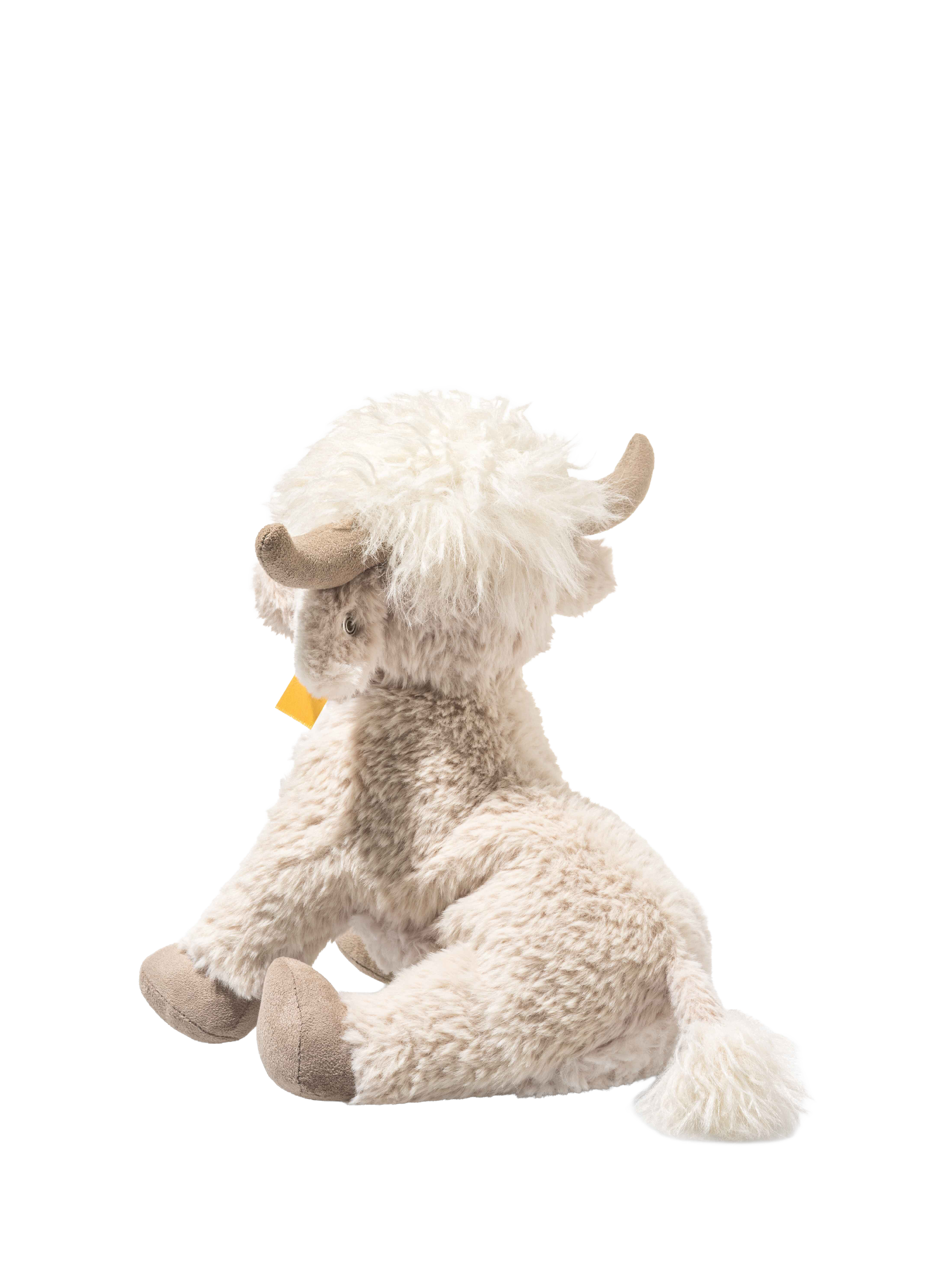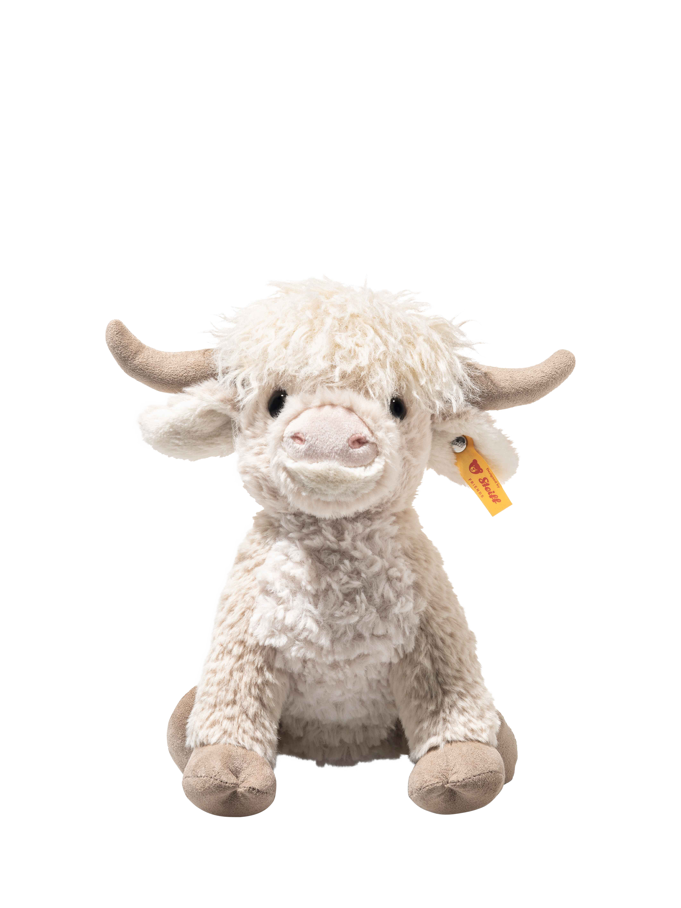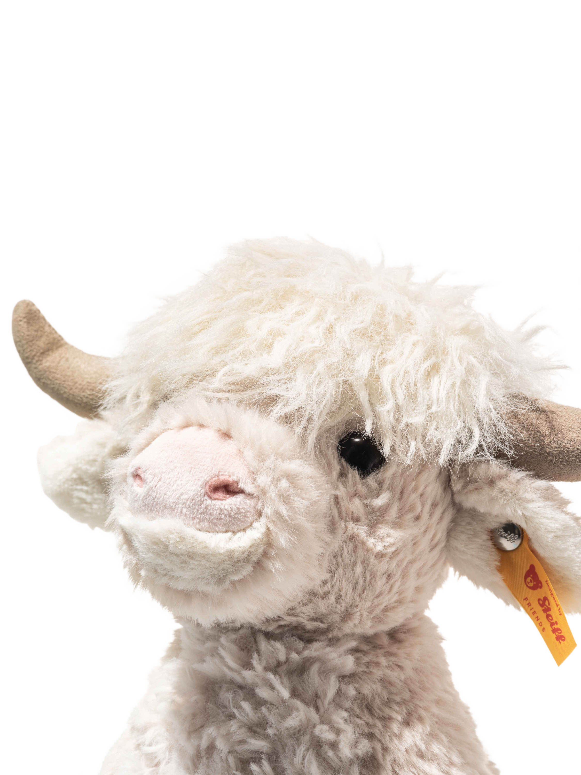 Harper Highland cow brings the spirit of wide open landscapes into the nursery and offers a comforting sense of security from the very first cuddle. Made from snuggly soft plush in gentle beige, with a long plush mane on her head, she has a charm all of her own. Her warm, affectionate eyes invite hugs, while a little bean bag in her bottom ensures she sits steadily. Measuring 24 cm, Harper is always ready for big and little adventures alike. And of course, she proudly wears the iconic Steiff “Button in Ear”.