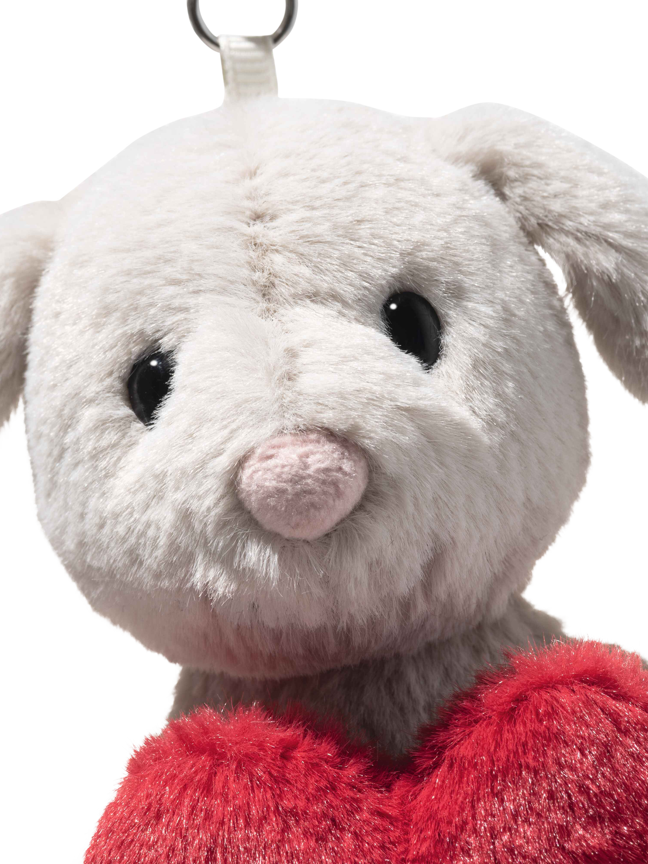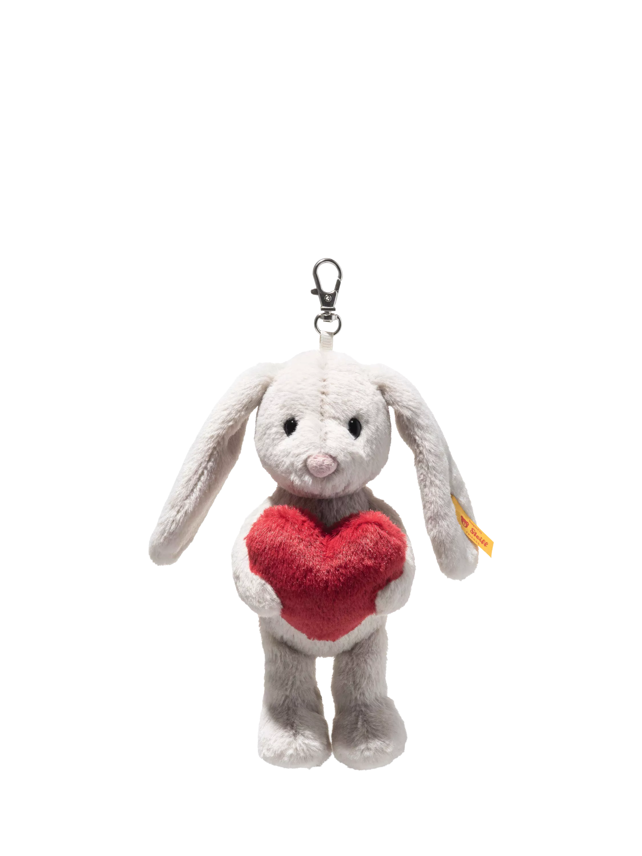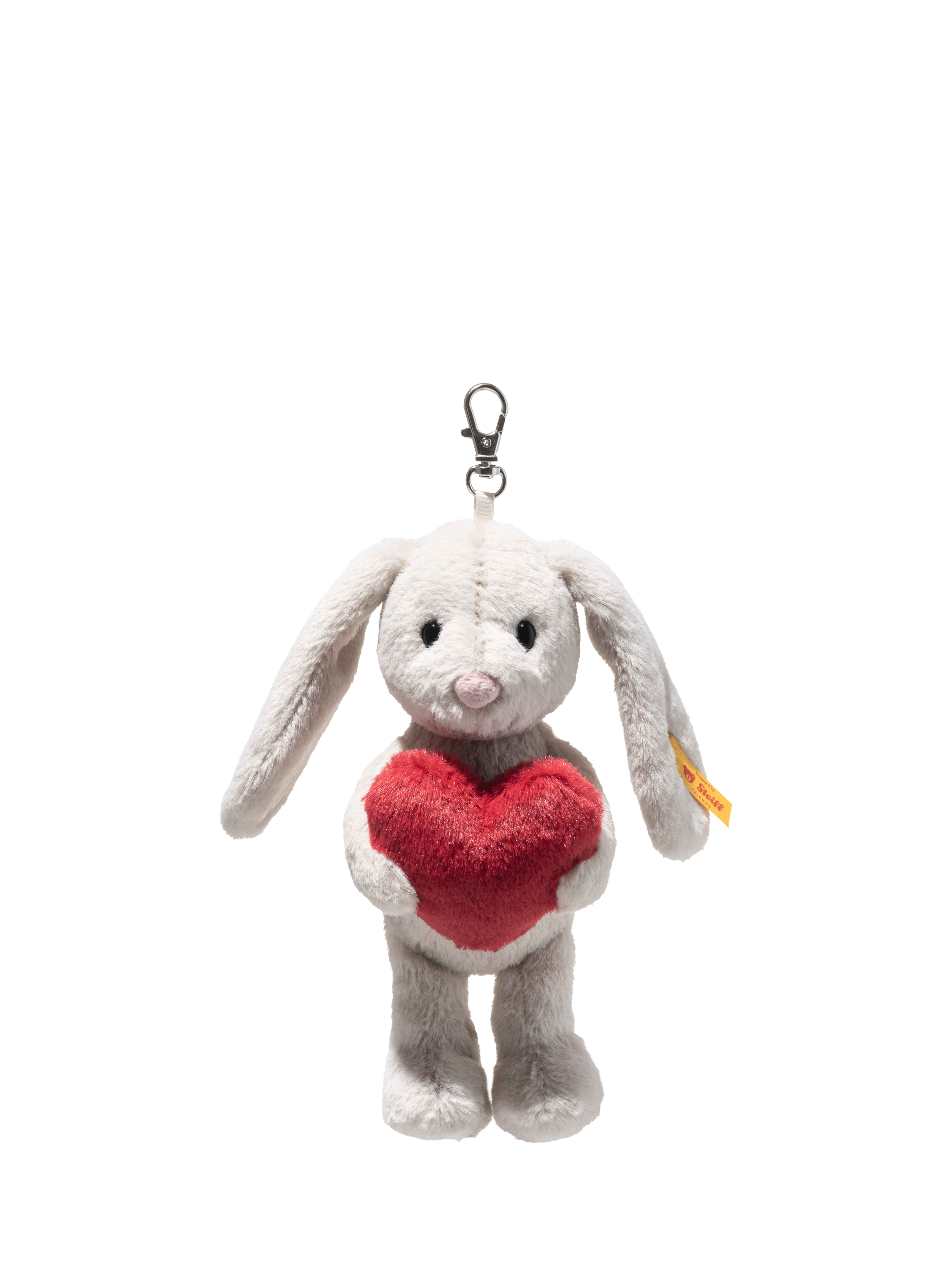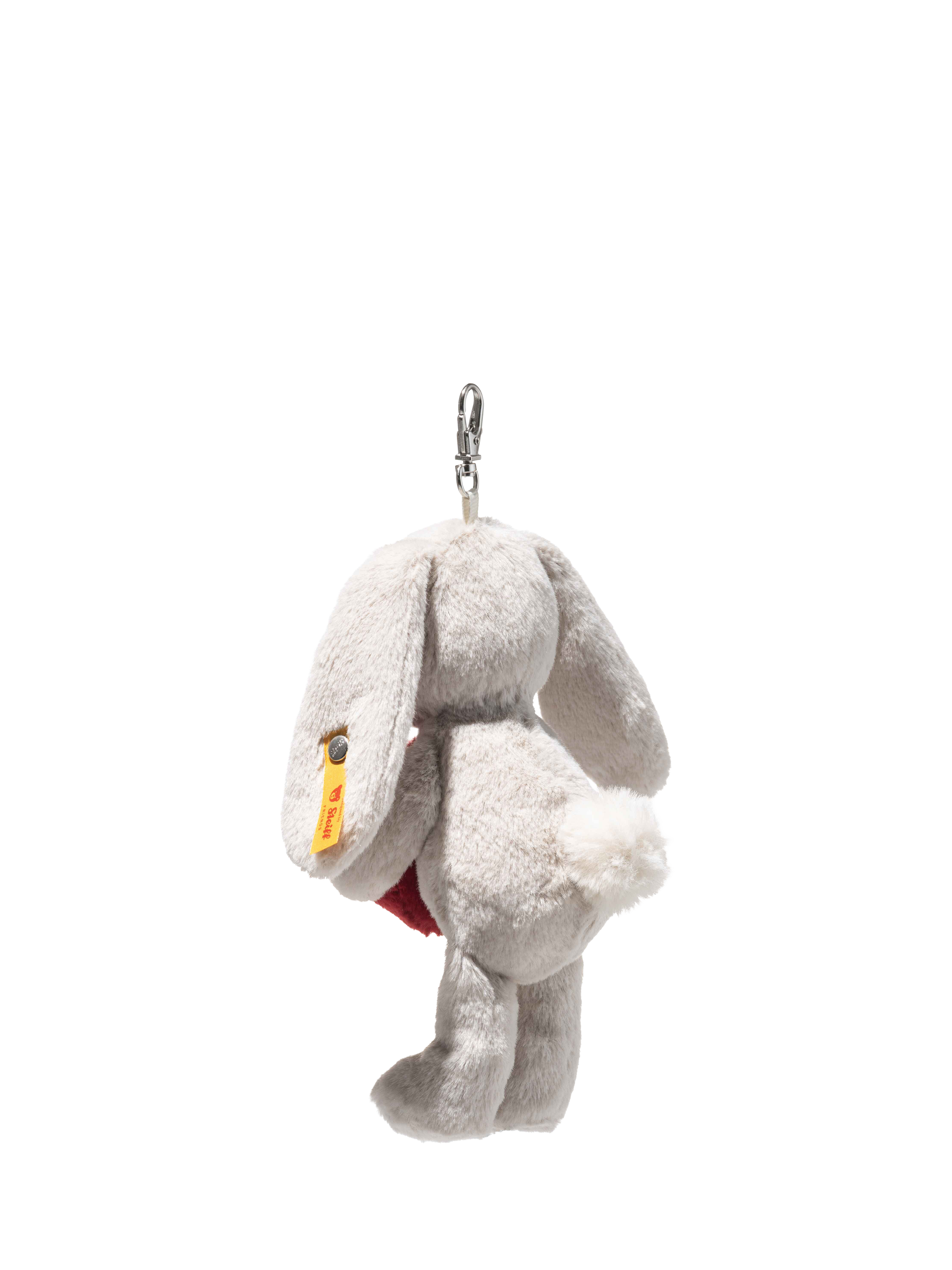 Small, sweet and always close by – Hoppie rabbit pendant brings a smile to every day. Whether clipped to a bag, keyring or school backpack, Hoppie is the perfect little companion who loves to be part of every adventure. Made from cuddly soft light grey plush, she clasps a bright red heart gently in her paws. Her affectionate gaze and cute little nose add a warm and friendly touch, while a fluffy white bobtail brings a cheerful accent. Measuring 15cm and featuring the iconic Steiff “Button in Ear”, Hoppie is a charming little good luck charm and a loyal friend wherever you go.