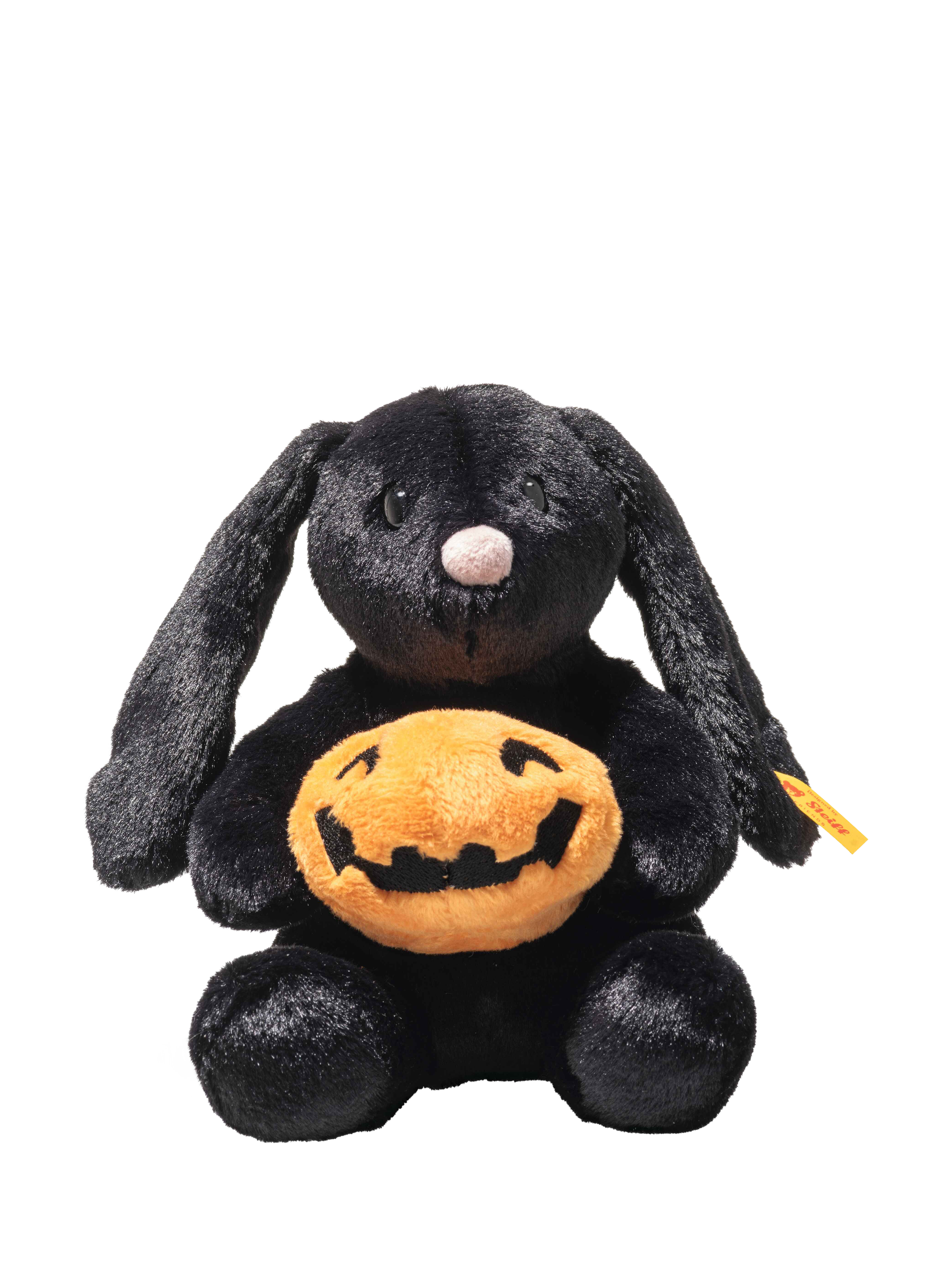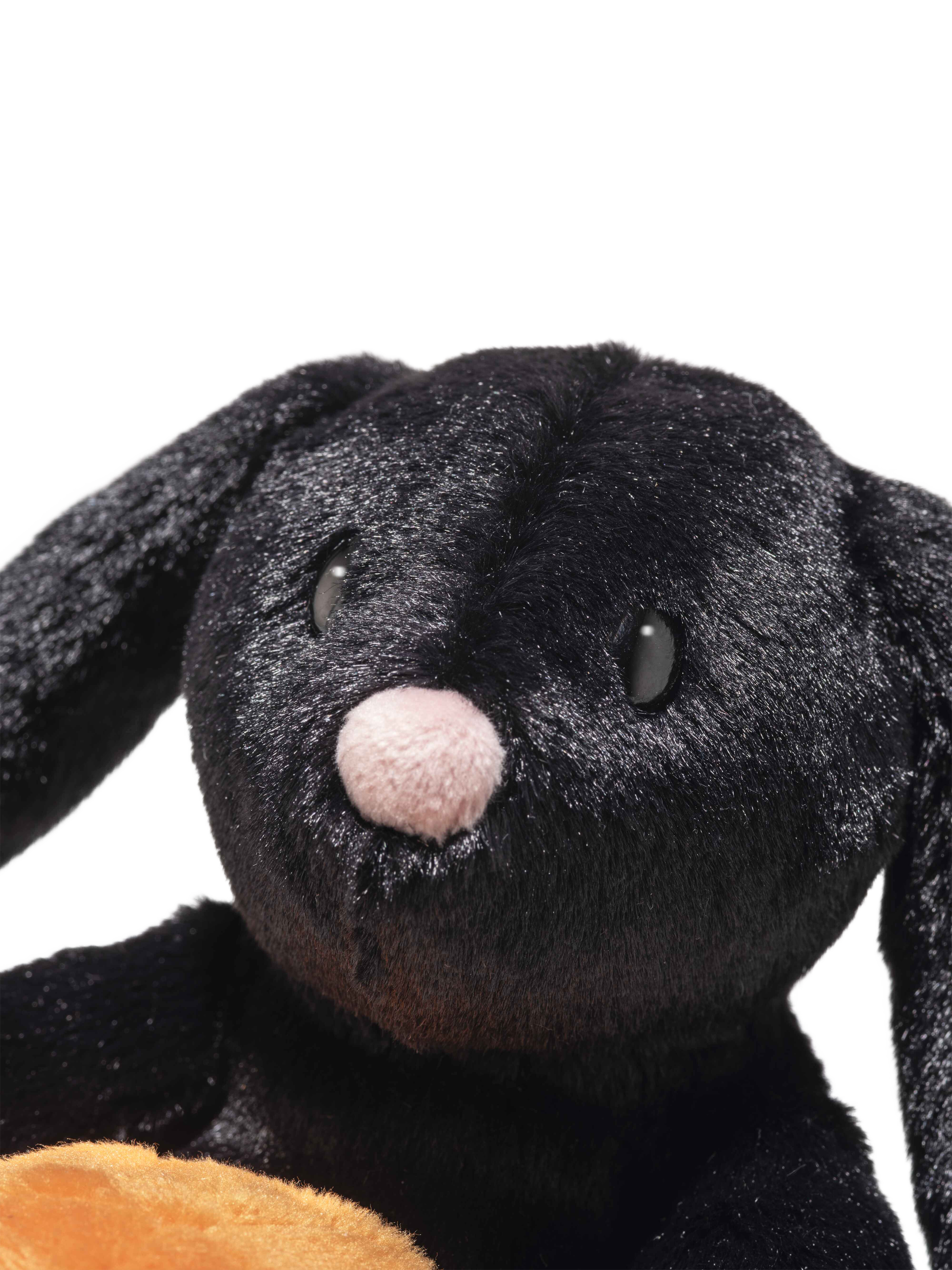 With a orange pumpkin between his paws and deep black plush fur, Mr Spice Hoppie Rabbit hops straight from a Halloween night into your arms. His soft plush, gentle eyes and pink nose give him a tender expression that radiates warmth and comfort.