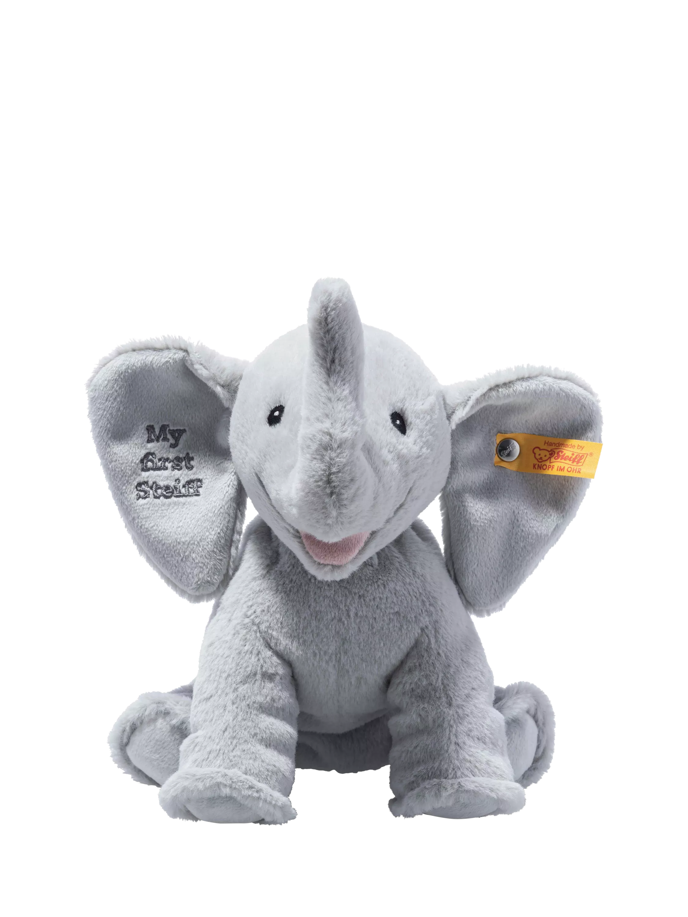 Here comes My First Steiff Ellie Elephant - especially soft and gentle on delicate baby skin, absolutely safe and wonderfully cuddly for snuggling with the very youngest. Ellie Elephant radiates a great deal of warmth with her cheerful smile and loving gaze, her large ears are perfect for holding and feeling. Finished with 'My First Steiff' embroidered in the ear.