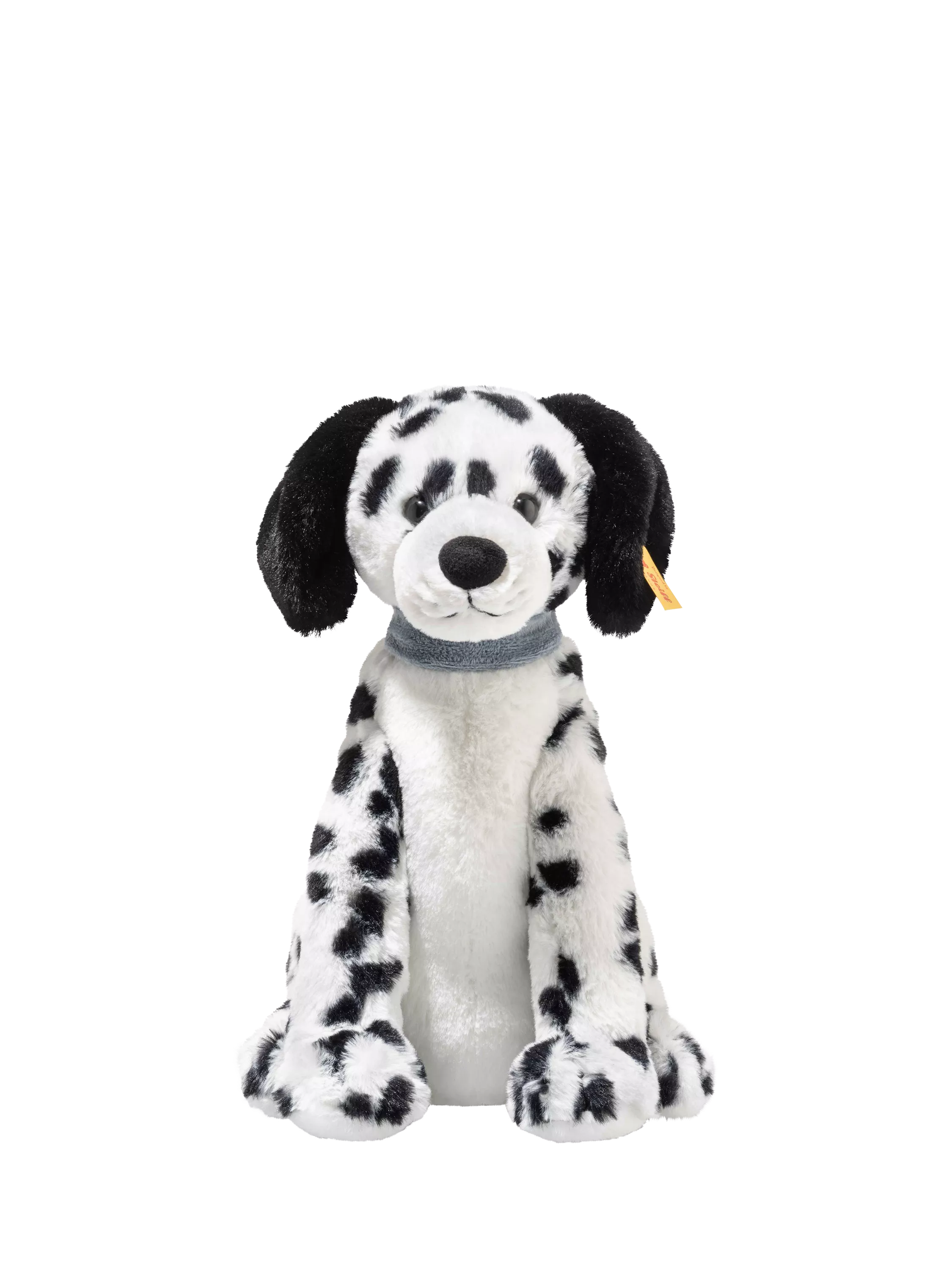 Full marks for this dog: The sitting Dalmatian Oskar is made of cuddly plush. This spotty friend is a true stand out, the blue soft collar provides a pretty contrast to the black and white fur and its friendly look invites you to play and cuddle.