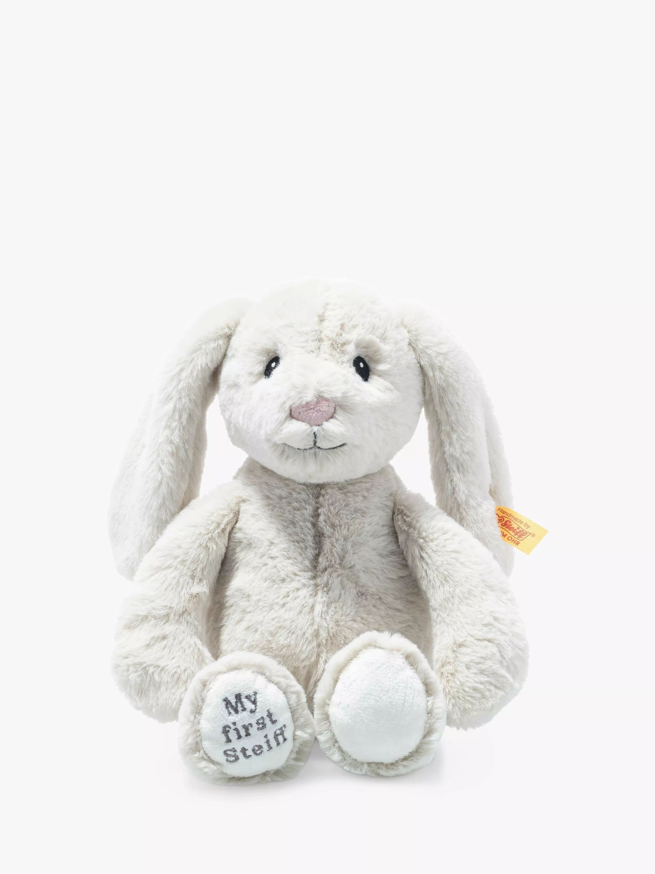 Measuring 26cm tall, this soft and cuddly companion is excited about the new arrival and loves to nestle against their cheek - at bedtime, too. When the baby wakes, My first Steiff Hoppie rabbit is right there. She already smells familiar. Their little hands can fondle the super-soft plush, stitched rabbit soles and small bean bags in the arms, legs and bottom. They'll be able to feel her mouth, little nose and eyes, and their fingers will all but disappear amid those wonderfully long ears.
