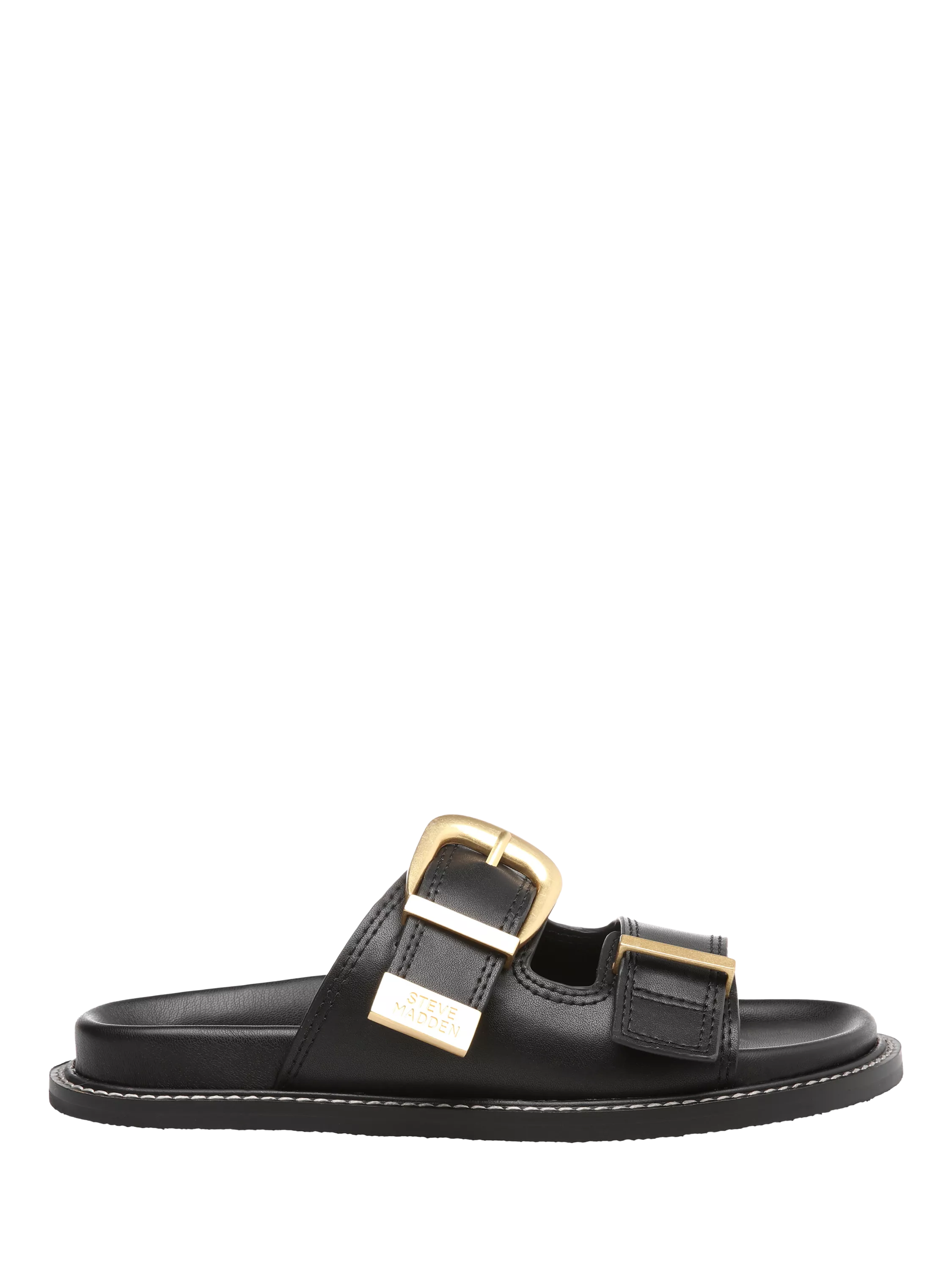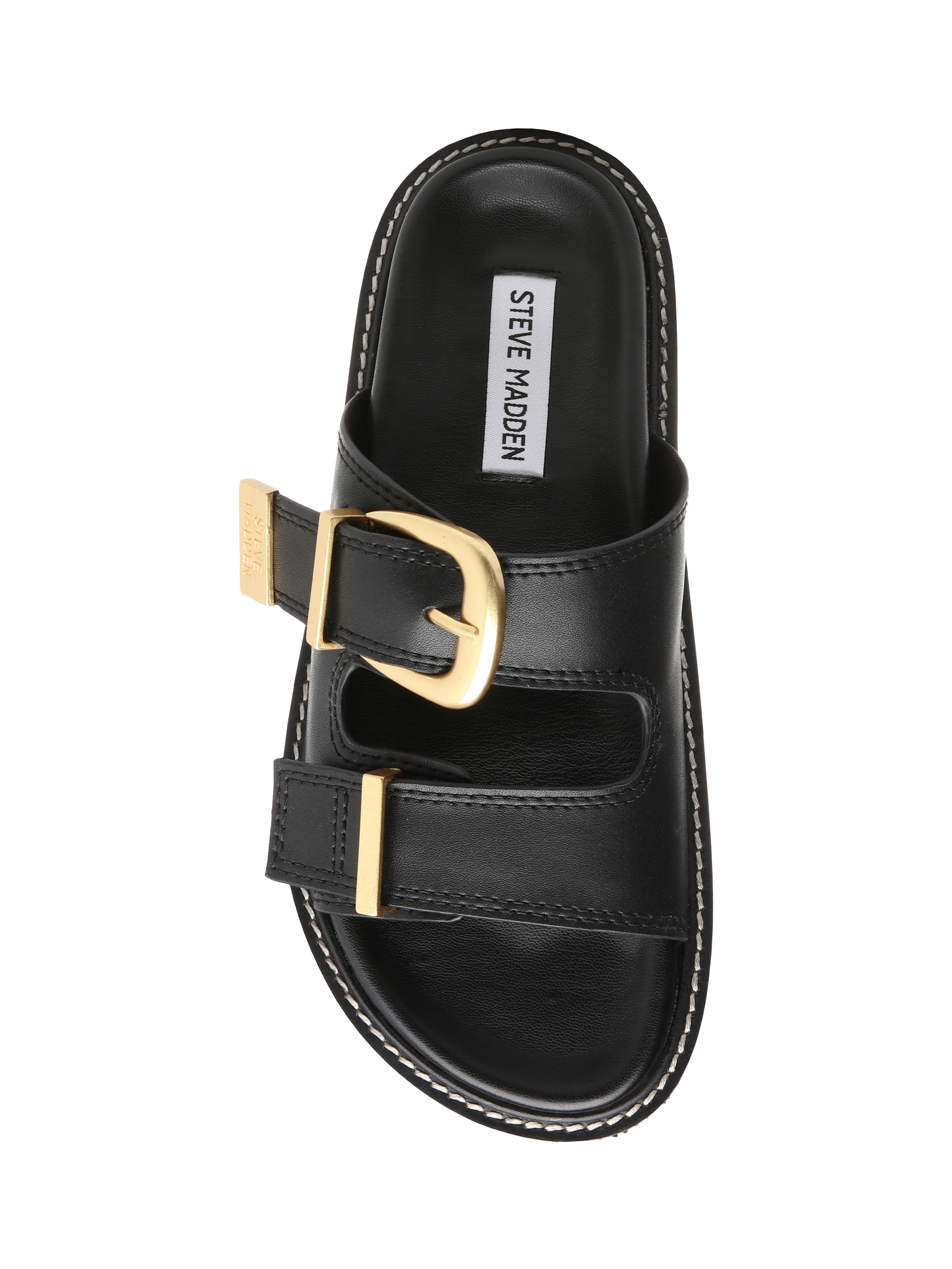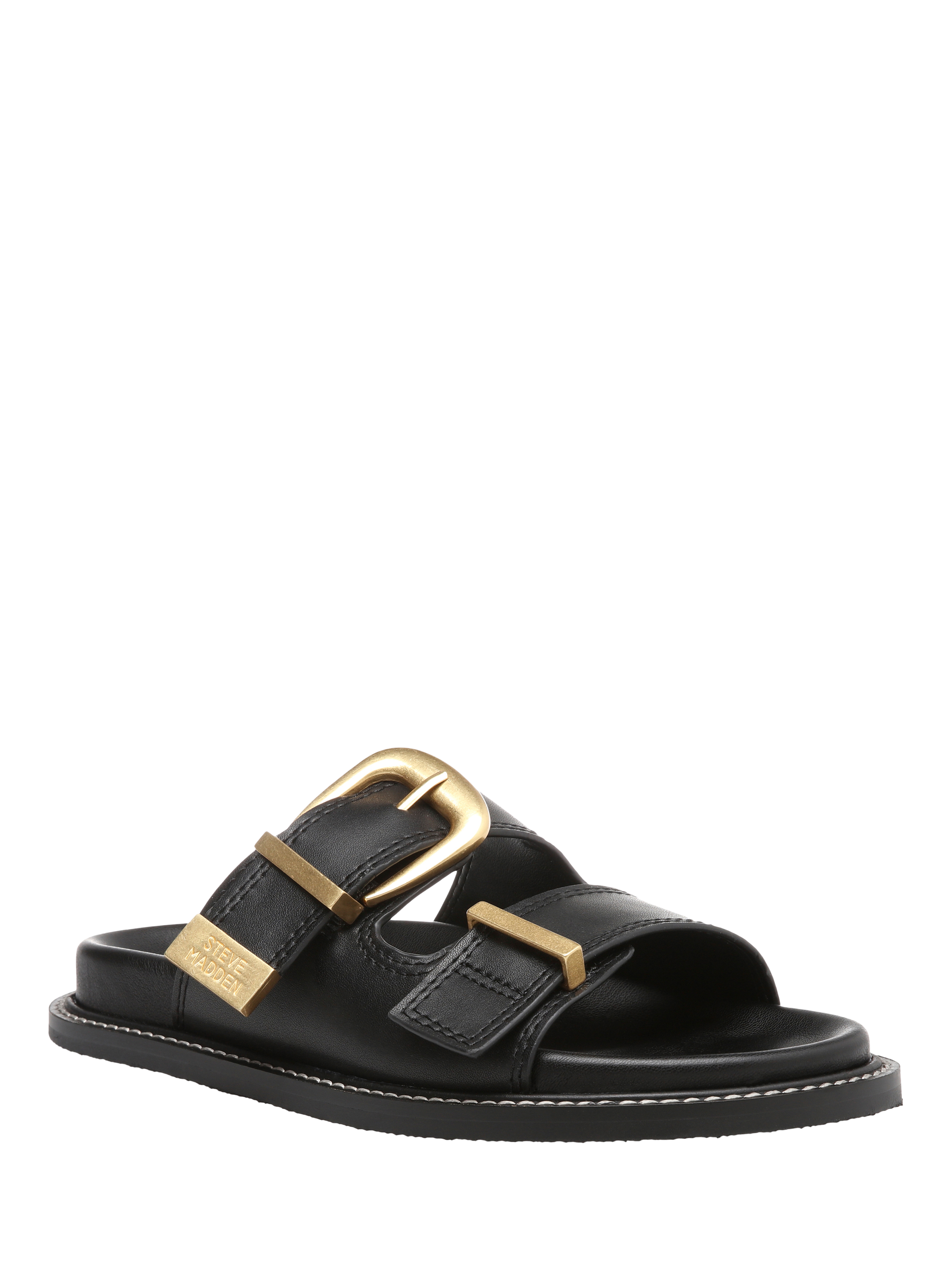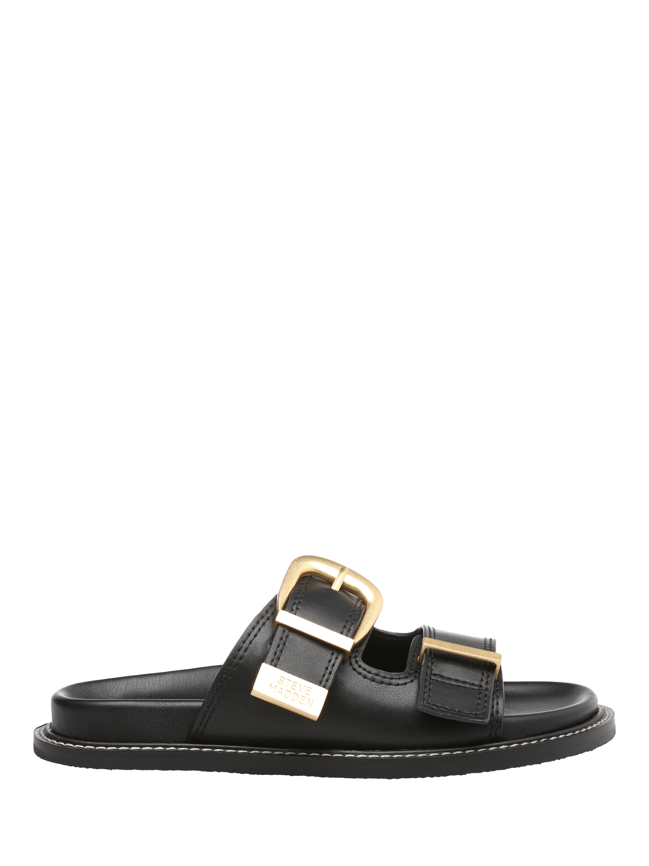 Steve Madden updates the classic buckle sandal by incorporating gold-tone hardware and contrast stitching to great effect.
