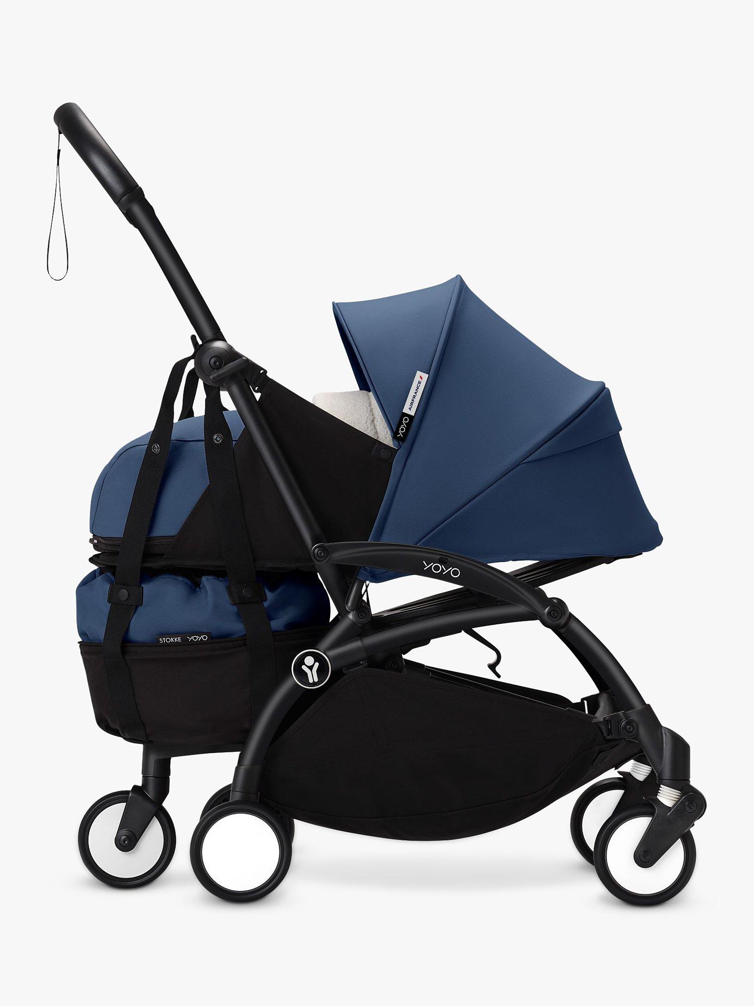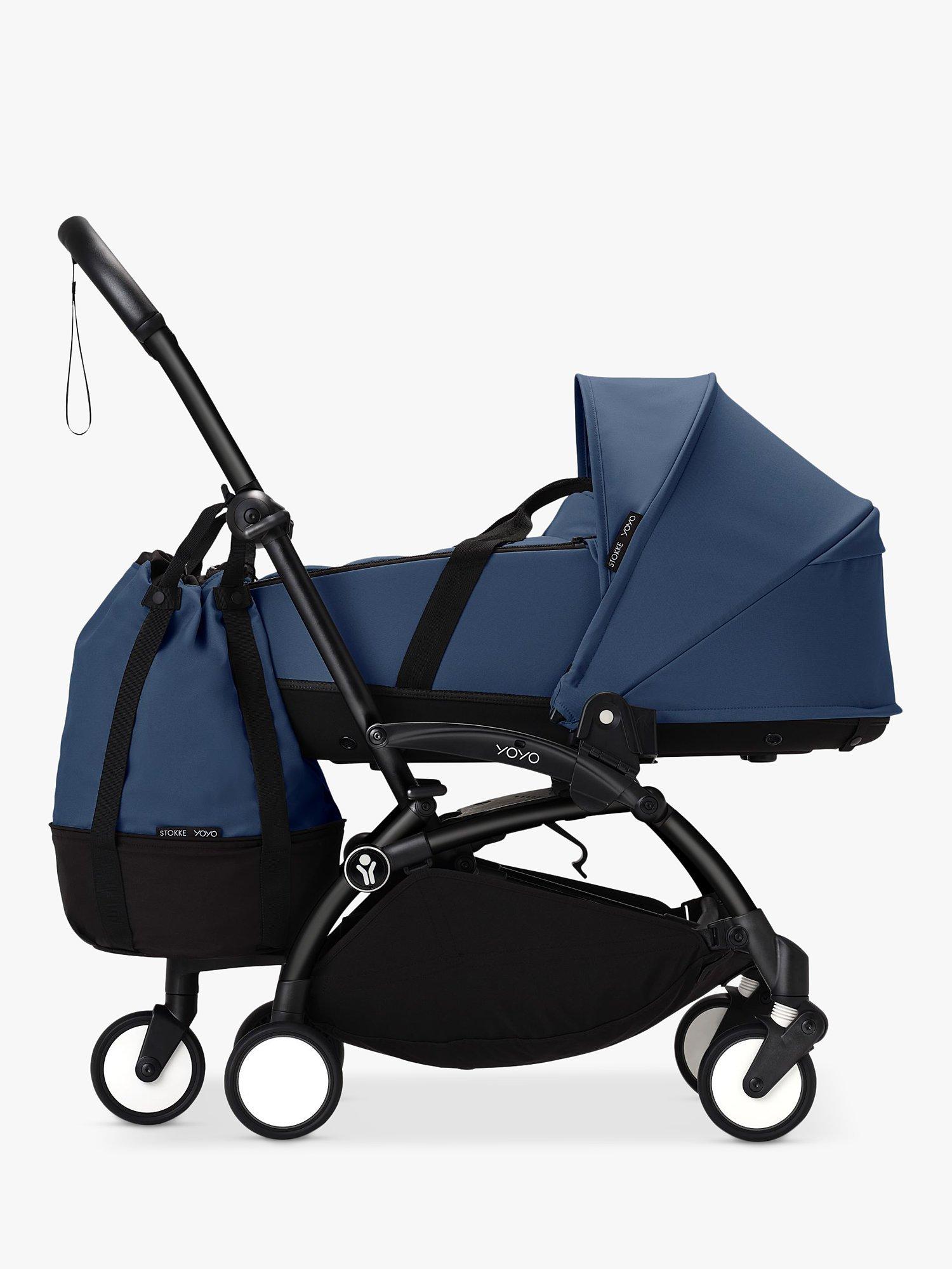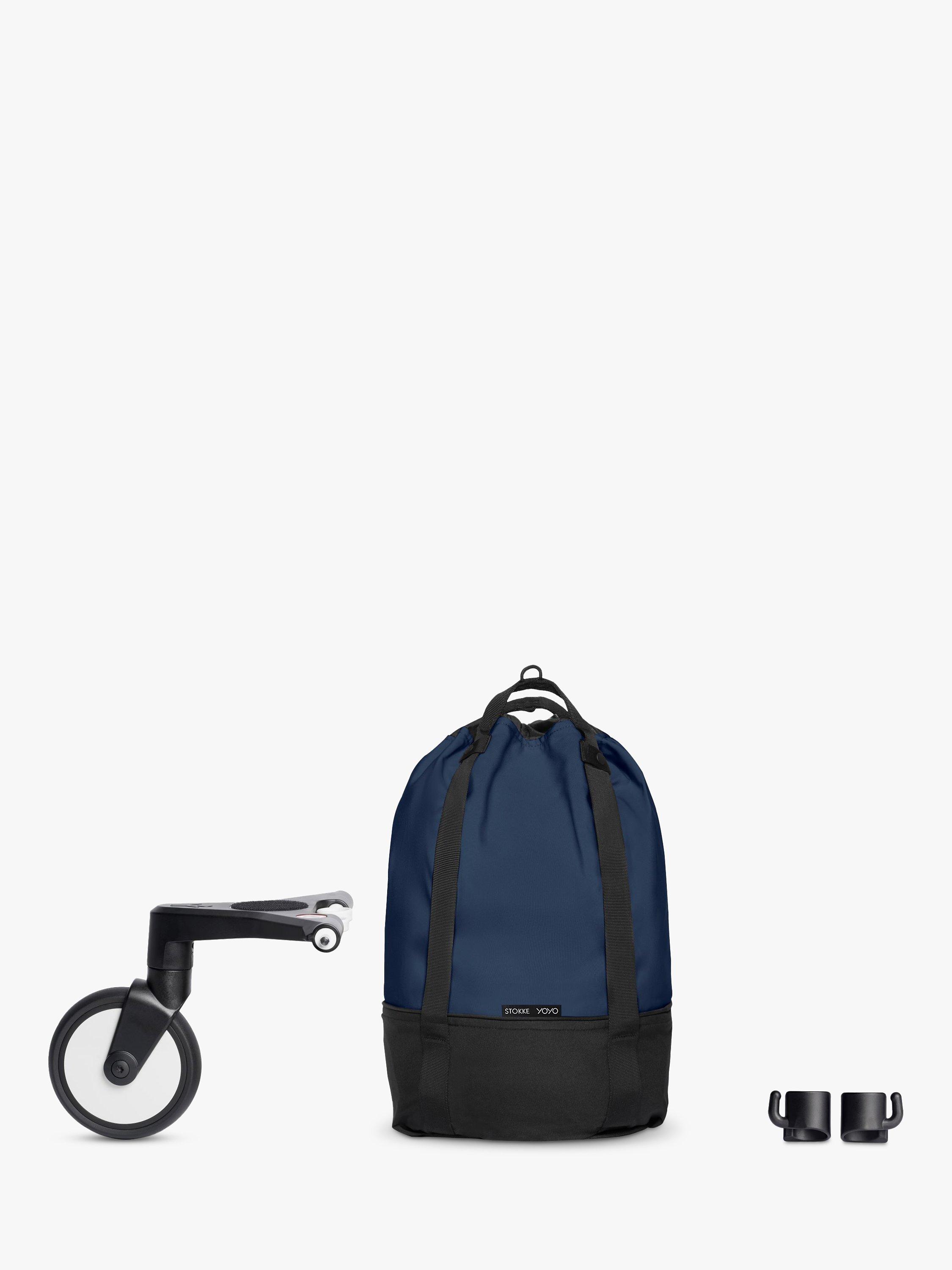 Providing extra storage for the YOYO stroller, the YOYO bag easily hooks on and supports an additional 10kg (22lbs) thanks to its wheel. Has 2 carrying handles and a flat bottom. The stroller remains manoeuvrable, light, stable, and navigable with one hand, even when the bag is loaded.