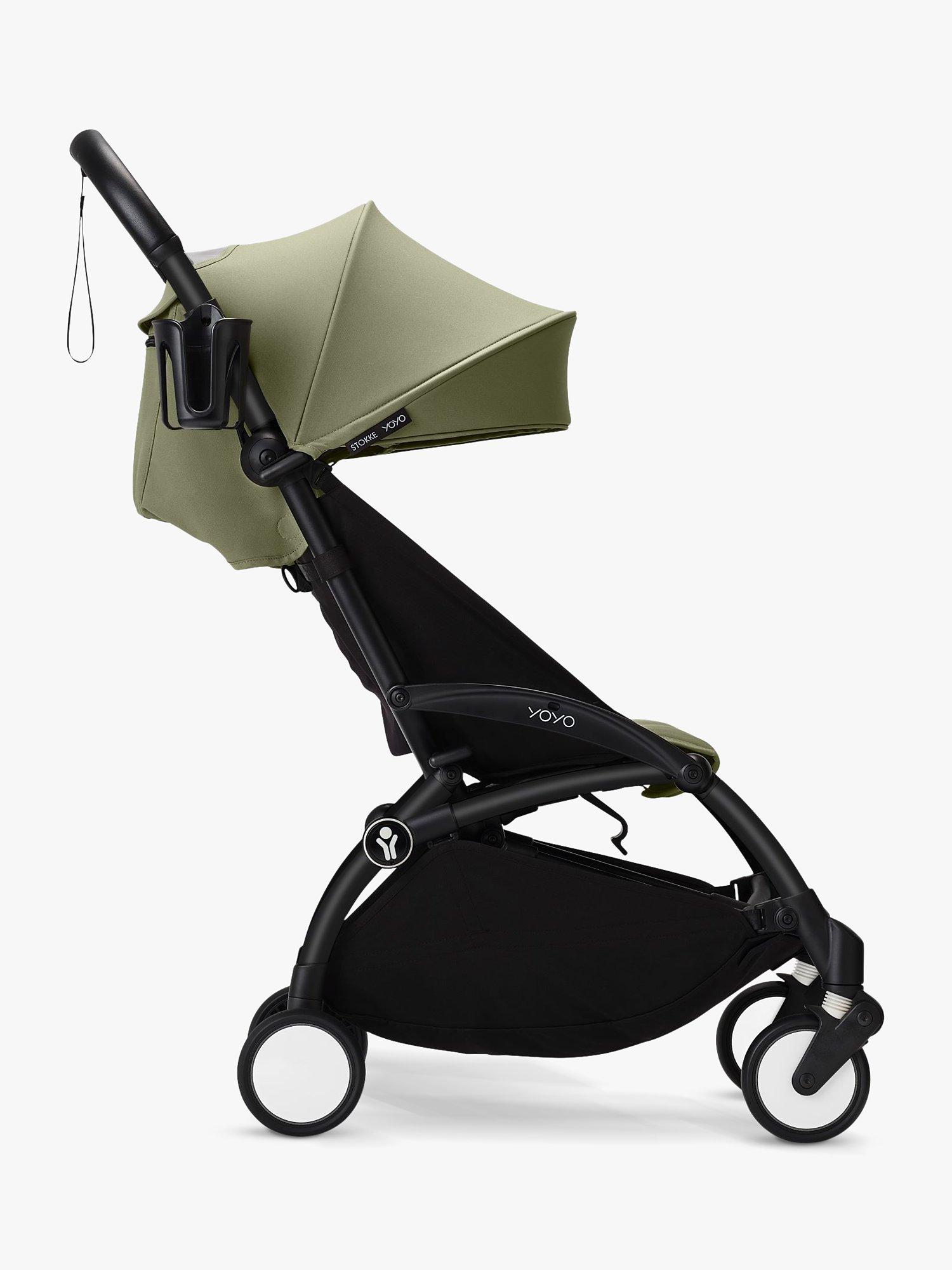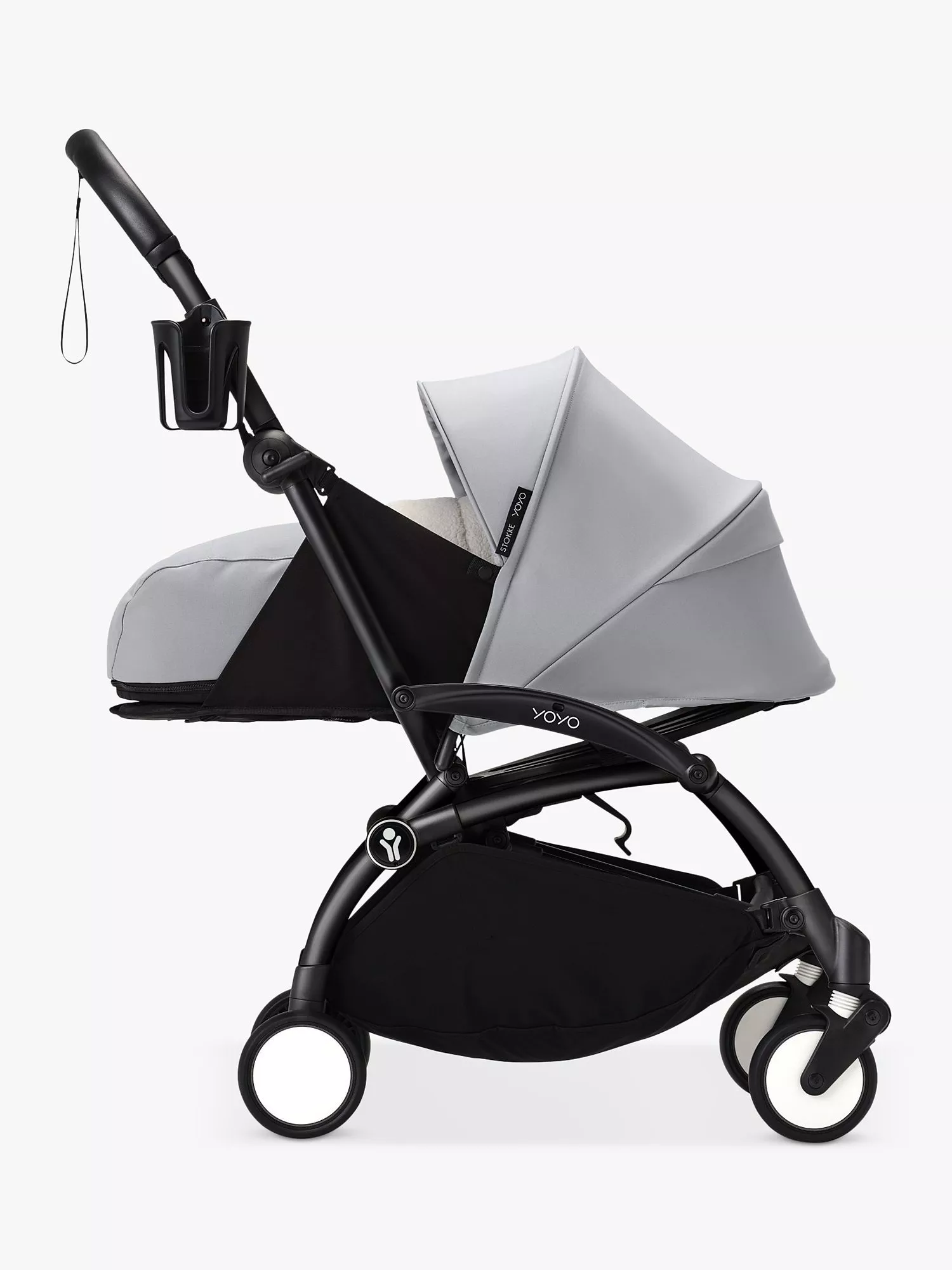Take your drinks on the go. The cup holder has been specially designed for YOYO®. It is very stable and has a hook specifically designed to be attached to 6 different points on the stroller frame. Keep your drinks close at hand by installing a cup holder for you and one for your baby.