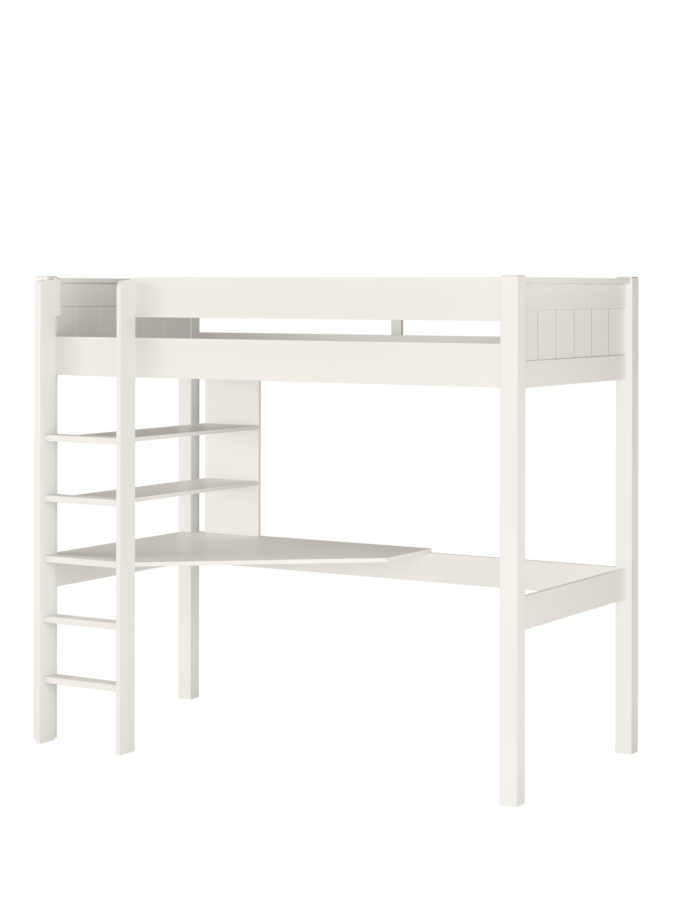 Sleep, store, and study in the space of just one bed! The ultimate space saver, this high-sleeper has an integrated desk and shelving that creates a handy place for them to study and work on hobbies. It features an attractive tongue and groove effect in the headboards and footboards with an overall neutral appeal that can work for either boy or girl.