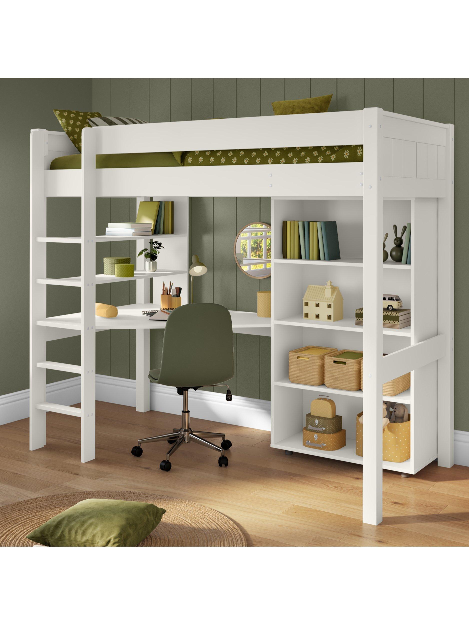 The ultimate space saver, this high-sleeper has an integrated desk and shelving, and bookcase. It can easily be adapted to suit a boy's or a girl's bedroom and is great for homework and hobbies. It features an attractive tongue and groove effect in the headboards and footboards.