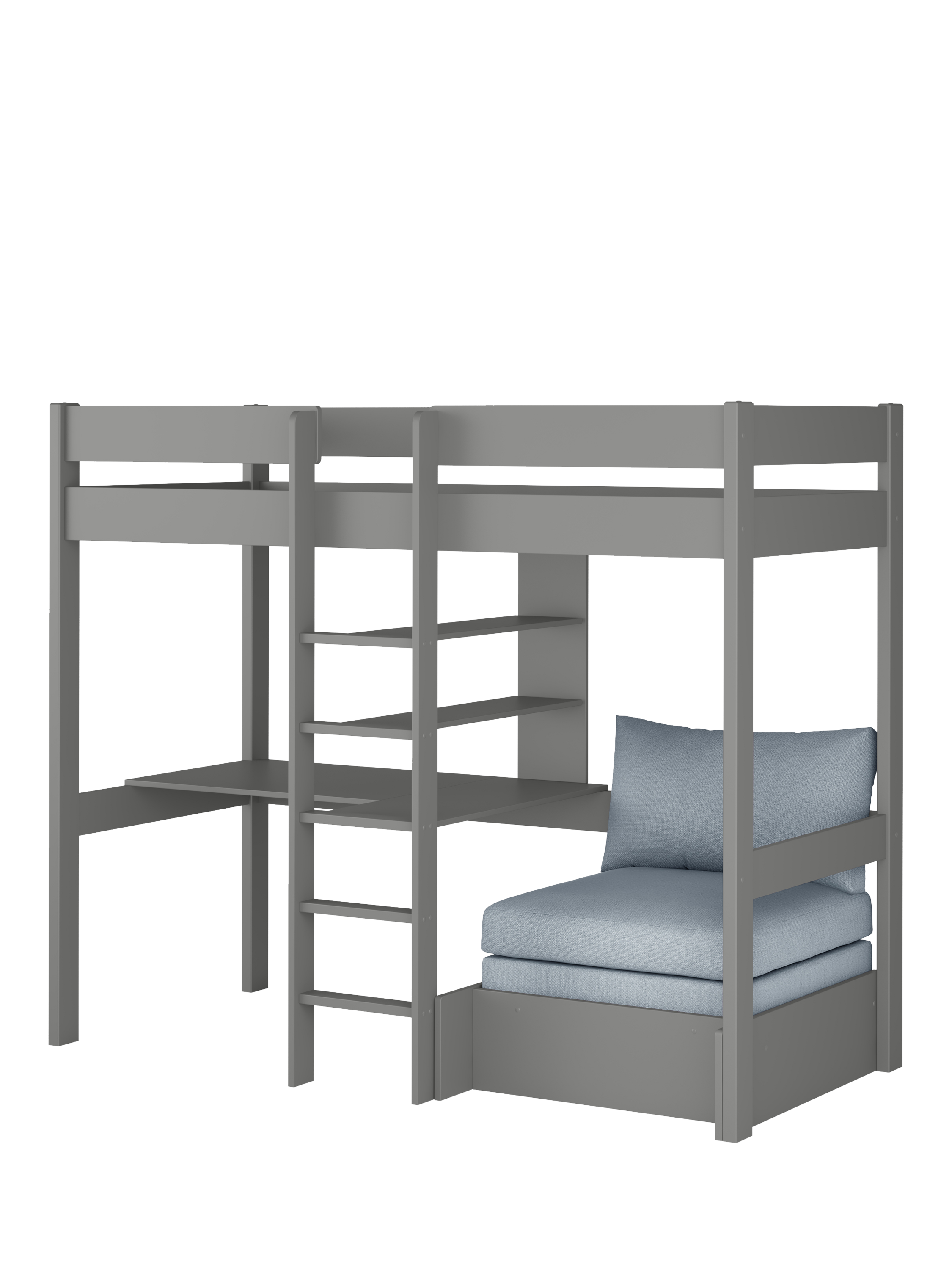 A space-saving dream, this solid bed is designed to impress and it certainly does in terms of functionality. Feel on top of the world with stylish loft living, leaving plenty of space below for studying using the spacious built-in desk. Fill the integrated shelves with books, games or whatever whilst chatting to your friend lazing about in the comfy chair bed which also creates a speedy sleepover solution. Store, study, chill and sleepover in the space of just one bed!