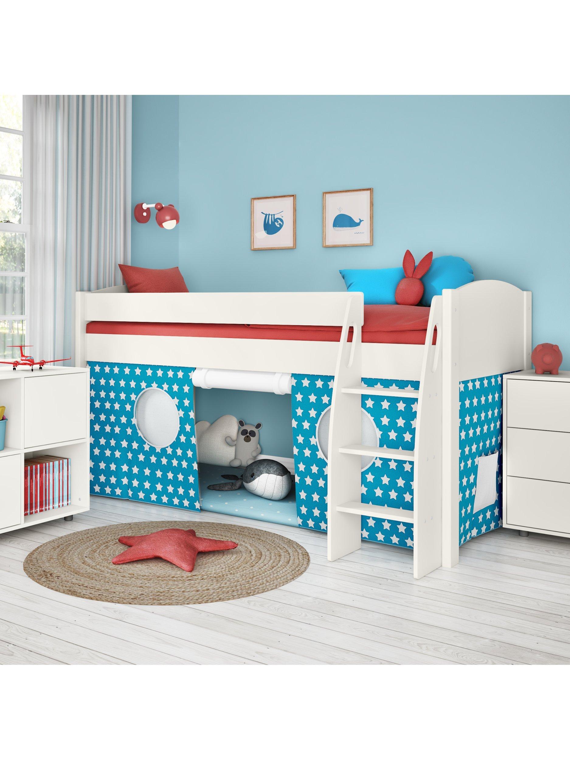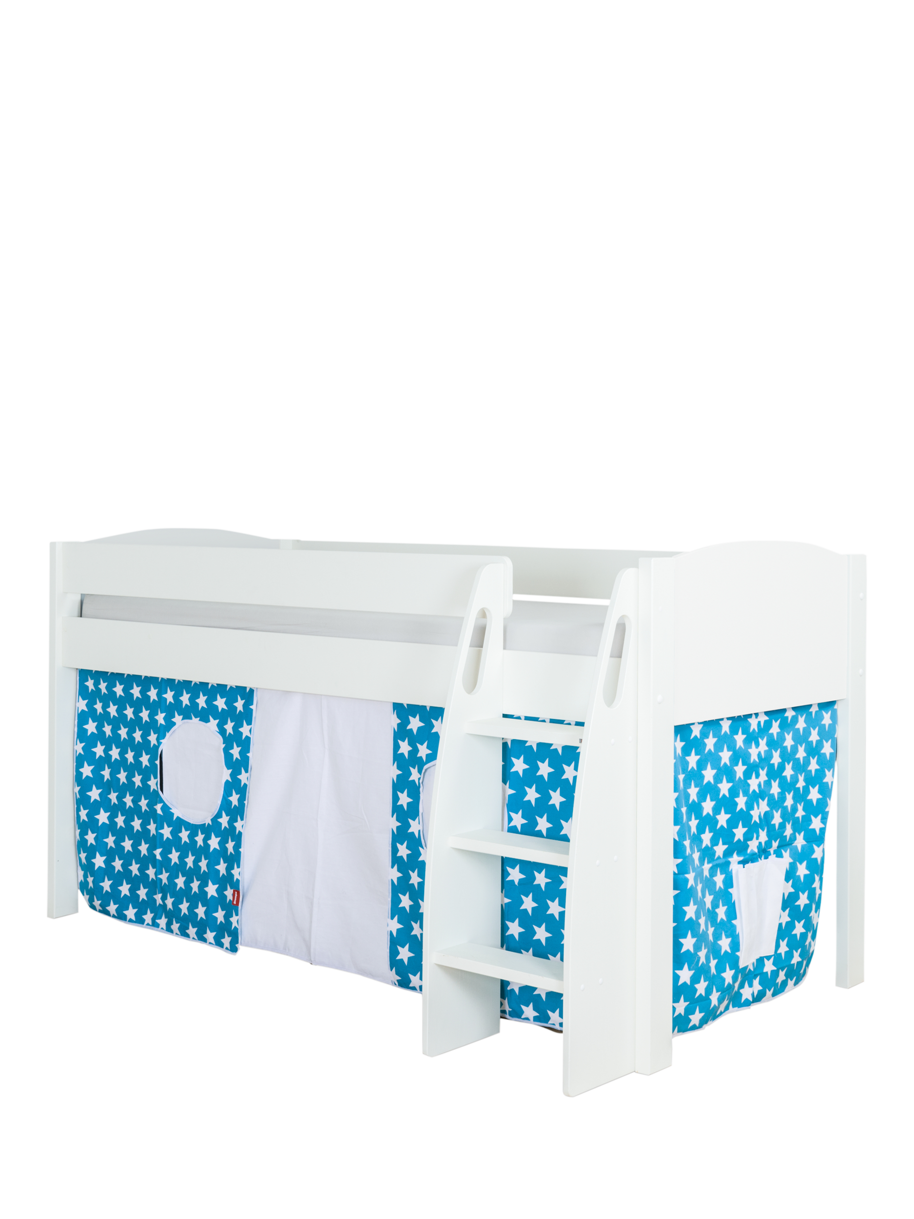 This mid-sleeper bed offers plenty of functional space, and with its charming three sided star print tent, the under bed area is easily transformed into a dedicated place for play.