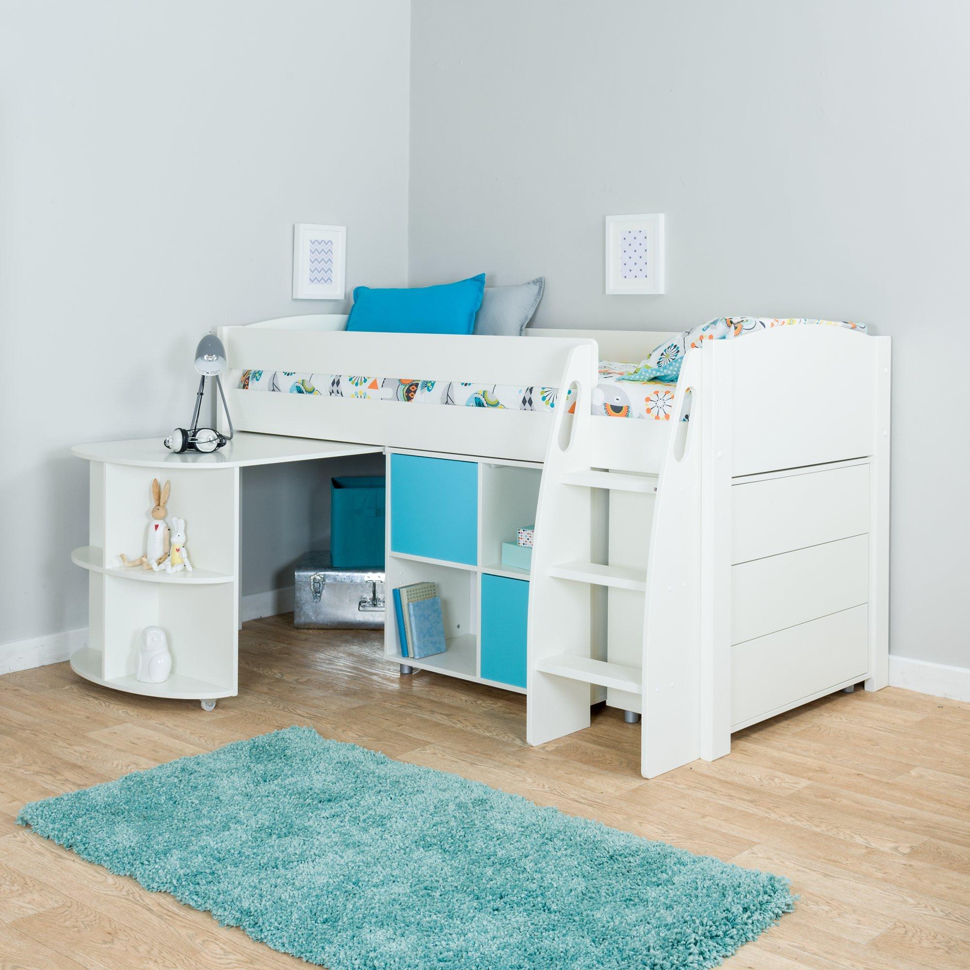 StompaUno S Plus Mid Sleeper with Pull-Out Desk, 3 Drawer Chest and 2 Door Cube Unit, White/Aqua