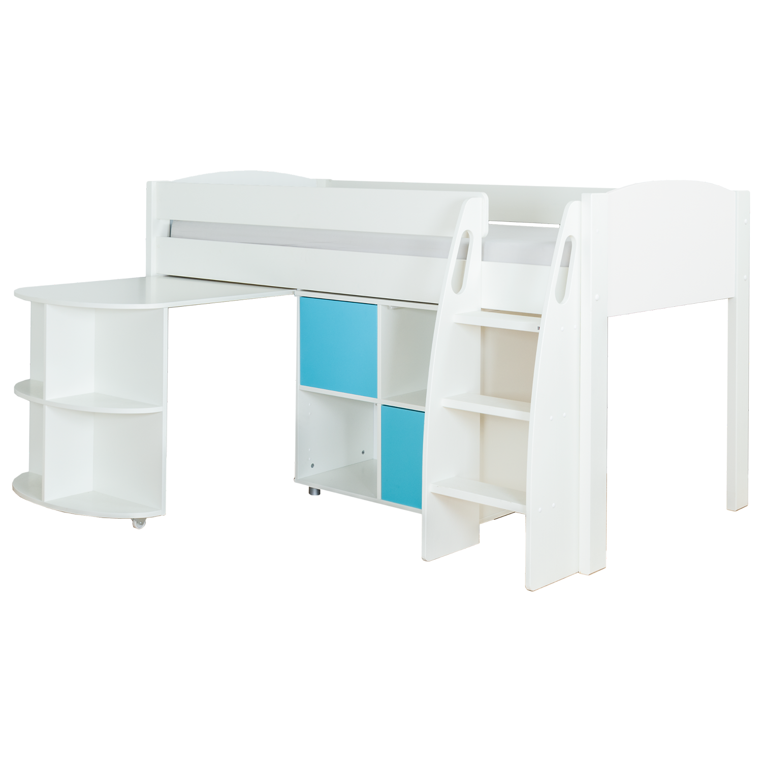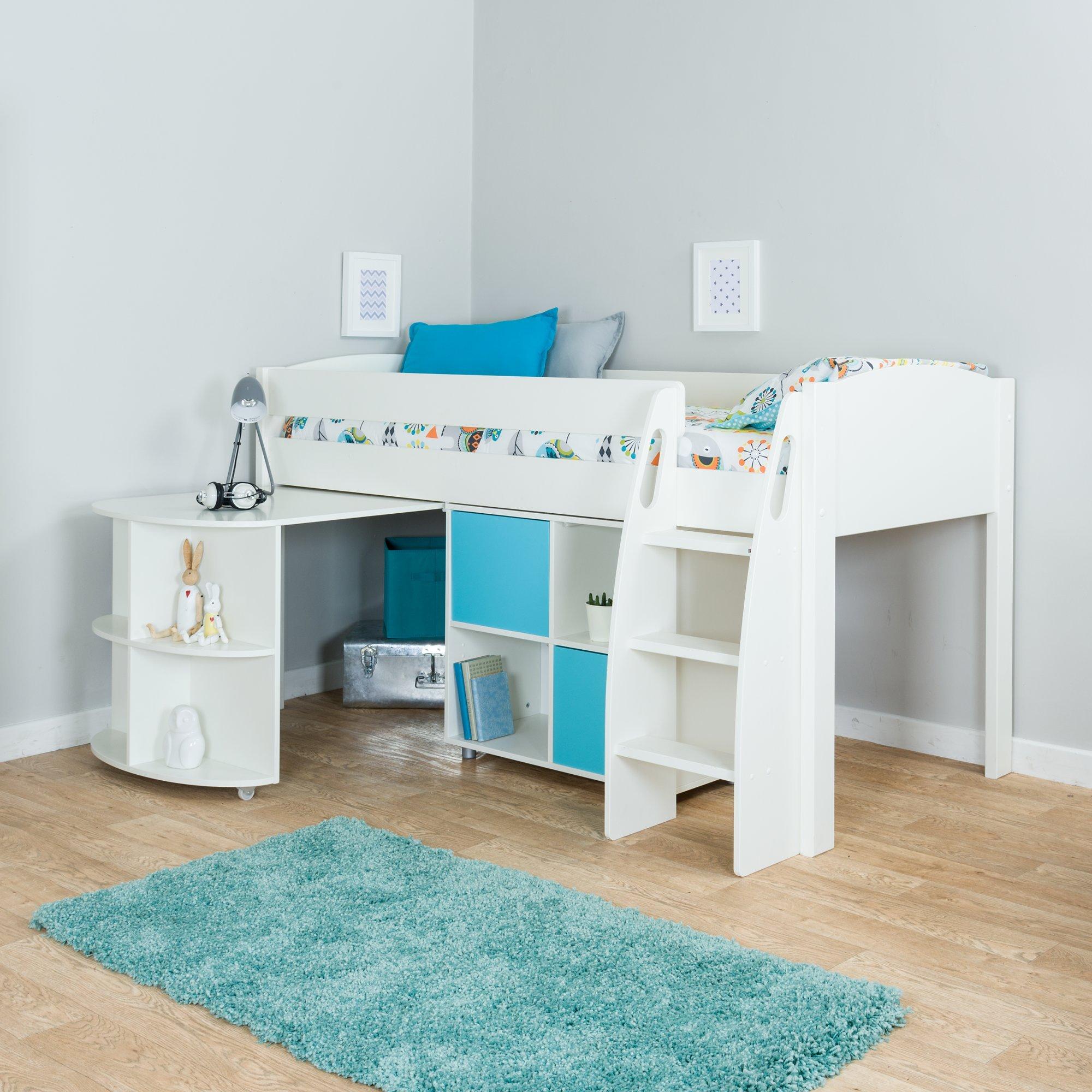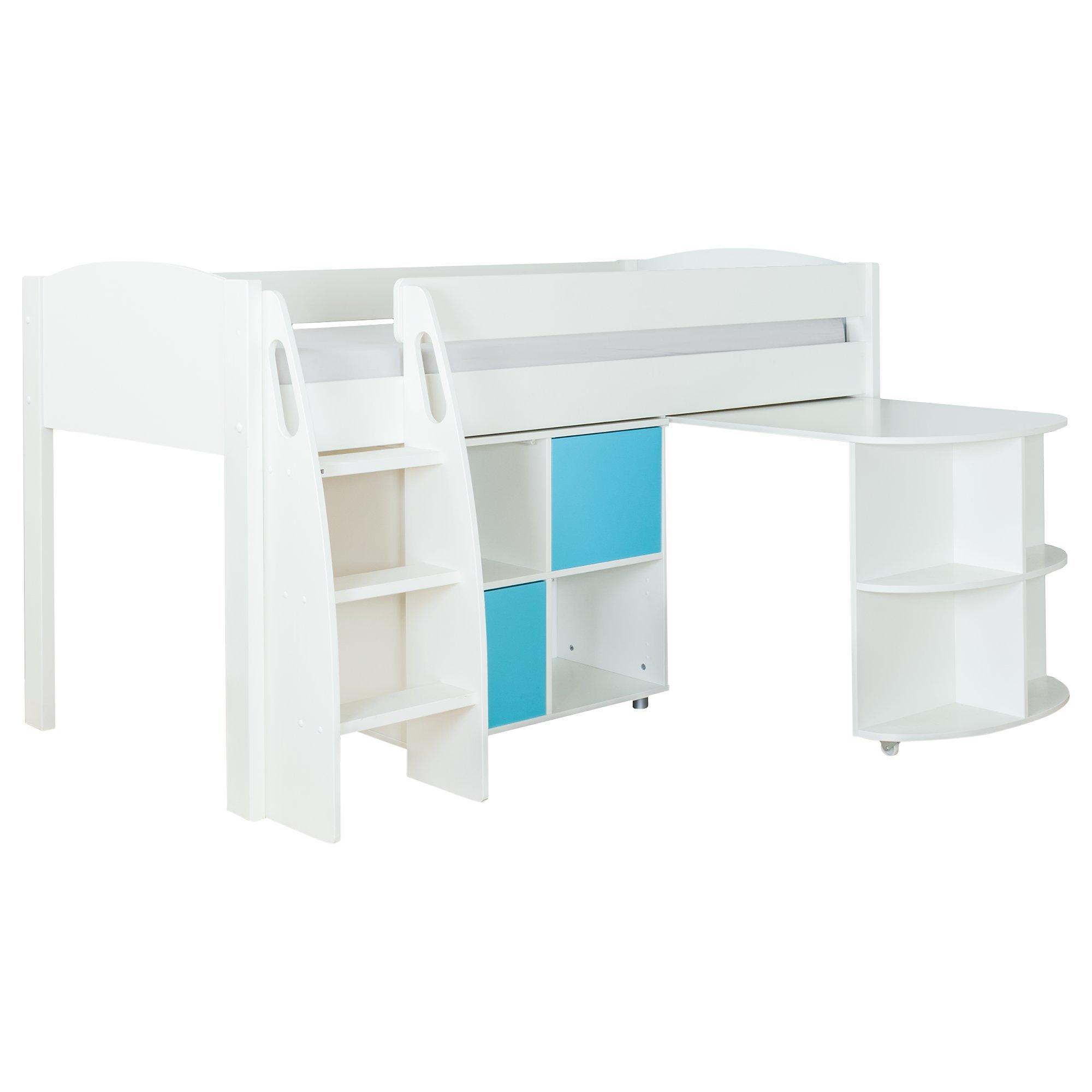 StompaUno S Plus Mid Sleeper with White Headboard, Pull-Out Desk and 2 Door Cube Unit, White/Aqua
