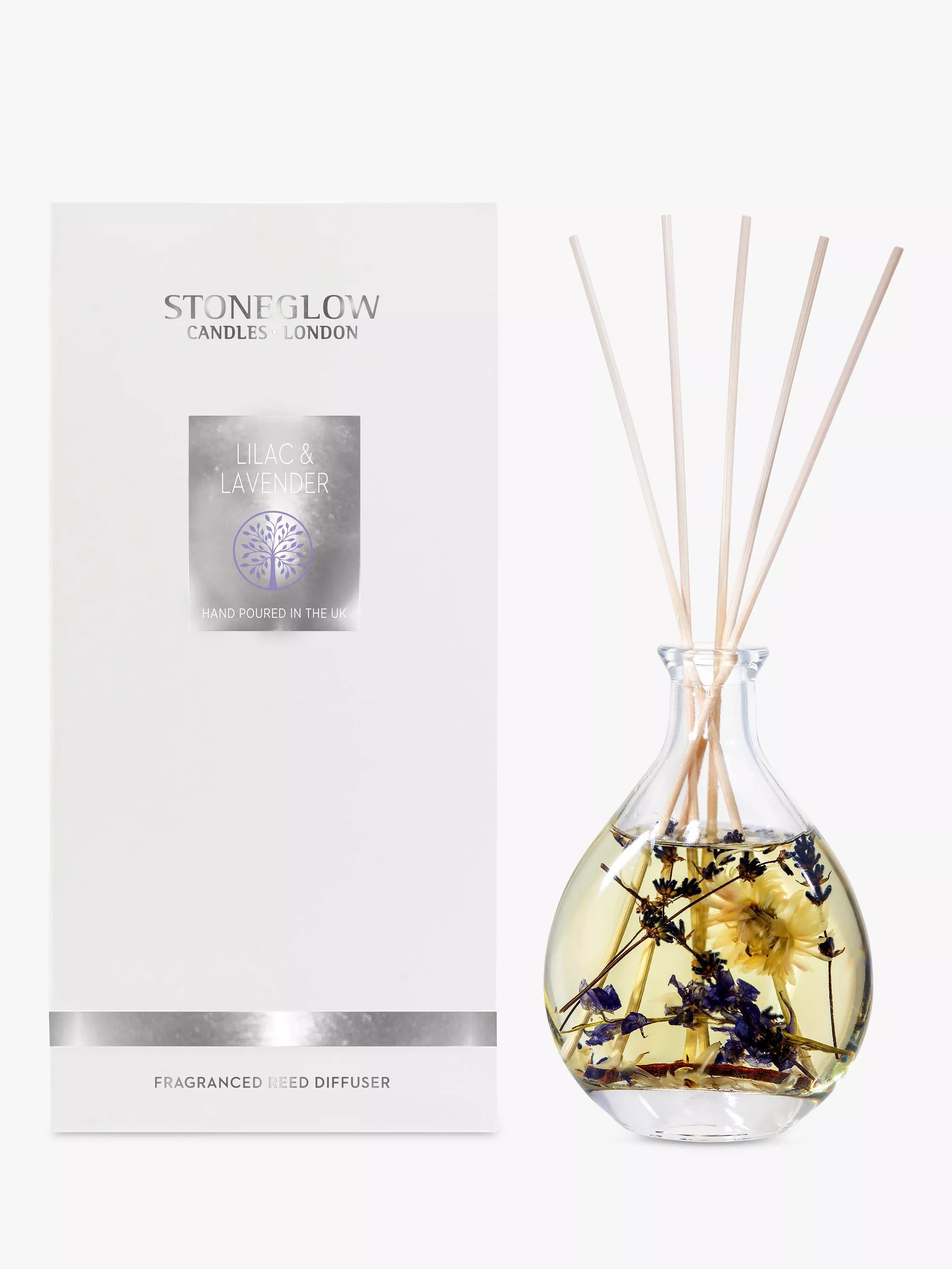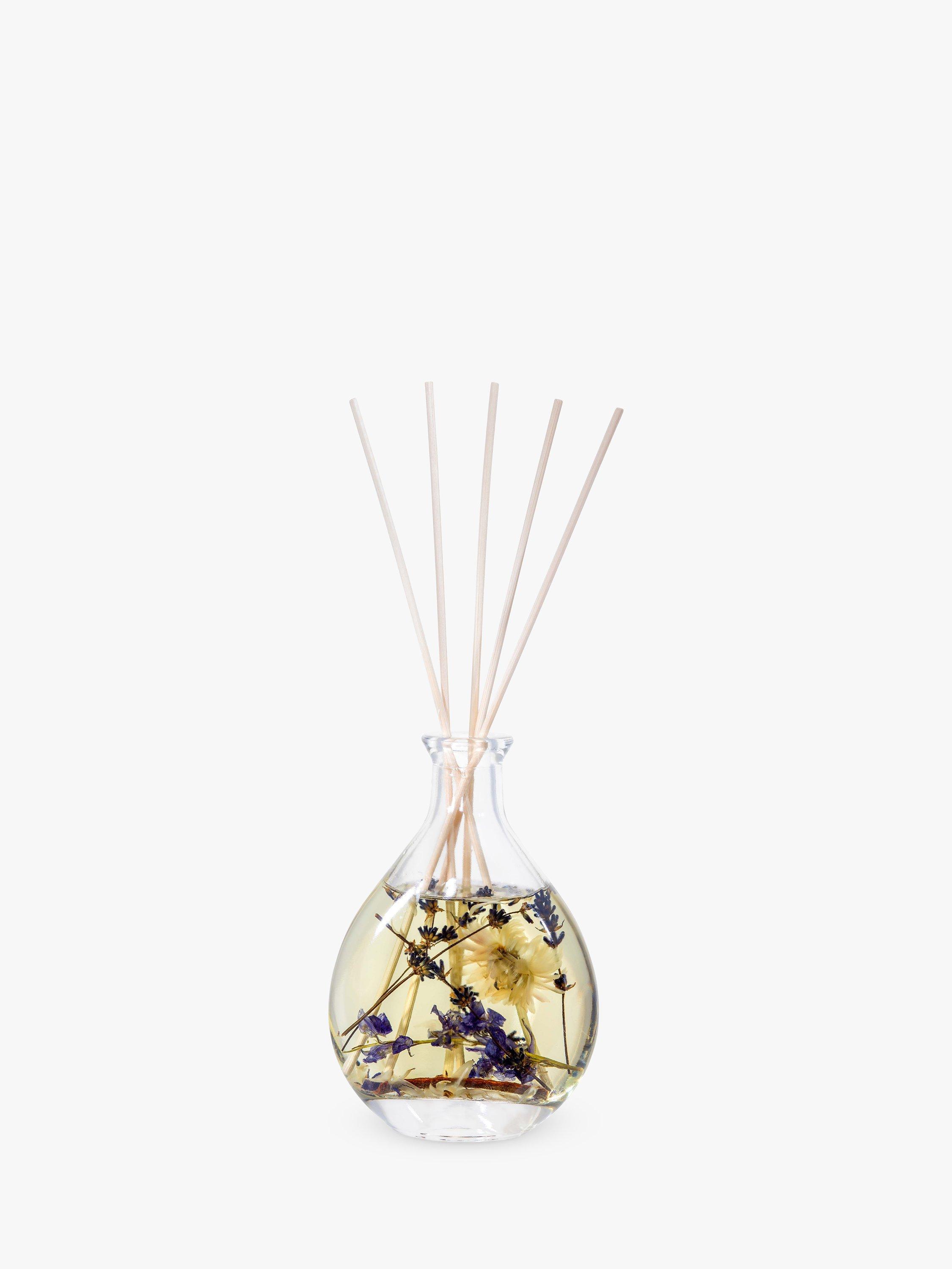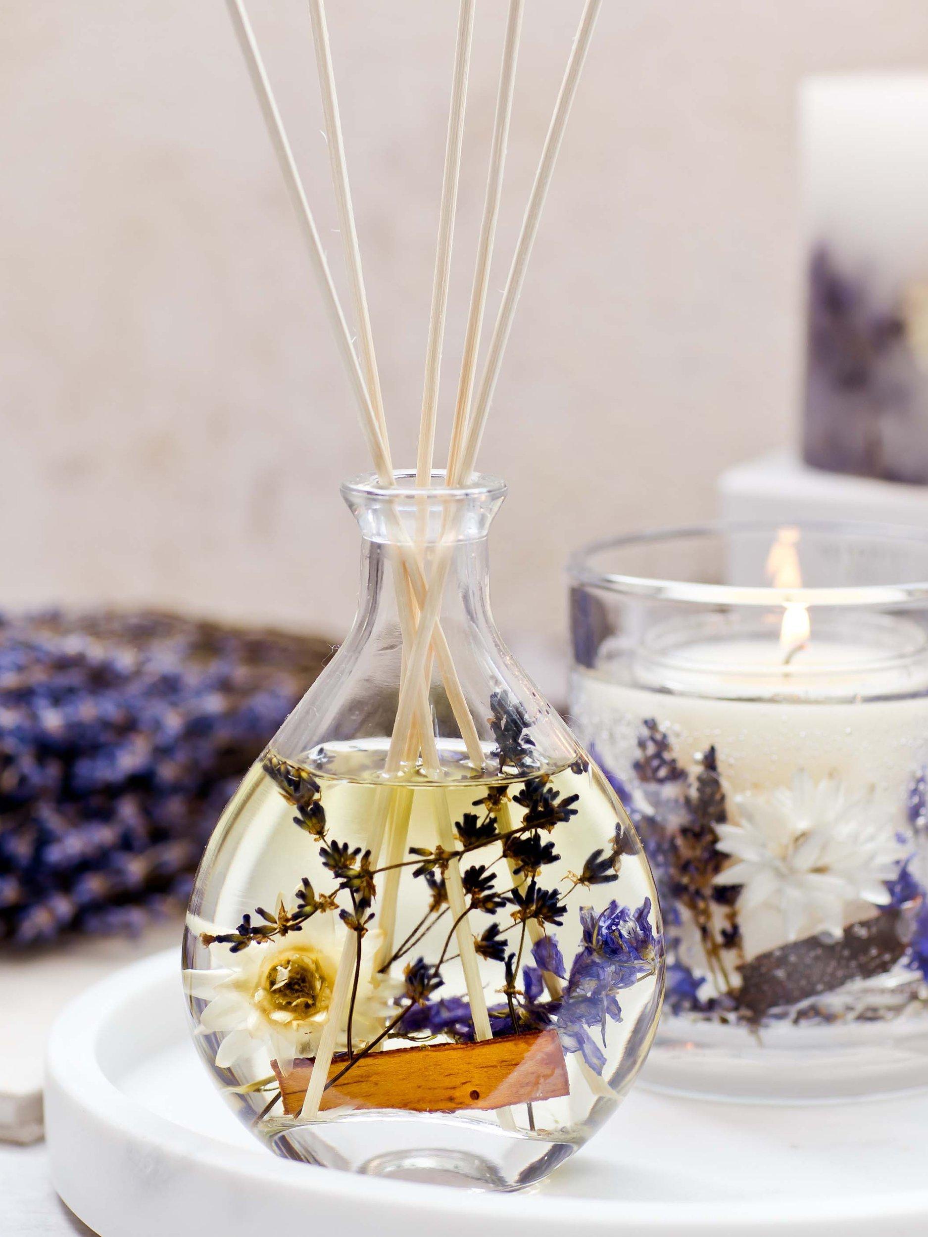 - Glass, reeds, botanicals, fragrance, cardboard