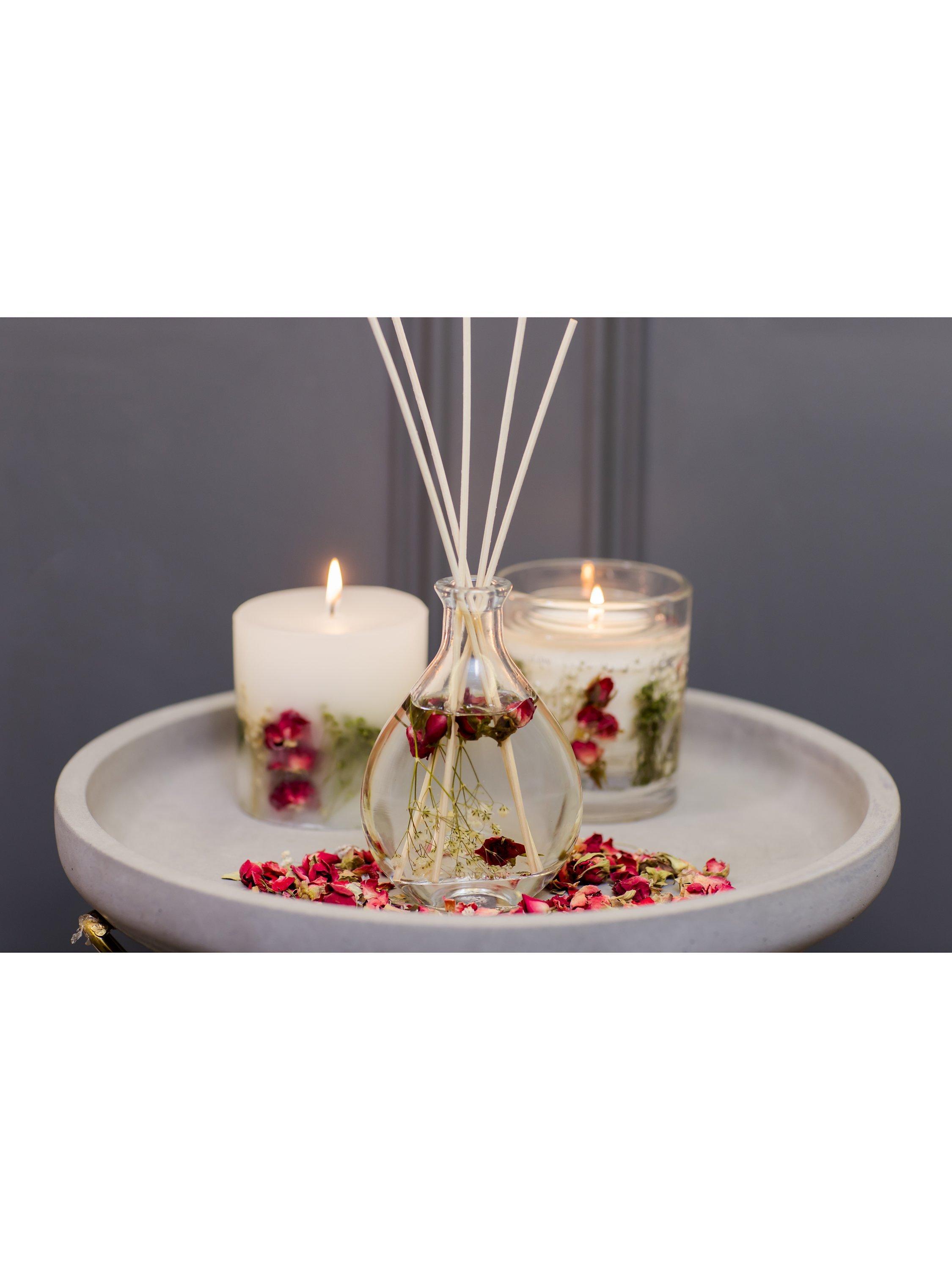 A beautiful bouquet of deep red rose petals and rich geranium blooms. Soft powdery notes and a sultry musk base give this timeless classic a fresh, modern twist.This lovely gel candle with botanicals makes the perfect decorative piece as well as creating a wonderful scent in your home.