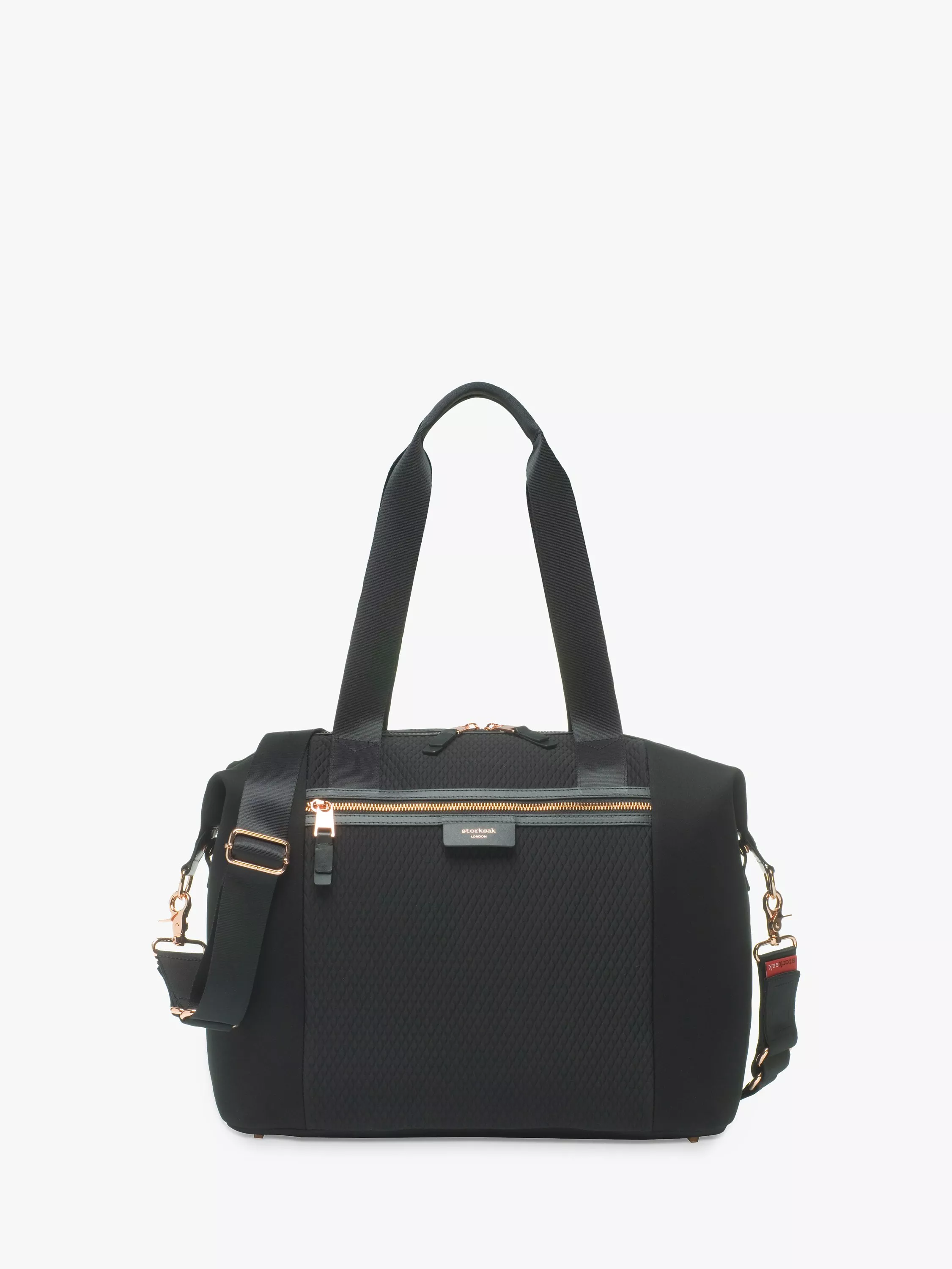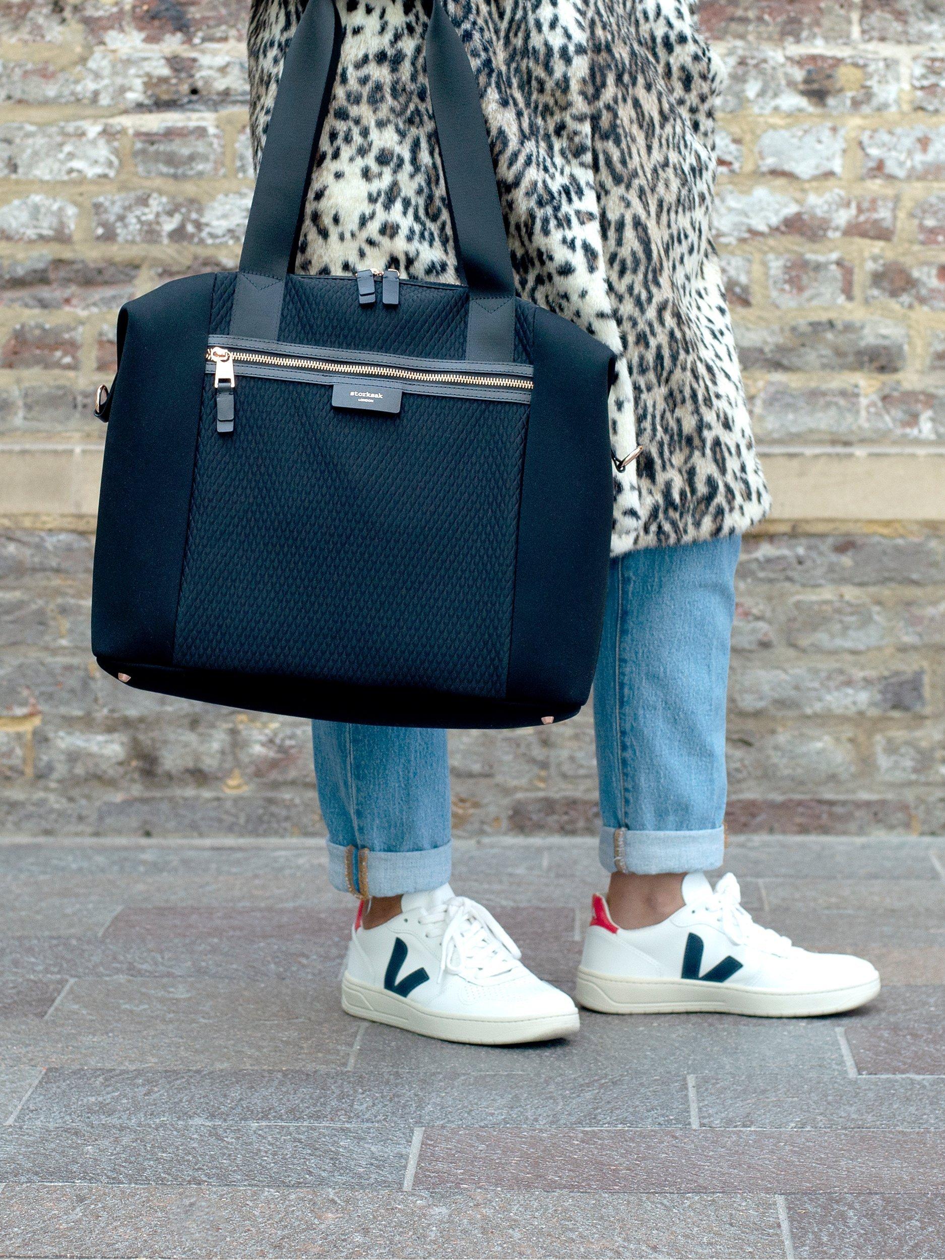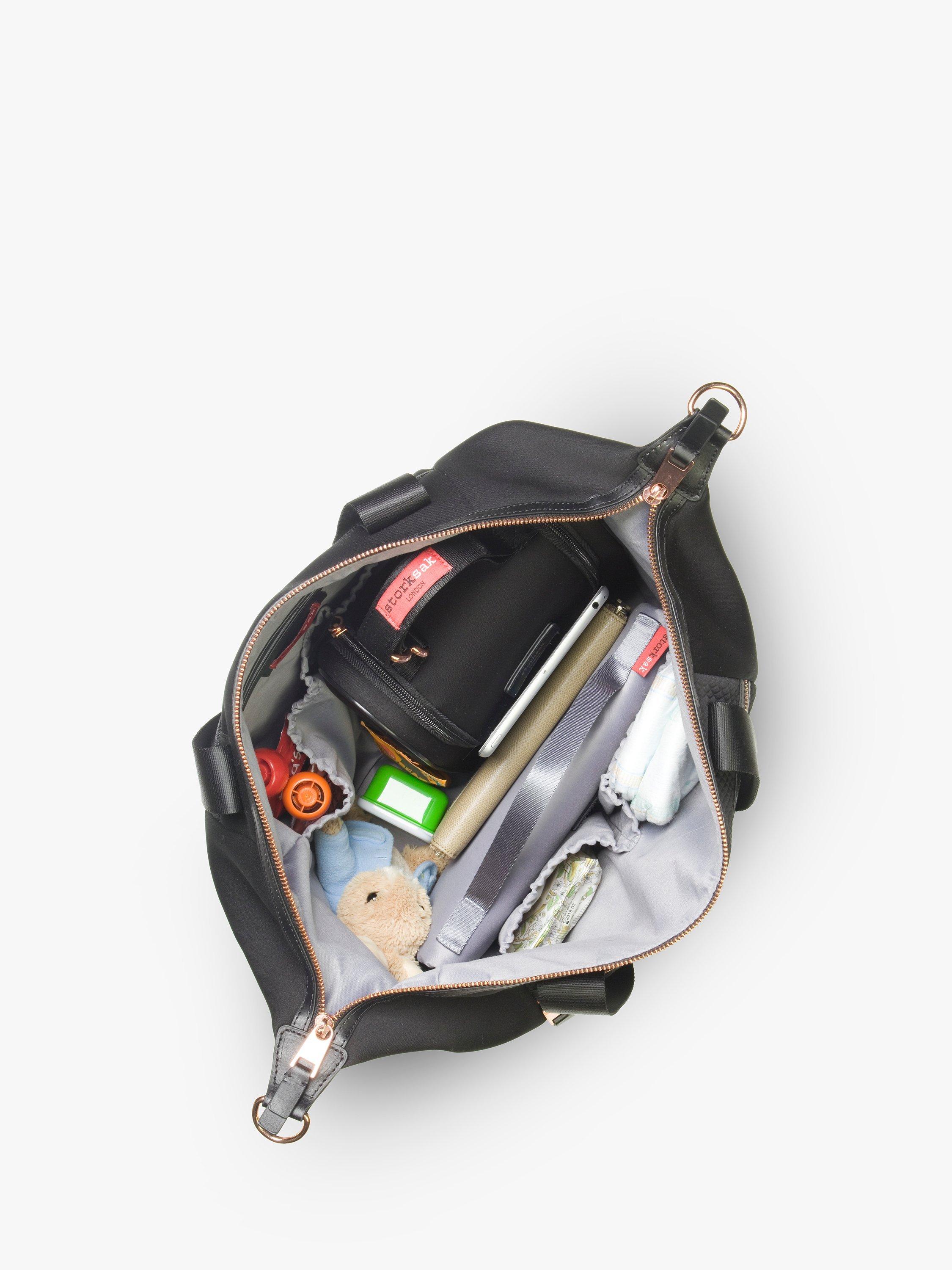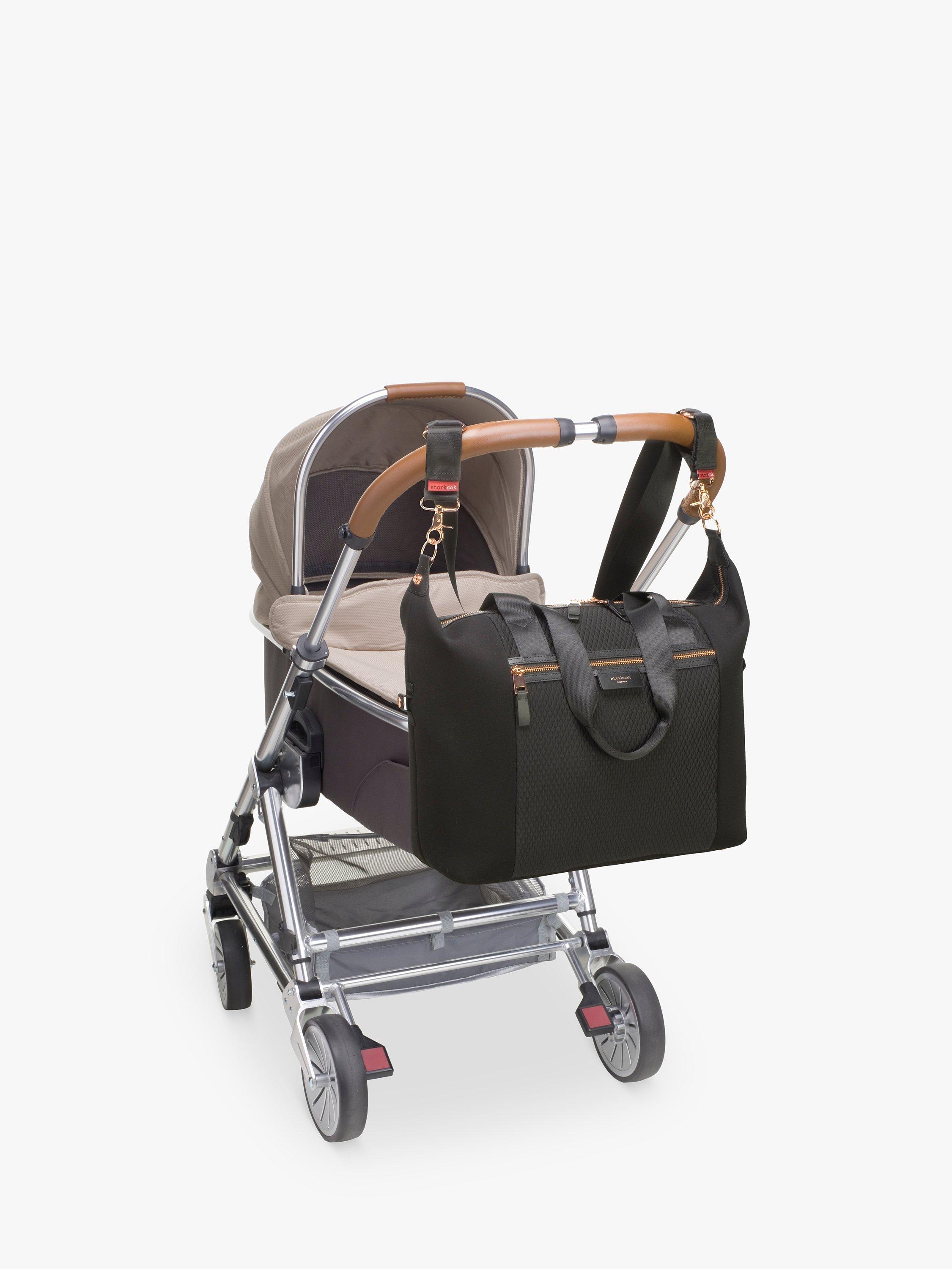 - Long detachable shoulder strap with patented integrated stroller straps - Signature Storksak wipe clean lining