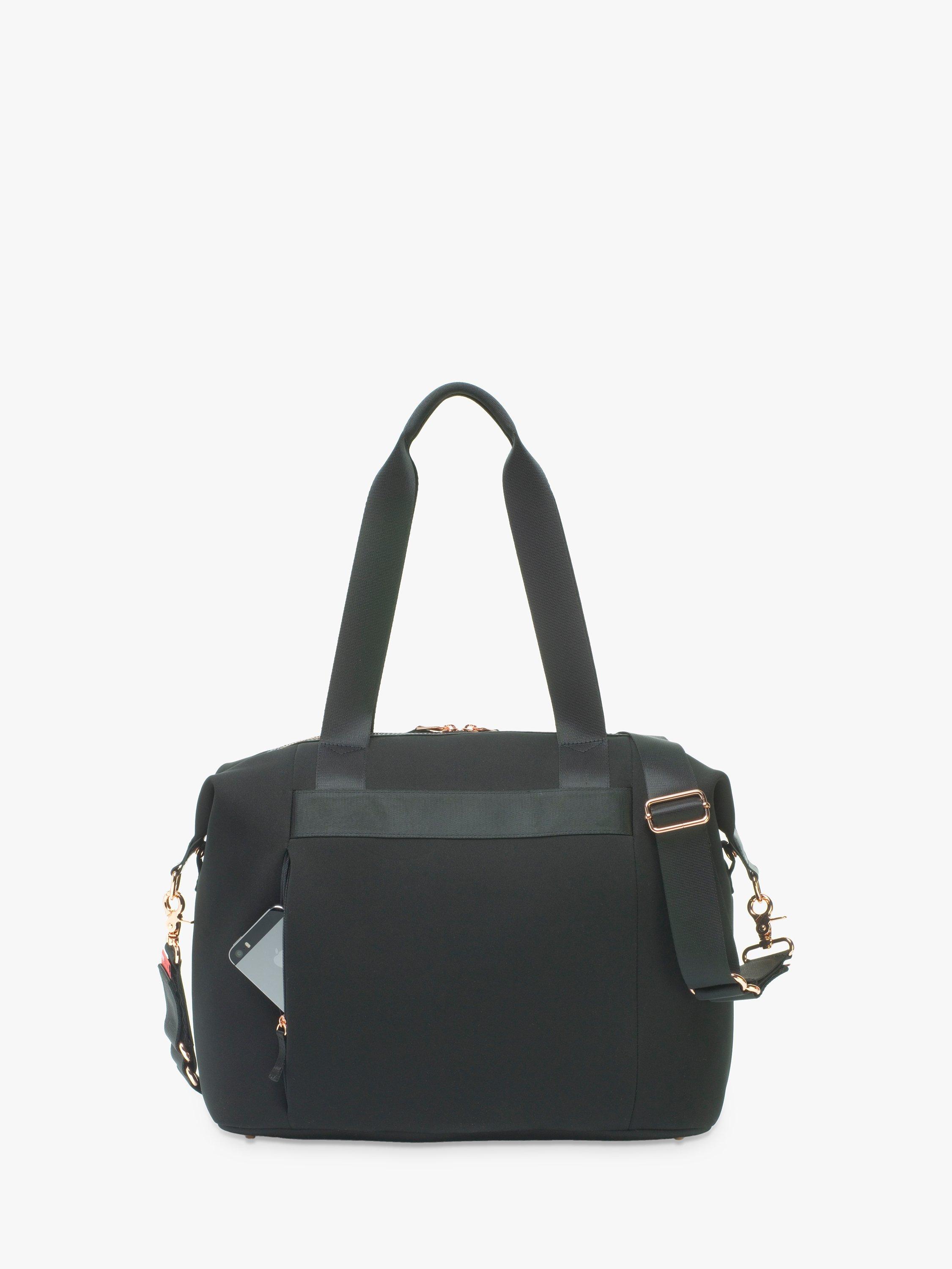 - Made from durable water-resistant scuba with premium real leather trim and rose gold hardware