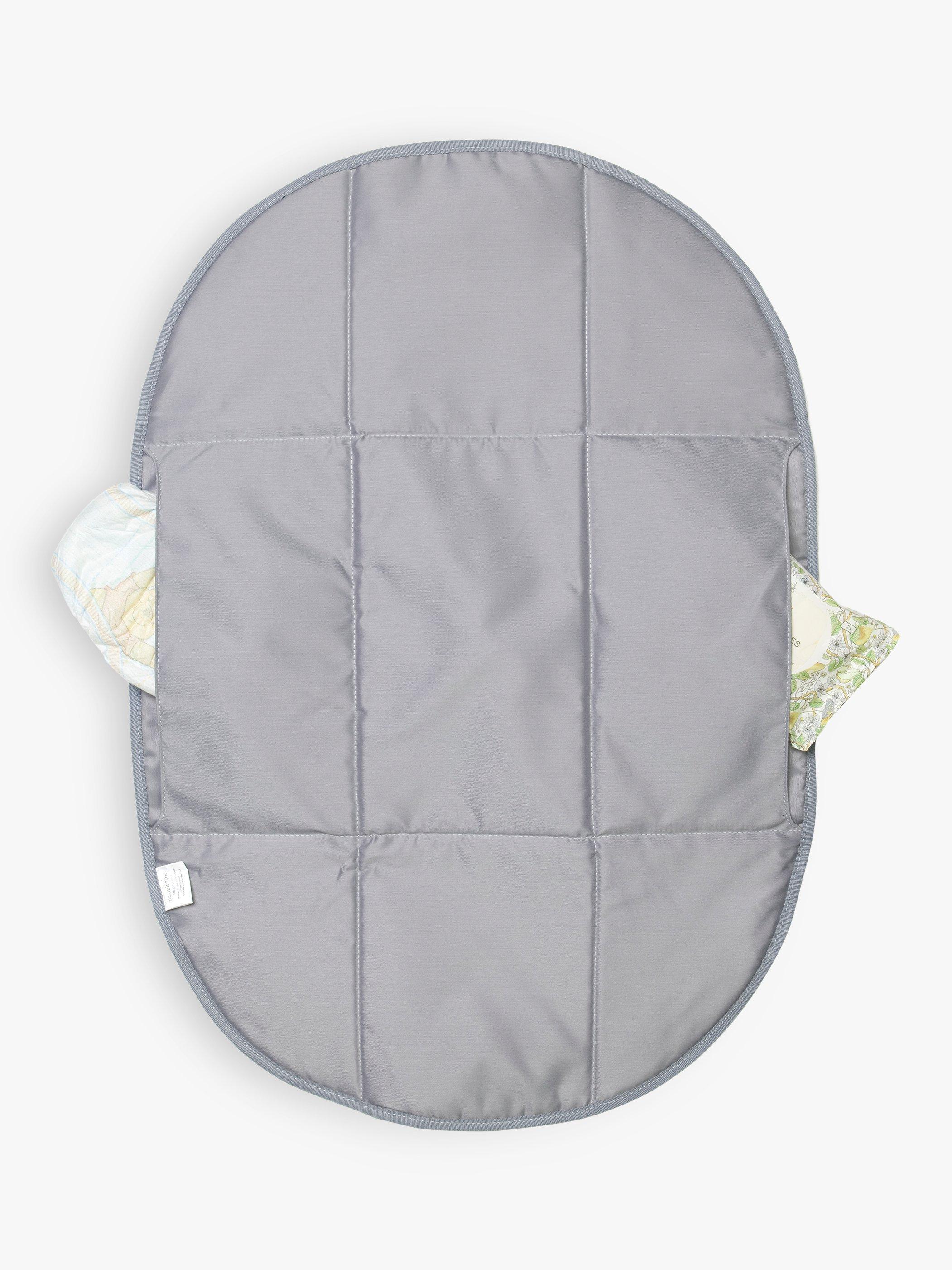 - Luxury oval machine-washable padded changing mat with grab handle and concealed pockets for nappies and wipes