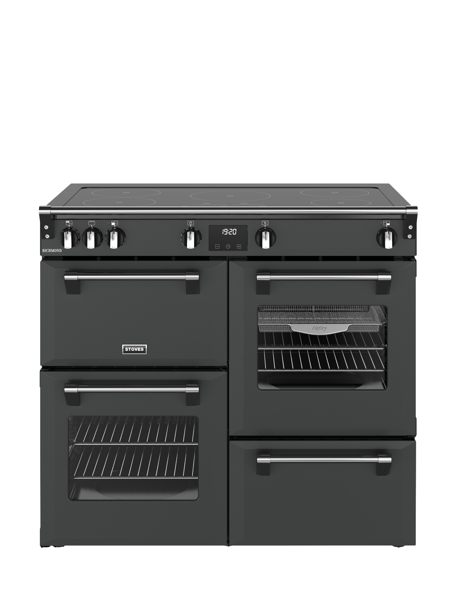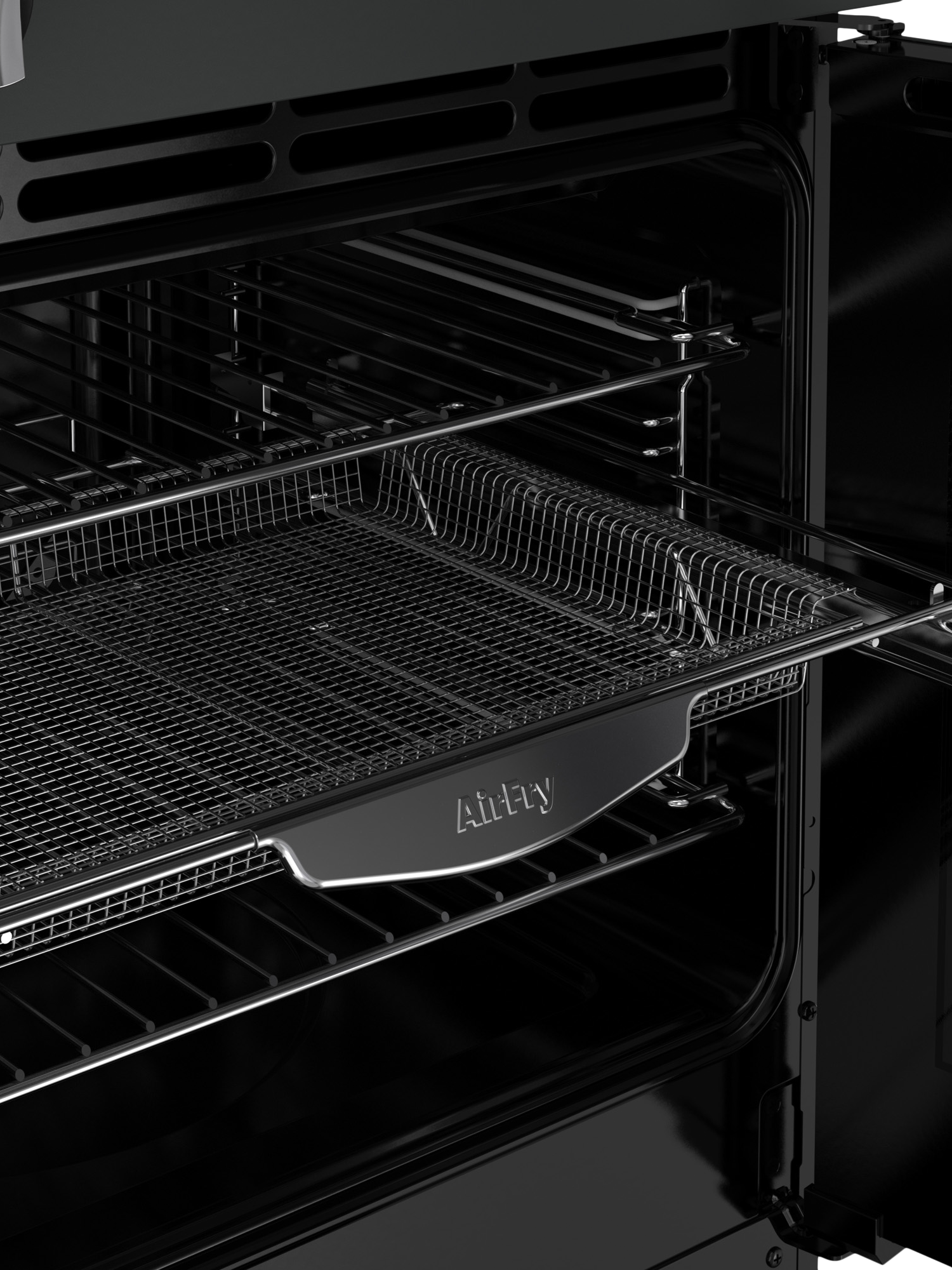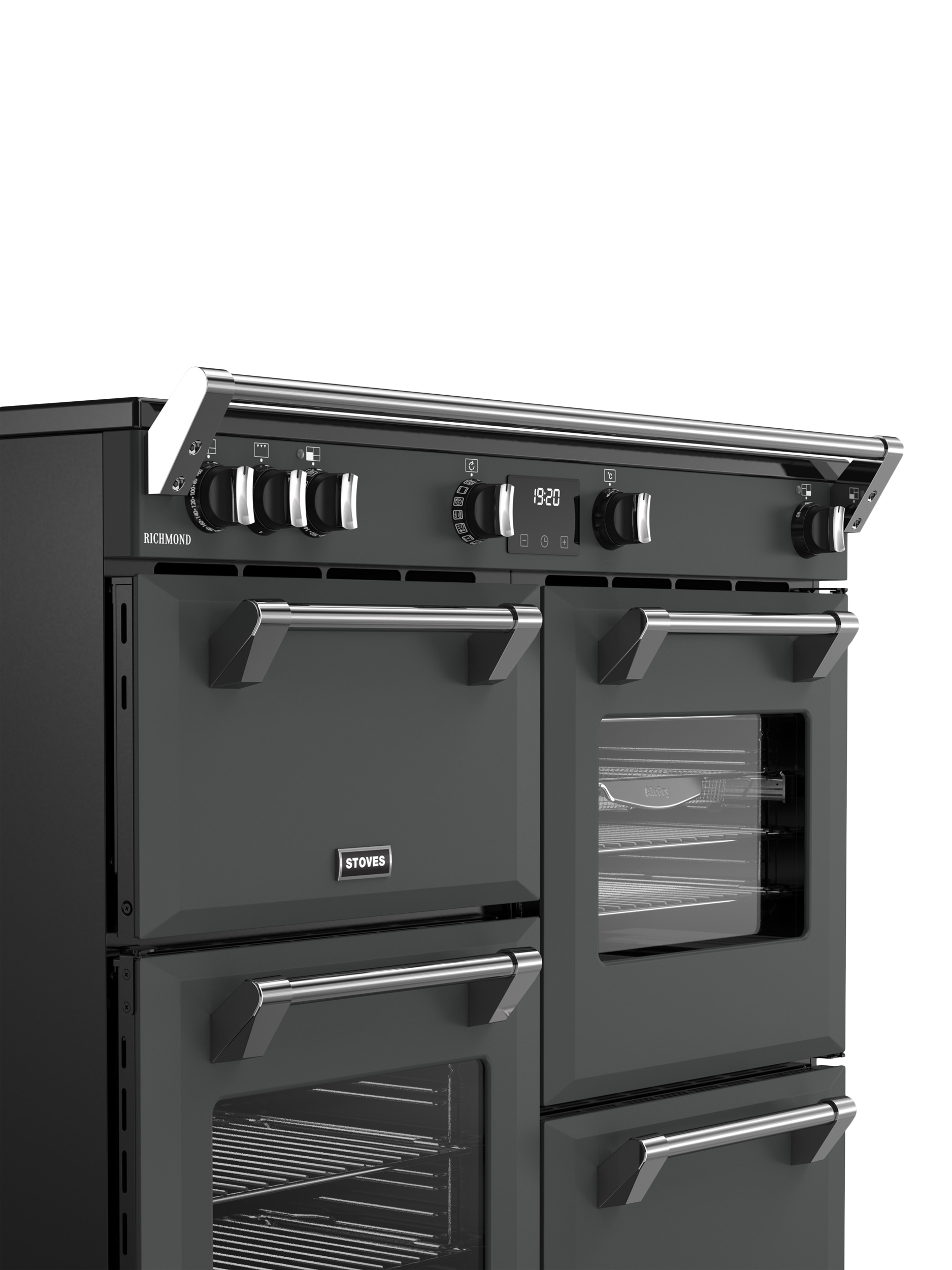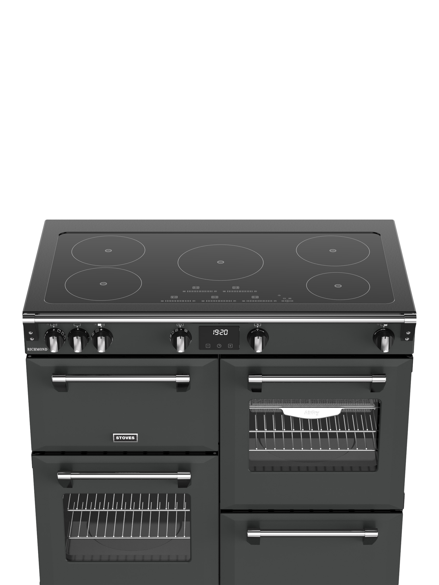 A contemporary take on a classic range cooker, this 100cm Stoves Richmond Electric Induction Range Cooker combines traditional reliability with a host of innovative features to help you get the best results. The unique Quad Oven™ is a Stoves exclusive that gives you 196 litres of cooking capacity across four ovens – including a dedicated Slow Cook Oven, conventional oven and Maxi-Grill™, Equiflow™ fanned oven, and multifunctional main oven with 13 different settings. This includes rapid pre-heat so you can get cooking sooner, and the AirFry function and tray – giving you that unbeatable crispness with little to no oil. Up on the hob, this electric model also features advanced induction technology, which heats the pan instead of the hob surface to make cooking safer, faster and more energy efficient. Each of the five induction zones is controlled by an intuitive touch control panel. Beyond the cooking capabilities, there’s a host of other features designed to help you get the best results, including the TrueTemp™ digital thermostat, Maxi-Clock™ programmer and SteamCleanse cleaning assistant. All this culinary potential comes in a slick, timeless design to bring some serious style to your kitchen.