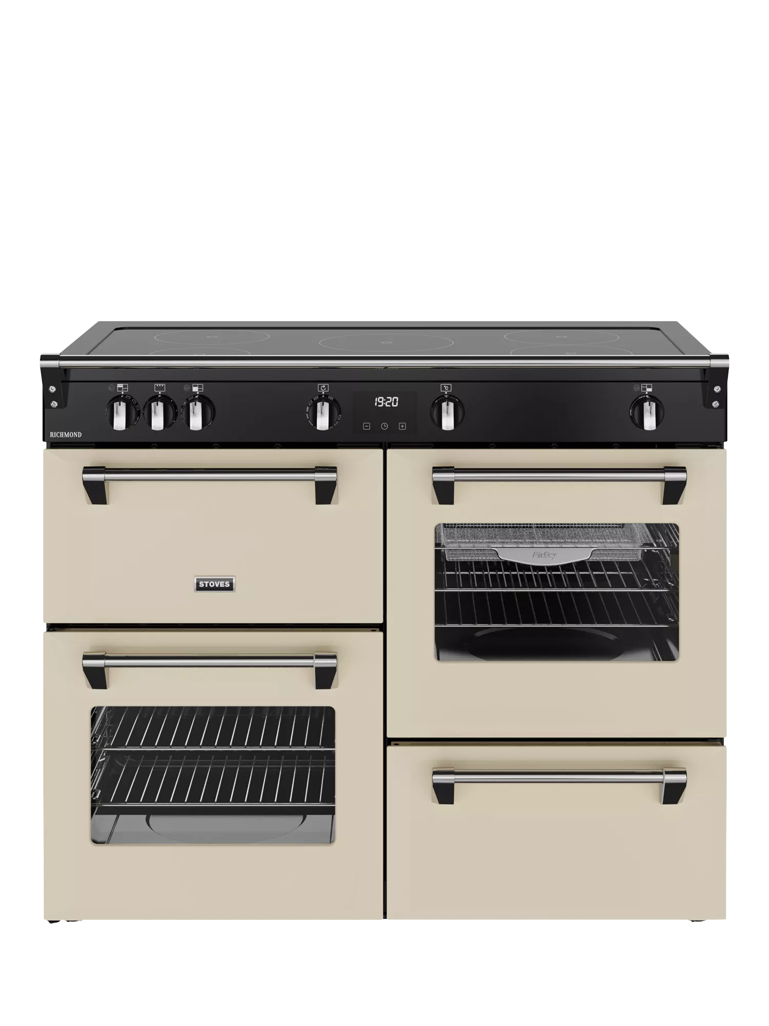 A contemporary take on a classic range cooker, this 110cm Richmond Electric Induction Range Cooker combines traditional-yet-modern styling with innovative features. The unique Quad Oven™ is a Stoves exclusive that gives you 196 litres of cooking capacity across four ovens – including a dedicated Slow Cook Oven, conventional oven and Maxi-Grill™, Equiflow™ fanned oven, and multifunctional main oven with 13 different settings. This includes rapid pre-heat and the AirFry function and tray – giving you that unbeatable crispness with little to no oil. The expansive hob features advanced induction technology, which heats the pan instead of the hob surface to make cooking safer, faster and more energy efficient. Each of the five induction zones is controlled by an intuitive touch control panel. Beyond the cooking capabilities, there’s a host of other features designed to help you get the best results, including the TrueTemp™ digital thermostat, Maxi-Clock™ programmer and SteamCleanse cleaning assistant. All this culinary potential comes in a slick, timeless design to bring some serious style to your kitchen.