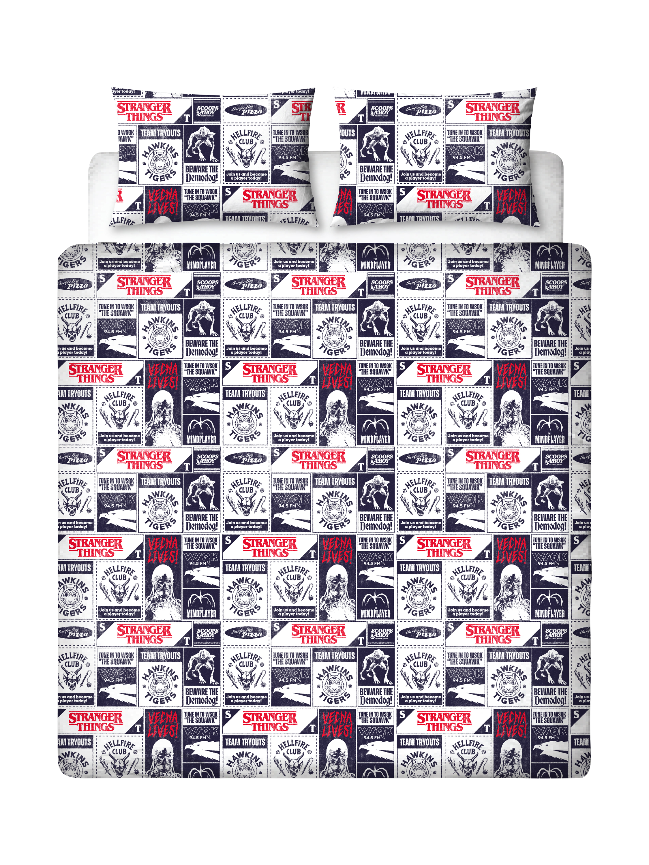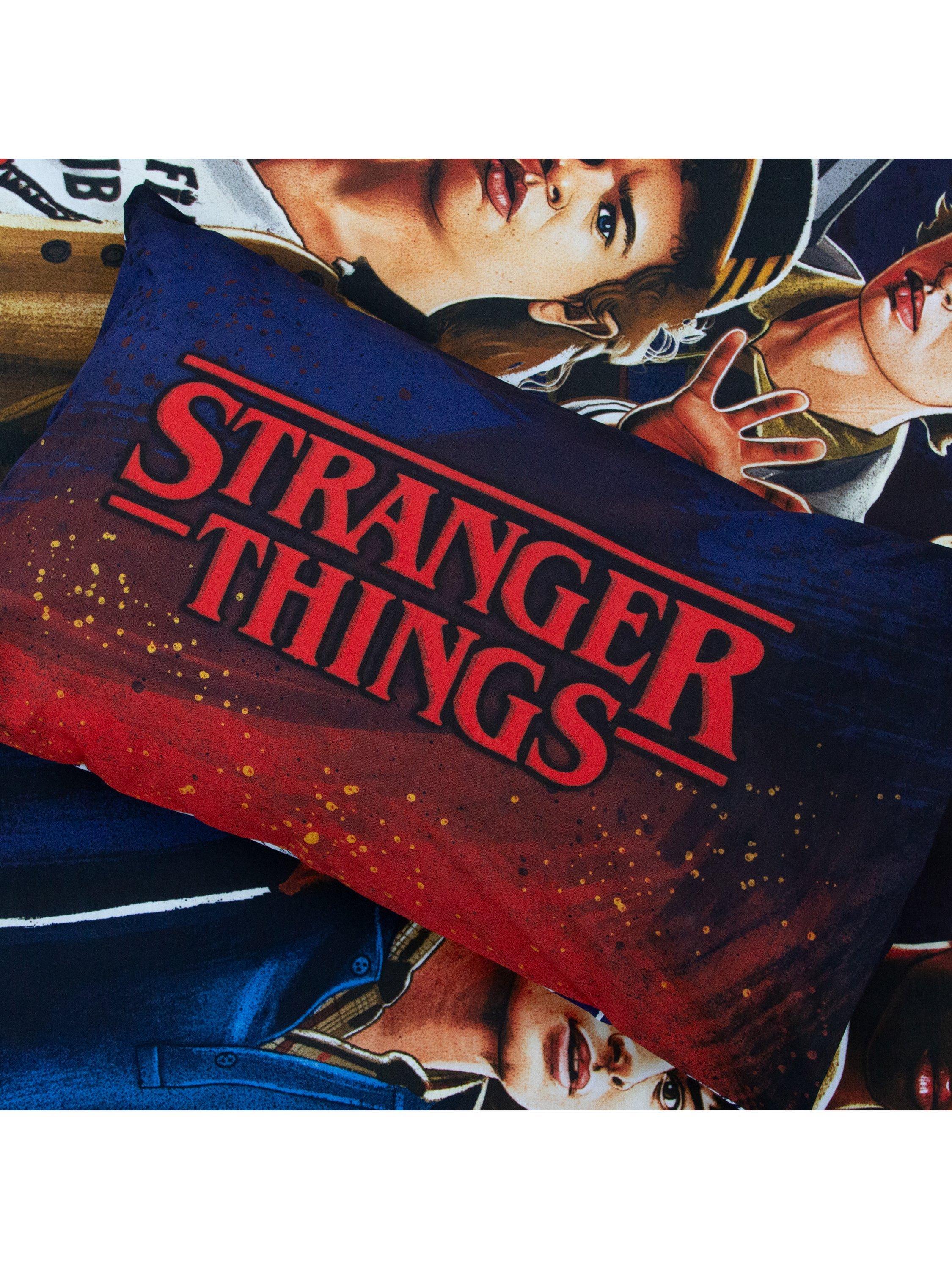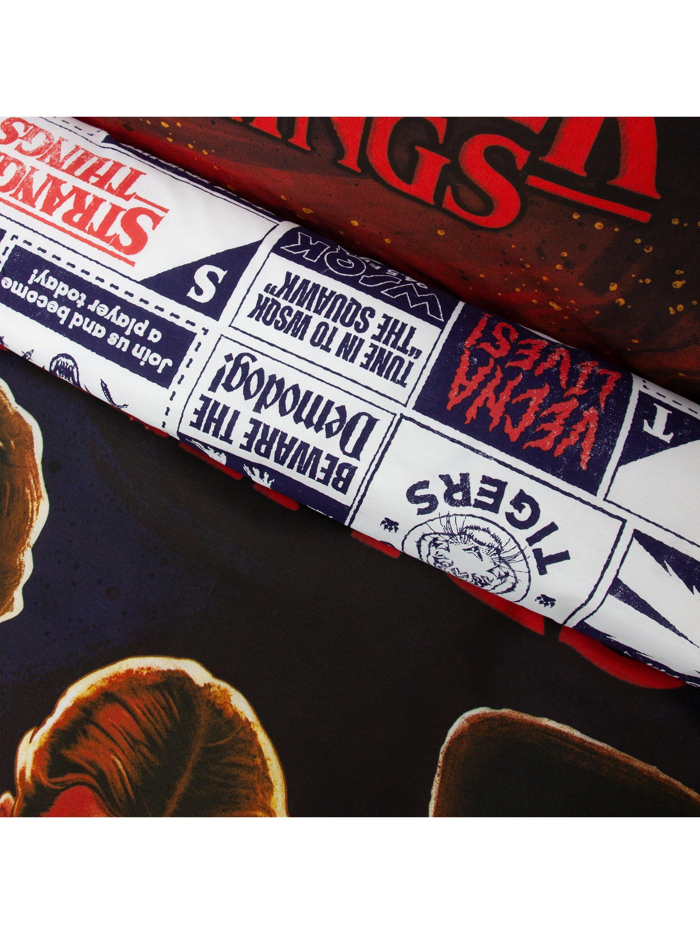 Officially licensed Stranger Things bedding. The front side features a large print of the Stranger Things cast, including Eleven, Dustin Henderson, Will Byers, Lucas Sinclair, and Mike Wheeler, with the Stranger Things logo in red, and a matching side to the pillowcases. The reverse side features a repeating pattern of posters and flyers for the Hellfire Club, WSQK Radio, Scoops Ahoy, and the Mindflayer, with a matching side to both pillowcases. Made from a polycotton mix with popper closing.