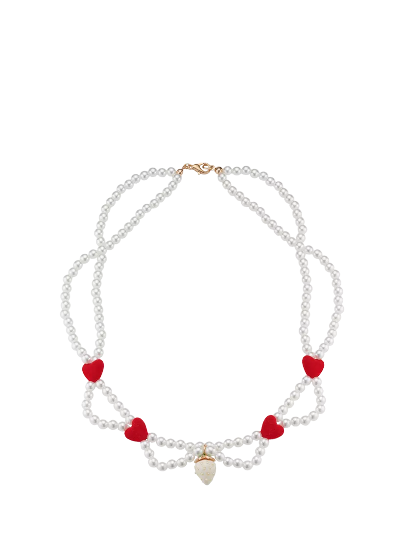 Beaded pearly necklace with red flocked heart heads and a strawberry charm.