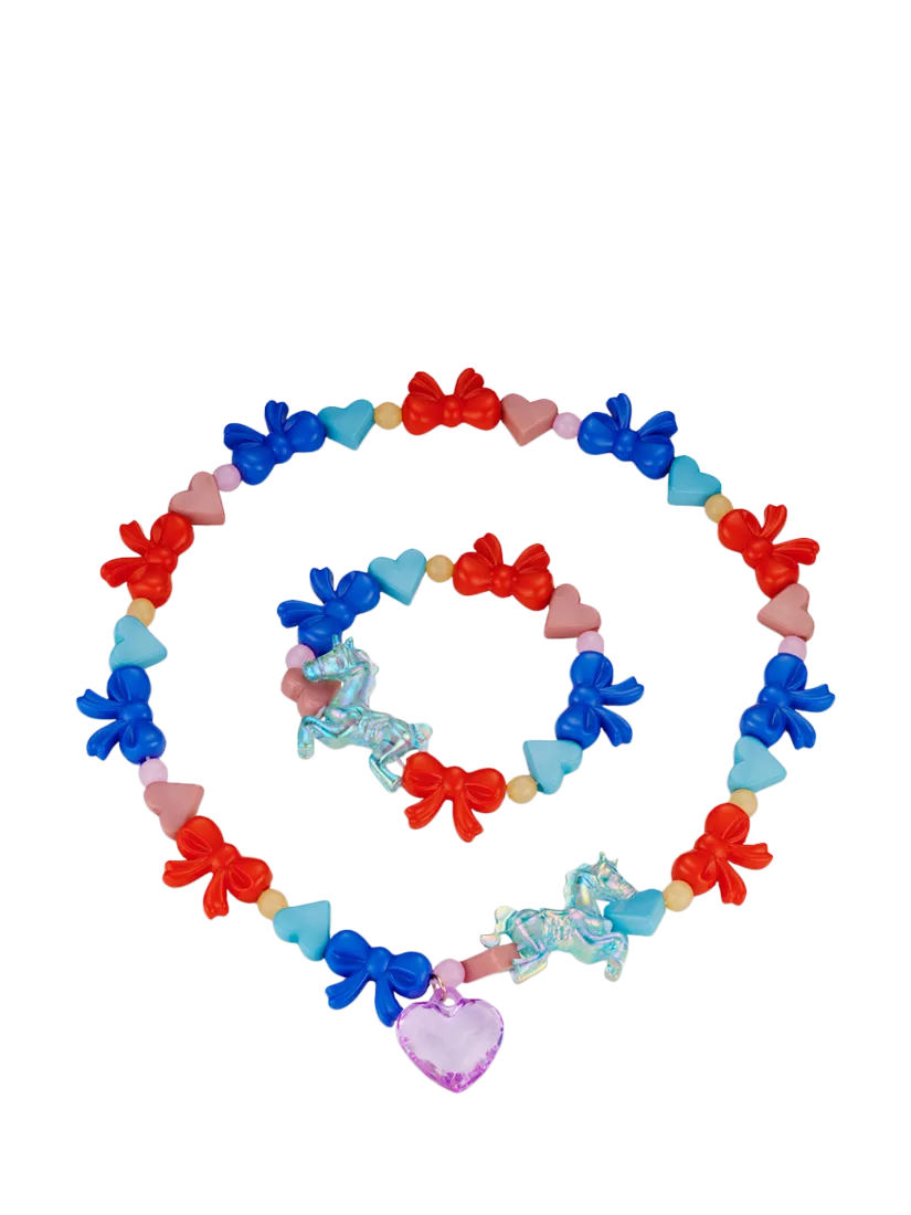 Adorned with colourful bow and heart beads, this necklace and bracelet set features adorable unicorn charms, ideal for brightening up any adventure.