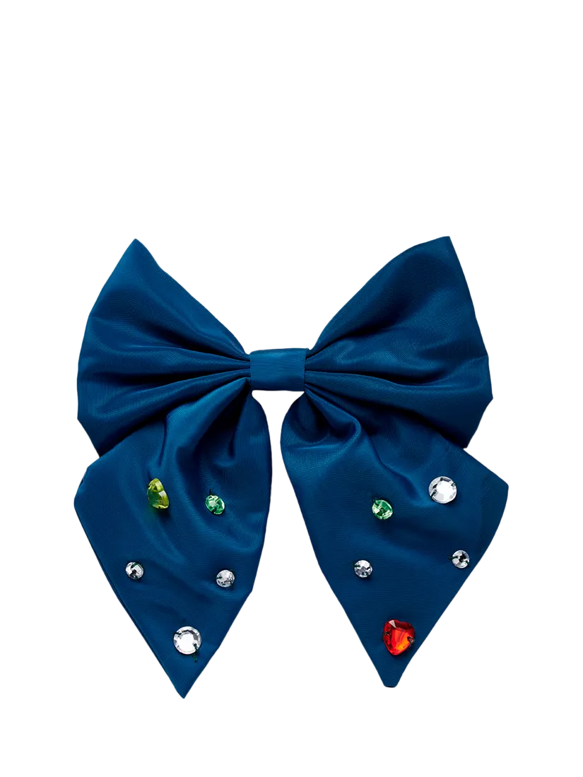 Finish off her outfit with this statement bow hair clip. Colourful gem embellishments add some sparkle.