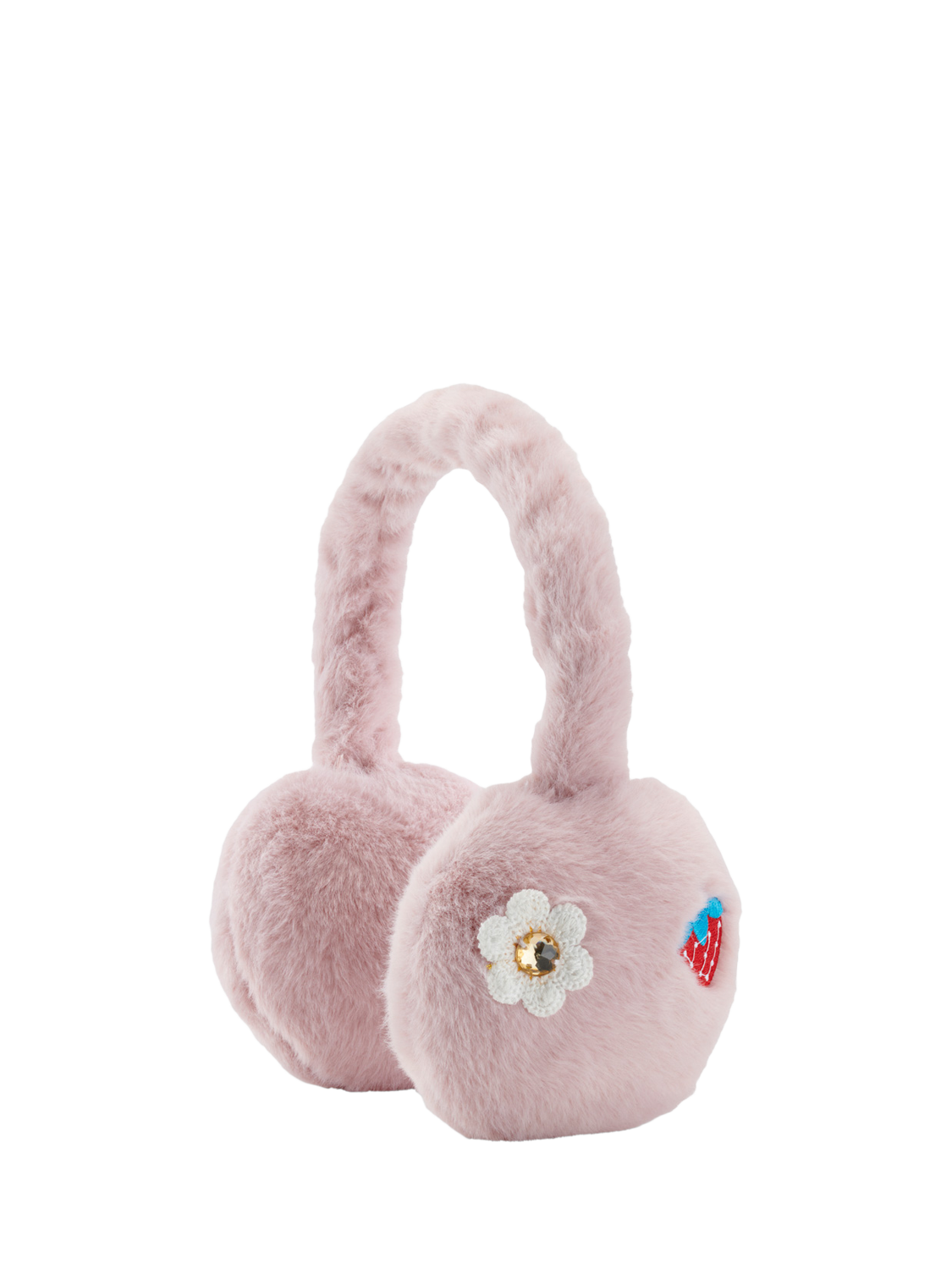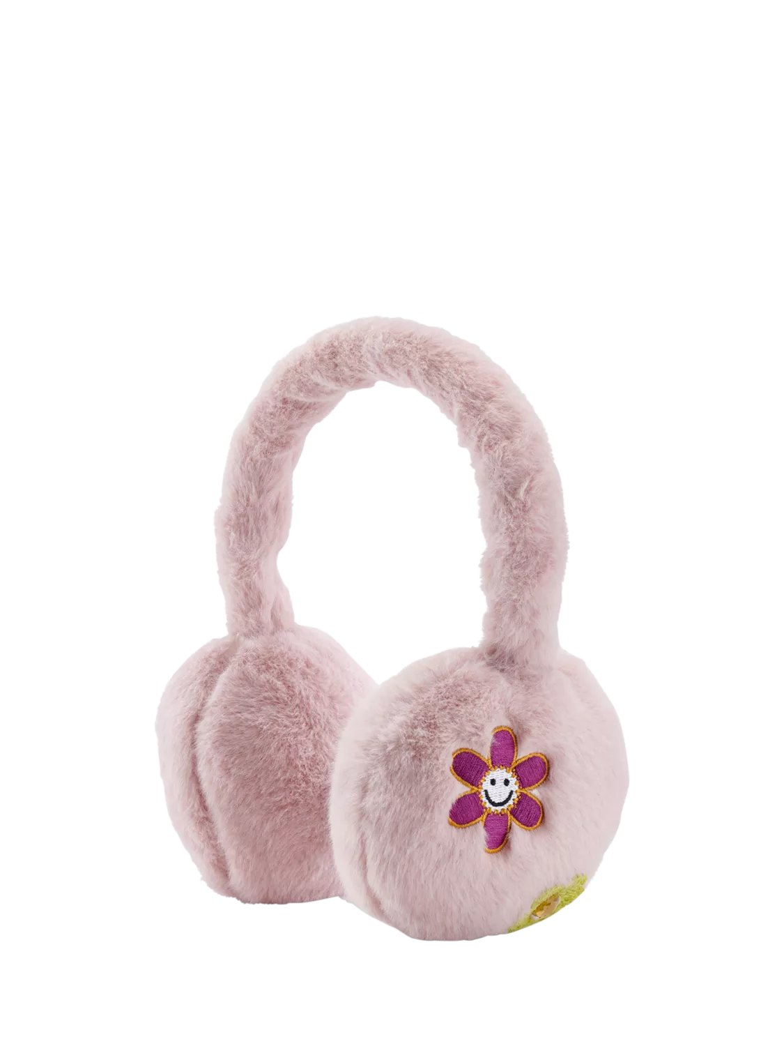 Faux fur pink earmuffs with Stych heritage embroidered patches.