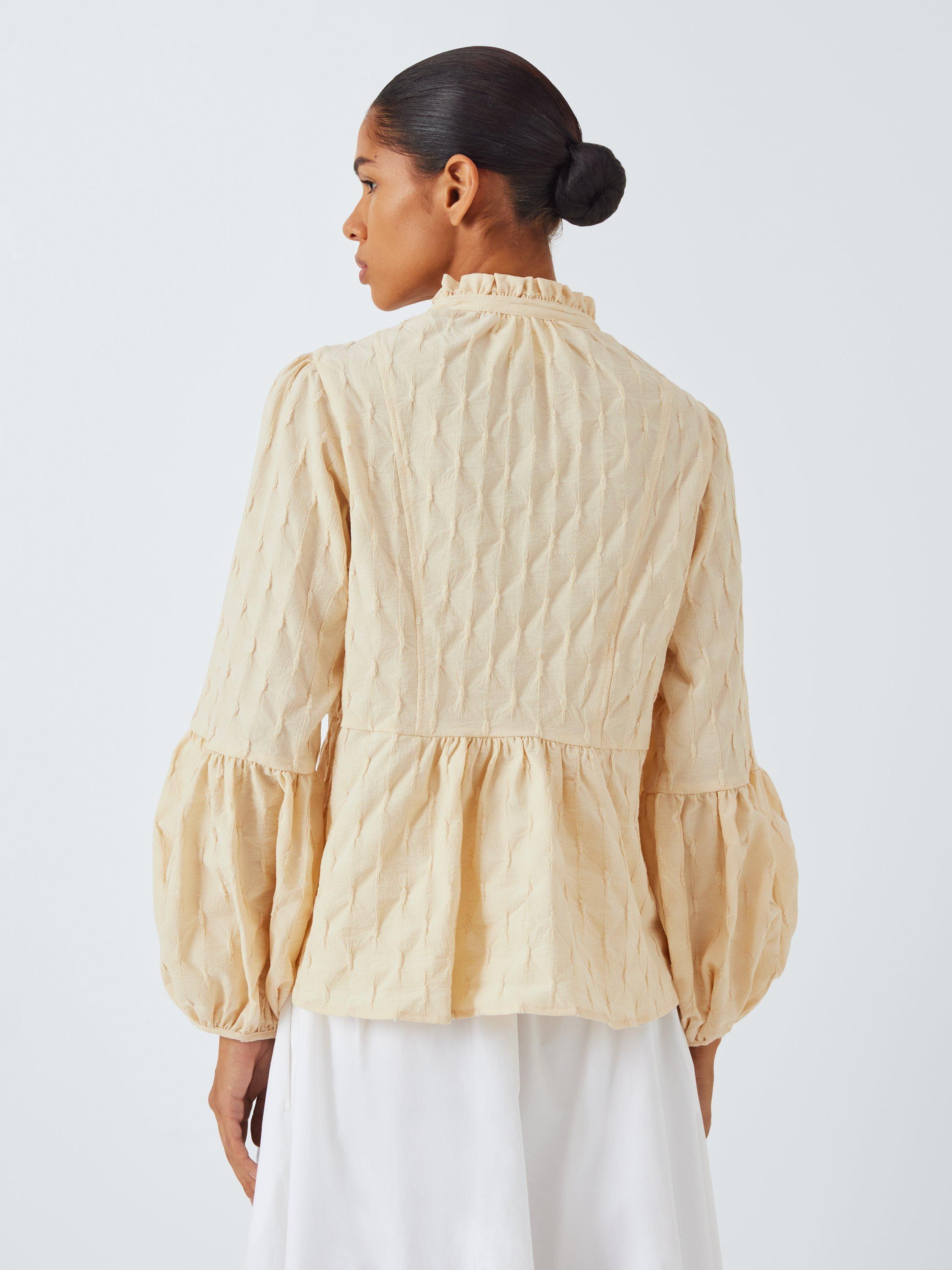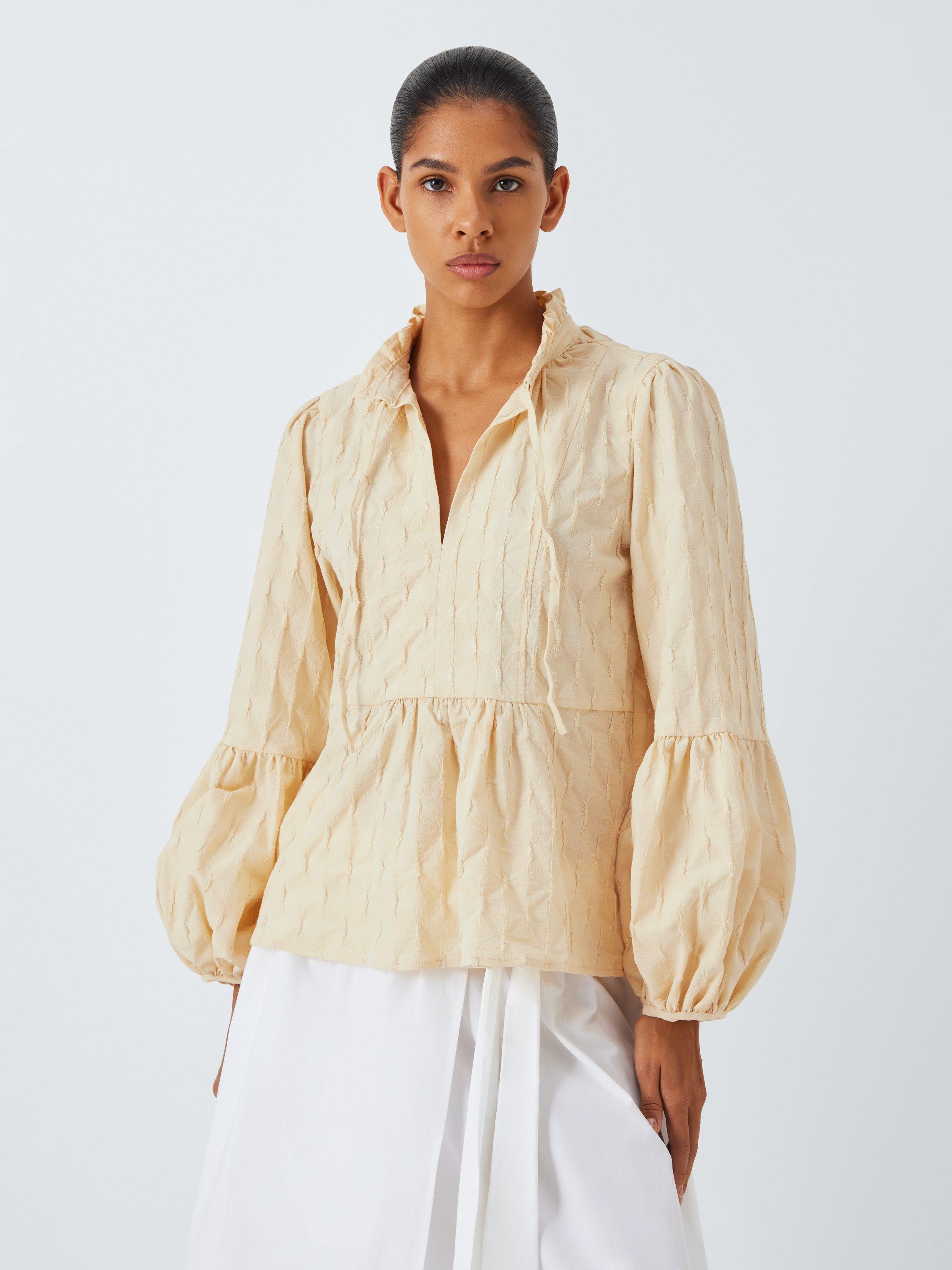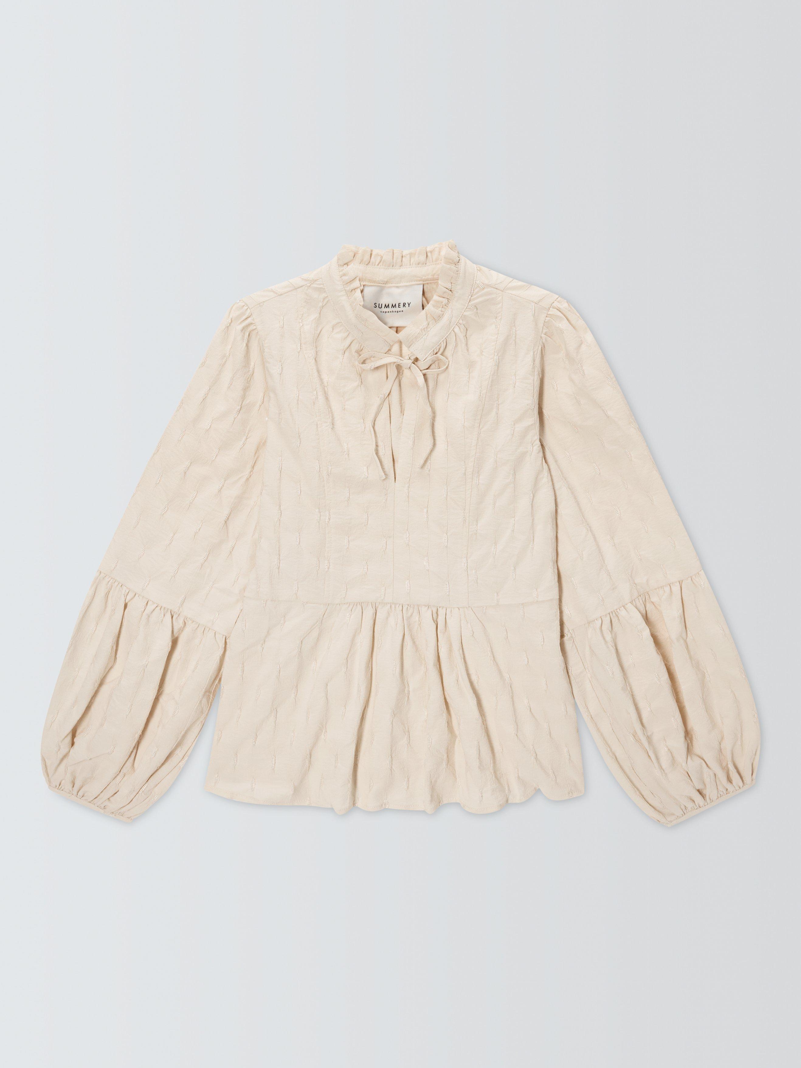 The Klara Blouse features an O-neck with tie strings at front and a slit. The sleeves are puffed with extra width from the elbows to the wrist.