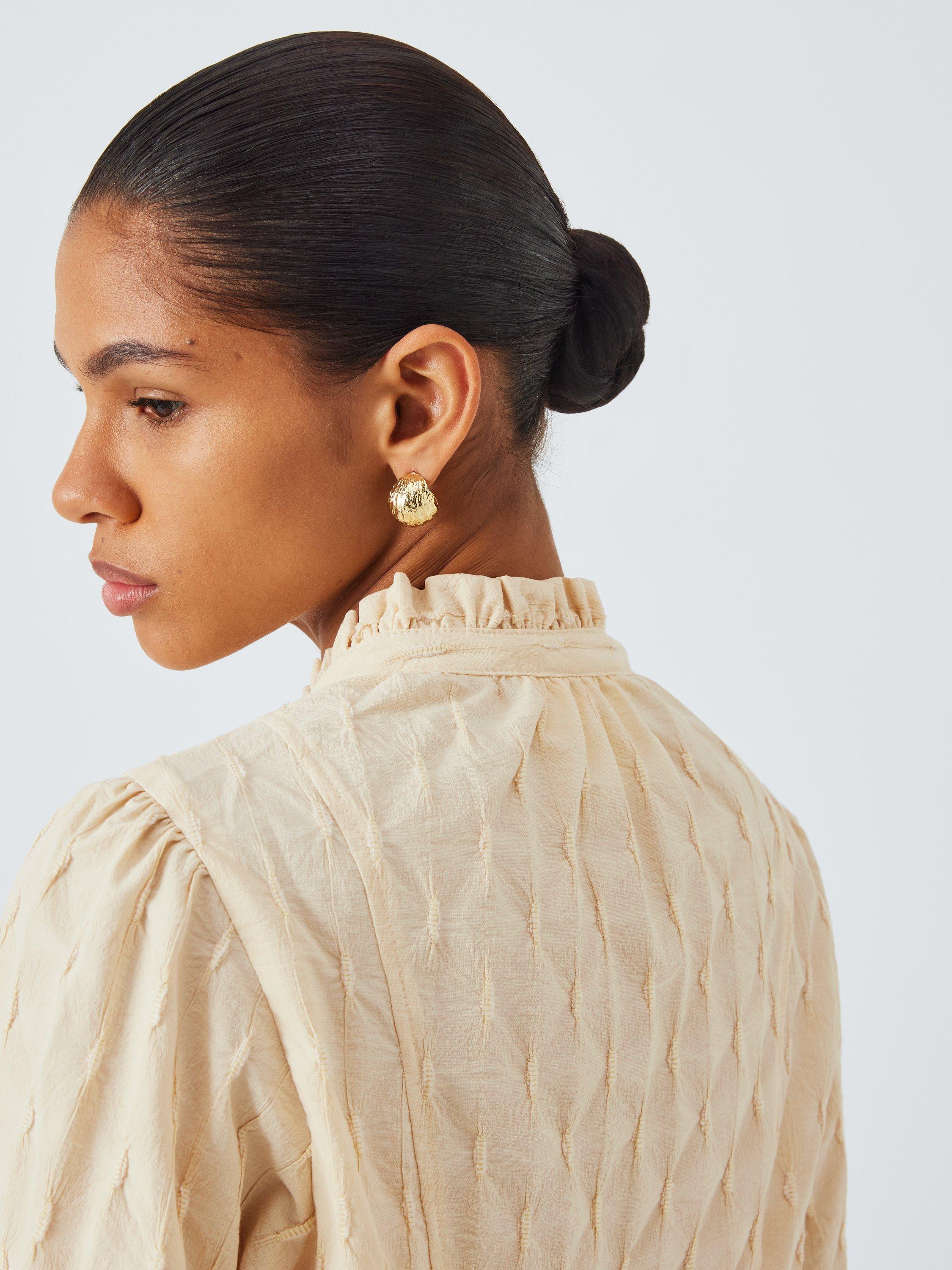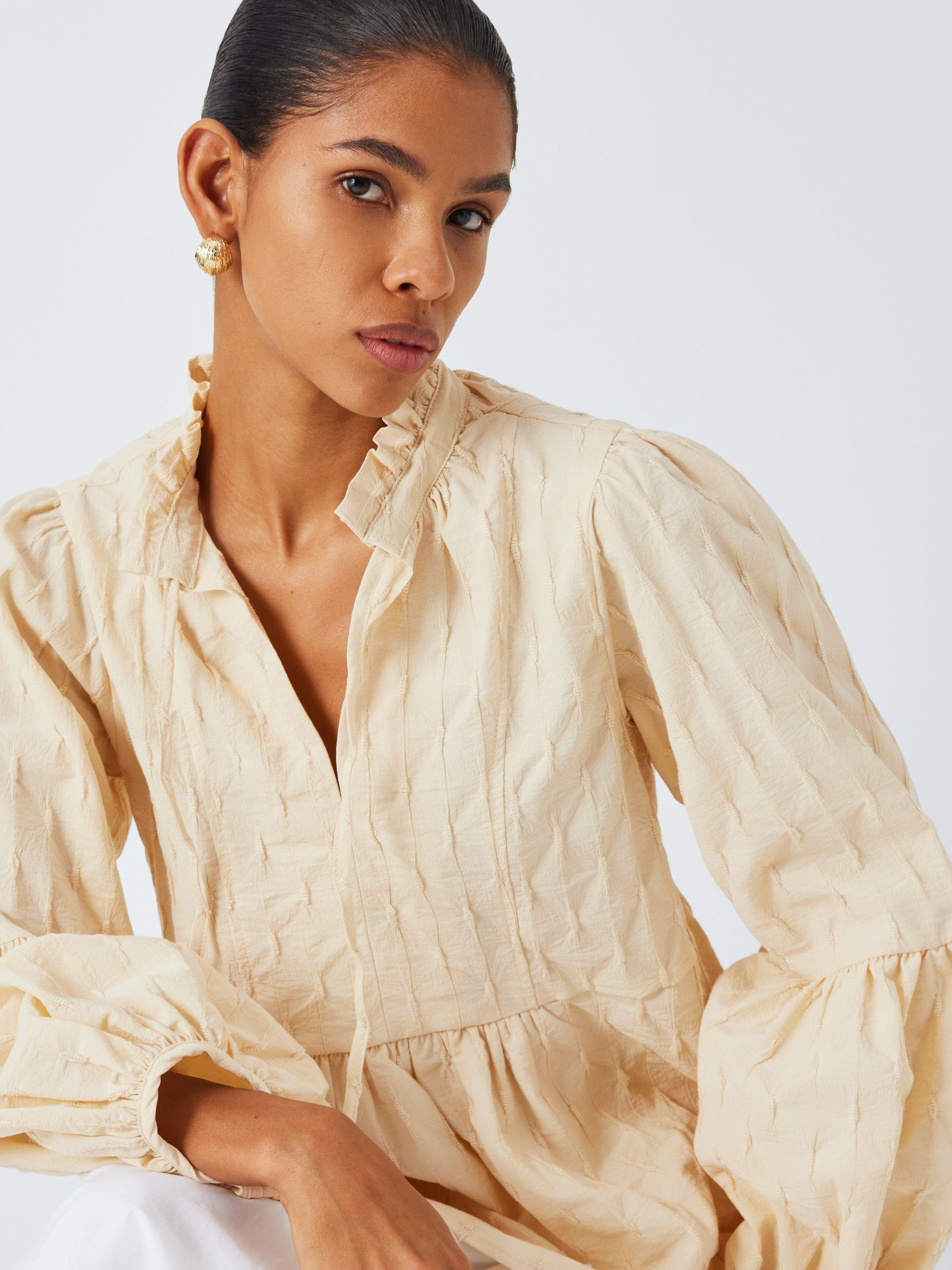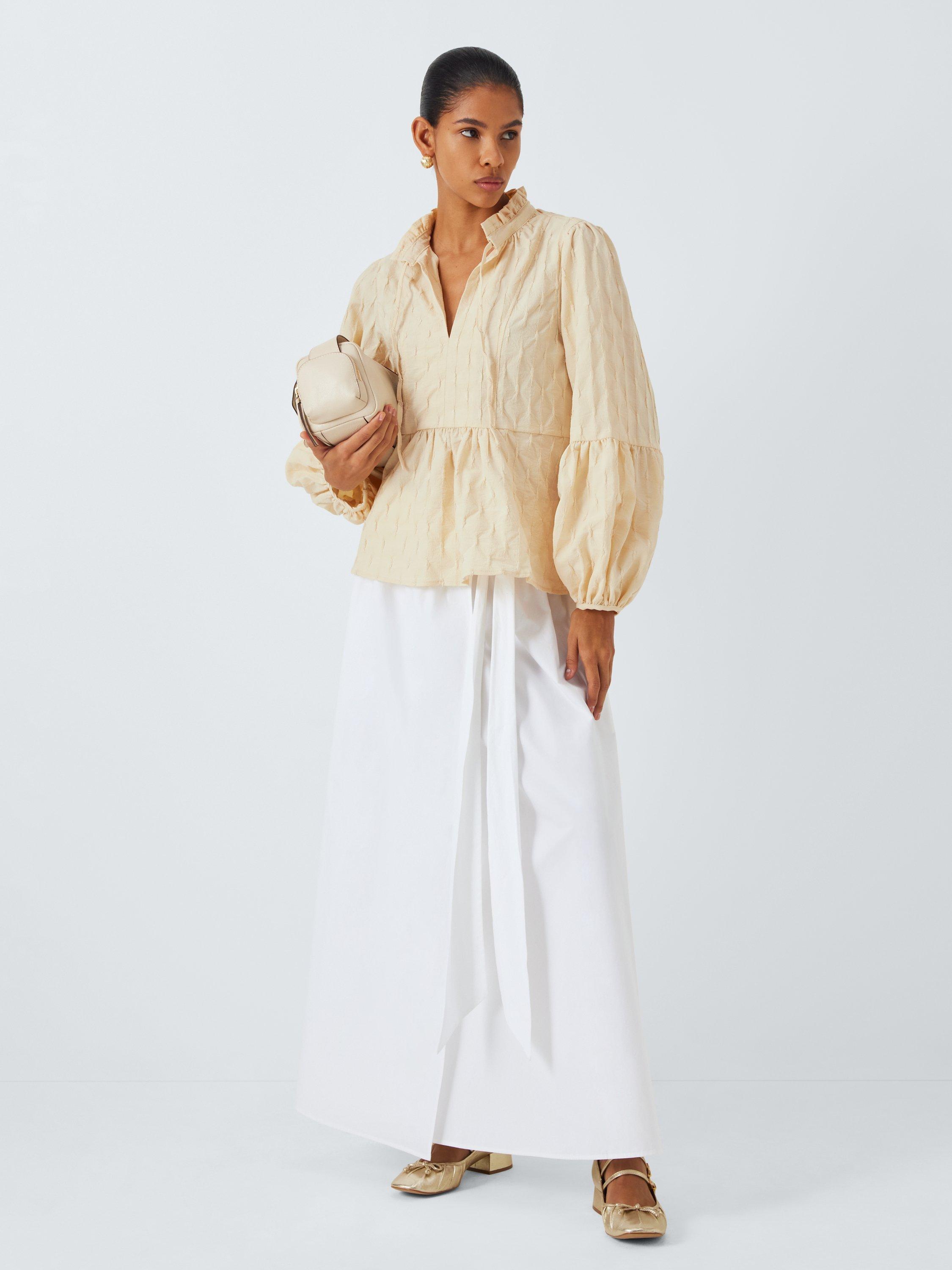 The Klara Blouse features an O-neck with tie strings at front and a slit. The sleeves are puffed with extra width from the elbows to the wrist.