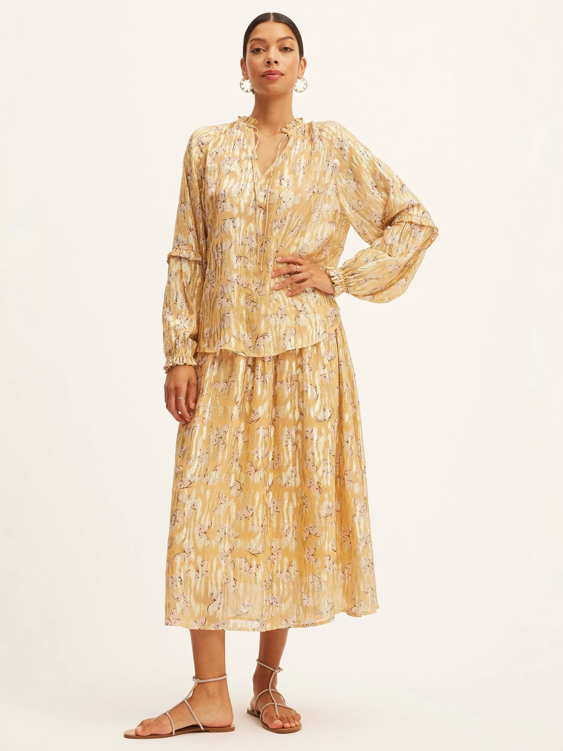 The Noor Blouse features an O-neck with a slit and tie strings at front. It has ruffles at neck, elbows and cuffs. Fabric is see-through.,/p>