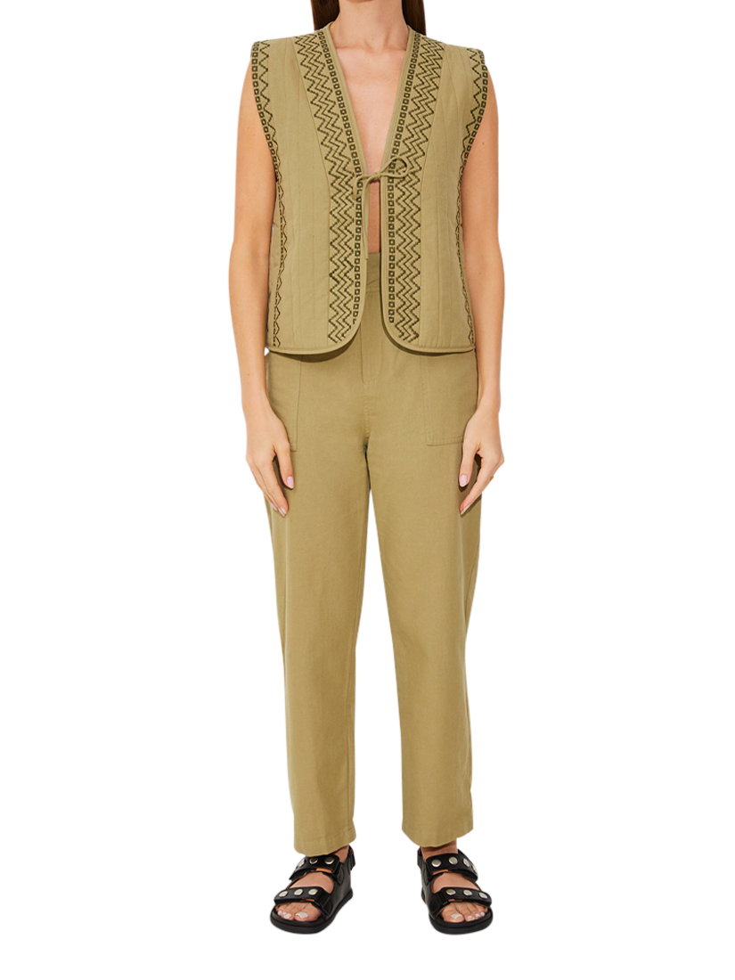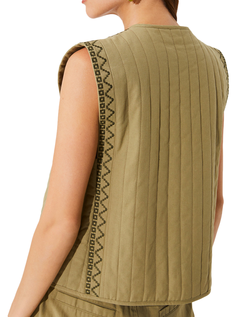 Sleeveless lightly padded jacket with embroidered patterning and a simple drawstring to tie at the front. Made of a lightweight cotton and linen blend, ideal for warmer months.
