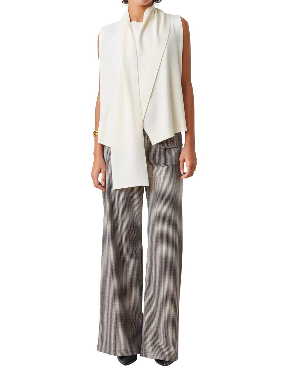 Check-patterned trousers with a chic wide leg. They're given a contemporary twist with fabric-covered buttoned flap pockets on the front, complementing the simple welt pockets at the back.