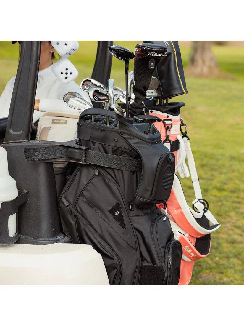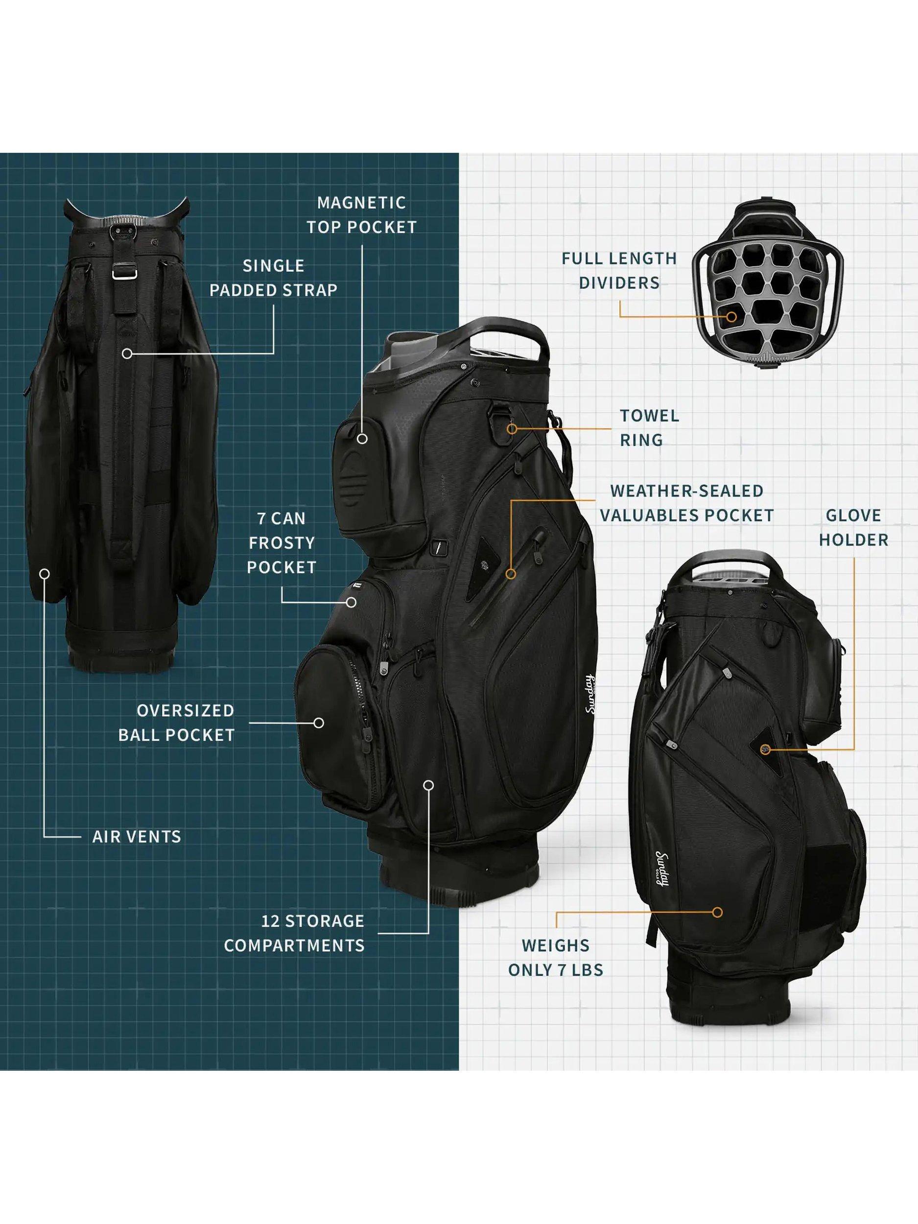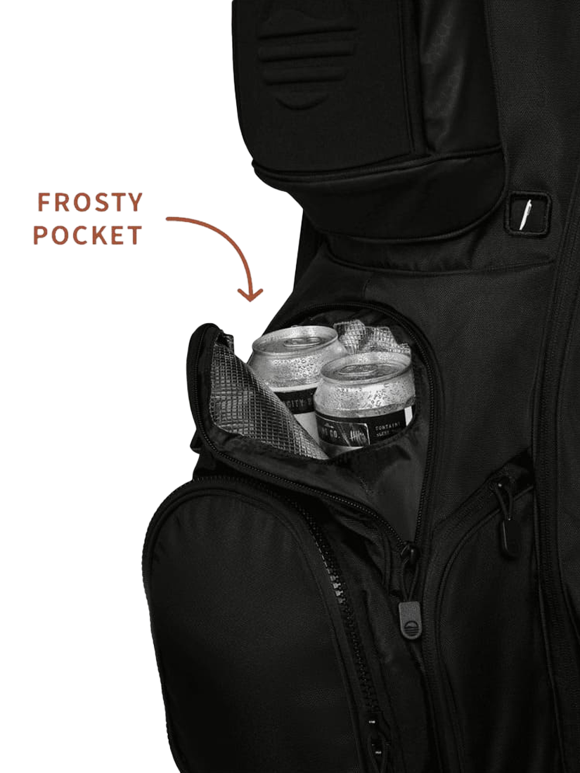 - Frosty Pocket drinks holder x 1, Oversized ball pocket x1, Storage compartments x12, Weather sealed valuables pocket x1, Towel ring x1, Magnet top pocket x1, Glove holder x1