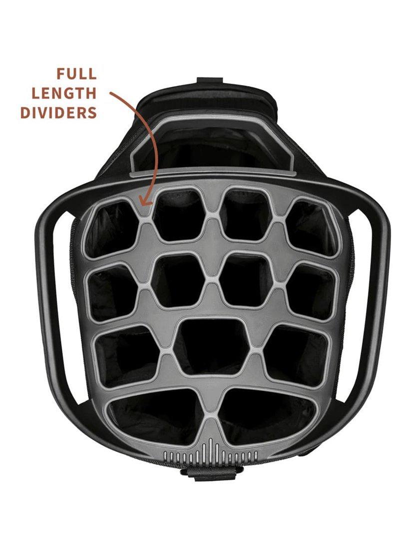 Designed for golfers who demand maximum storage, superior club organisation, and lightweight performance. Weighing just 3.2kg, the Big Rig Golf Bag is lighter than most cart bags without sacrificing durability or style. With a 14-way top divider, your clubs stay protected and easy to access, while 12 spacious pockets give you dedicated space for all your gear. The included water-resistant rain cover ensures your clubs stay dry, even when the weather turns. Perfect for use with a trolley or buggy, the Big Rig features a stable flat base for a secure fit, plus a padded single shoulder strap for easy lifting and carrying.